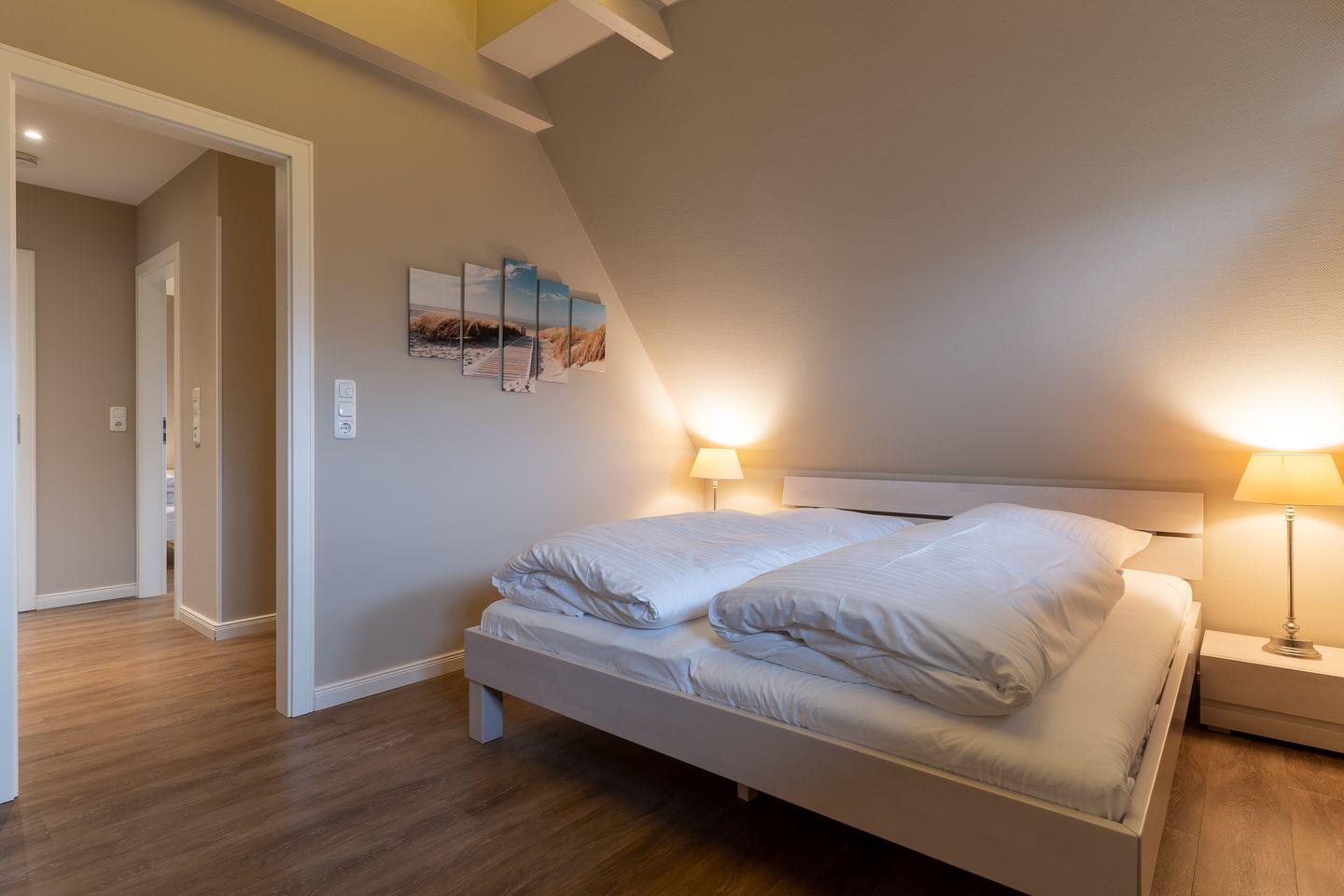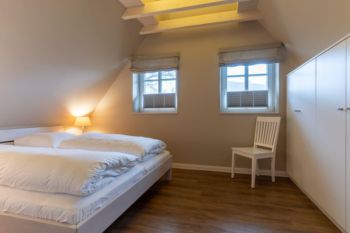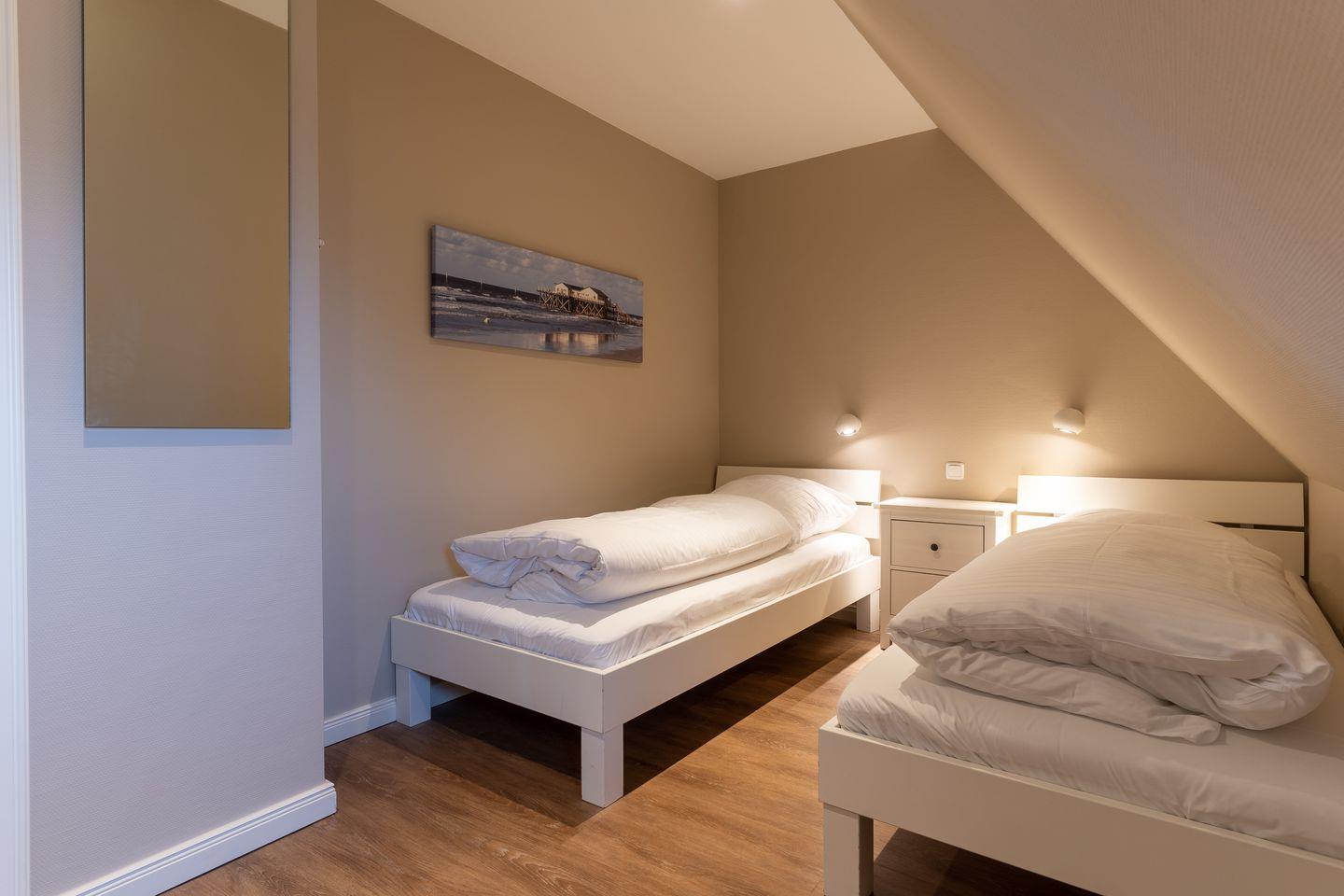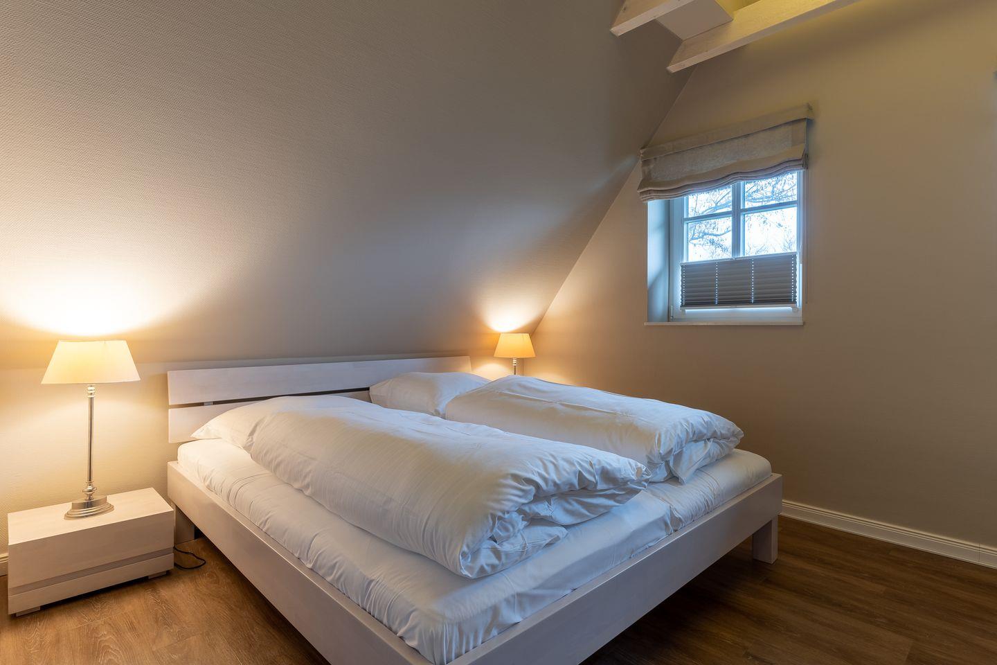 Im Erdgeschoss befindet sich der Wohnraum mit einer offenen Küche und einem gemütlichen Essbereich. Die Küche ist voll ausgestattet mit hochwertigen Geräten. Im Erdgeschoss ist ebenso ein großer Flur mit Garderobe, ein Duschbad und ein Chill-Out-Room mit TV. Wunderbarer Rückzugsort zum Lesen, TV schauen, Spielen oder Chillen. Das Sofa kann zu einem gemütlichen Schlafbett für 2 Personen umgebaut werden. Über eine Holztreppe im Flur gelangt man in das Obergeschoss mit zwei Schlafzimmern. Eines verfügt über ein 180er Bett mit TV und das andere über 2 x 90er Einzelbetten mit hochwertigen Matratzen (diese können auch zusammengeschoben werden). Außerdem ist im Obergeschoss ein Bad mit Badewanne. Beide Bäder verfügen über ein Fenster.