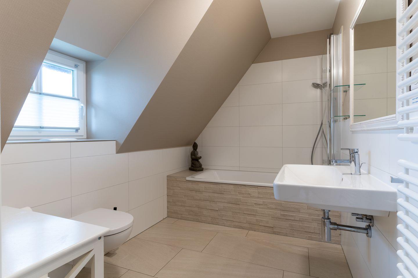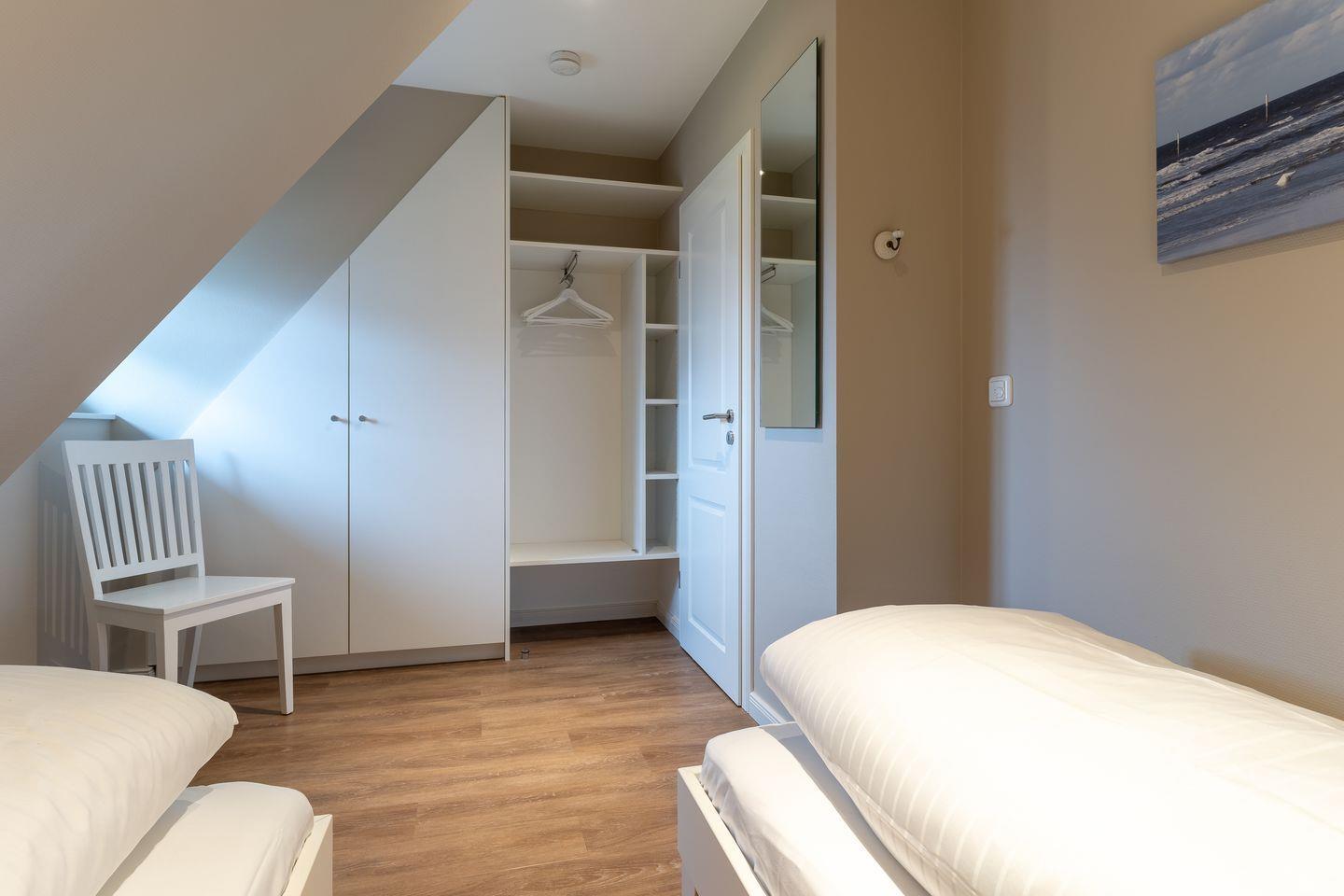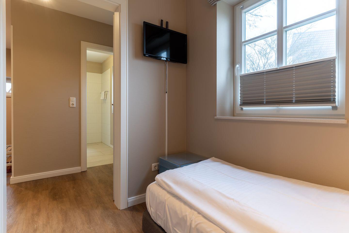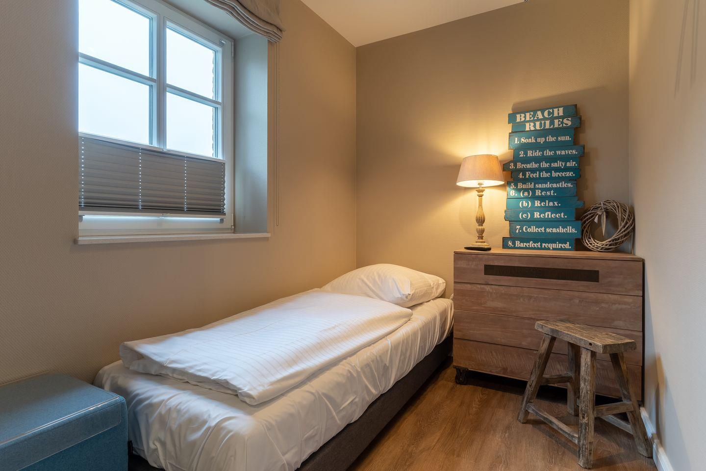 Im Erdgeschoss befindet sich der Wohnraum mit einer offenen Küche und einem gemütlichen Essbereich. Die Küche ist voll ausgestattet mit hochwertigen Geräten. Im Erdgeschoss ist ebenso ein großer Flur mit Garderobe, ein Duschbad und ein Chill-Out-Room mit TV. Wunderbarer Rückzugsort zum Lesen, TV schauen, Spielen oder Chillen. Das Sofa kann zu einem gemütlichen Schlafbett für 2 Personen umgebaut werden. Über eine Holztreppe im Flur gelangt man in das Obergeschoss mit zwei Schlafzimmern. Eines verfügt über ein 180er Bett mit TV und das andere über 2 x 90er Einzelbetten mit hochwertigen Matratzen (diese können auch zusammengeschoben werden). Außerdem ist im Obergeschoss ein Bad mit Badewanne. Beide Bäder verfügen über ein Fenster.