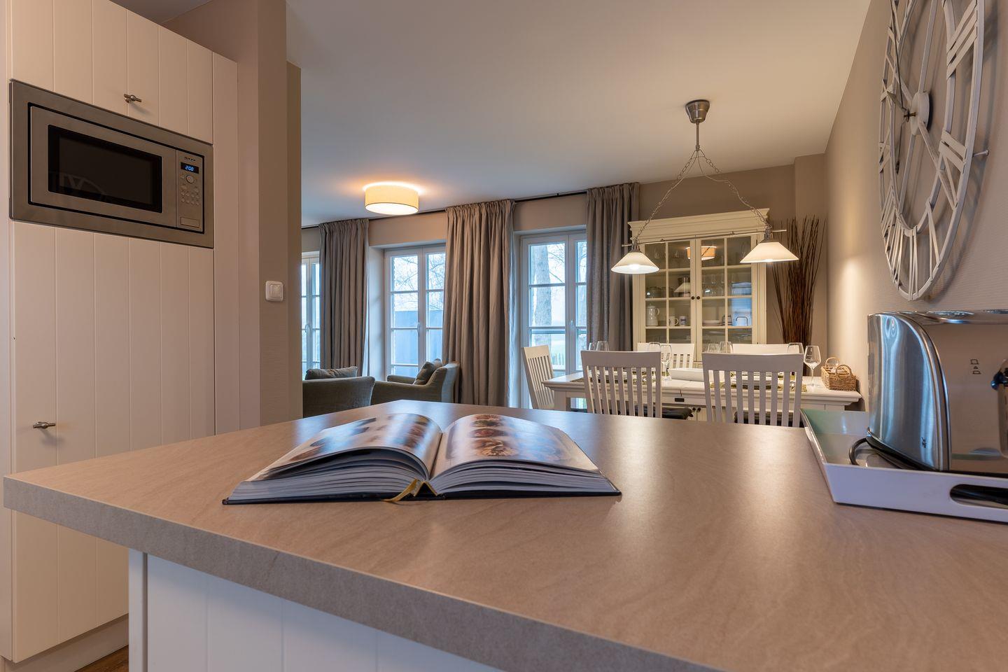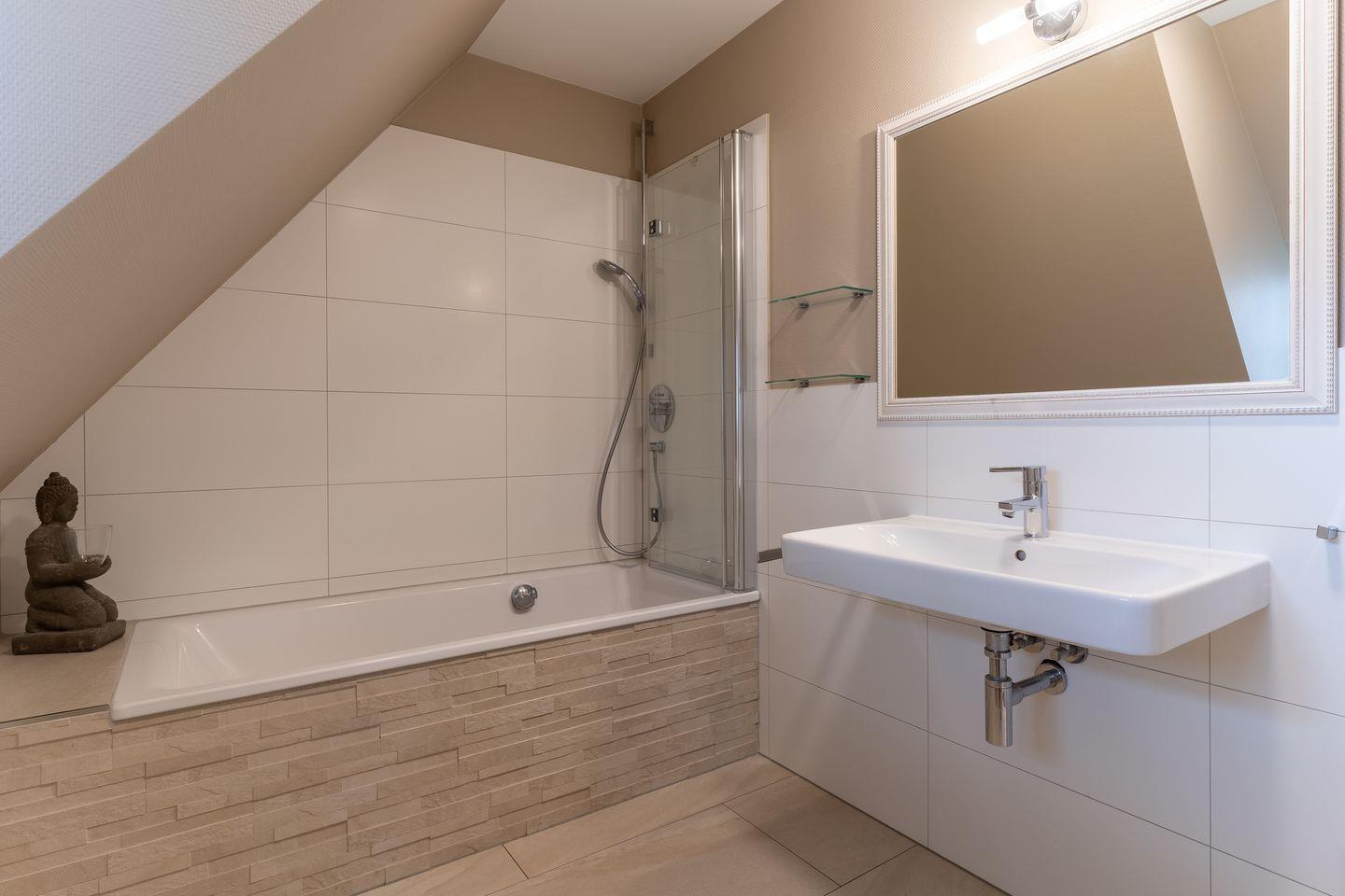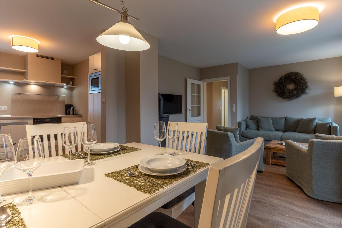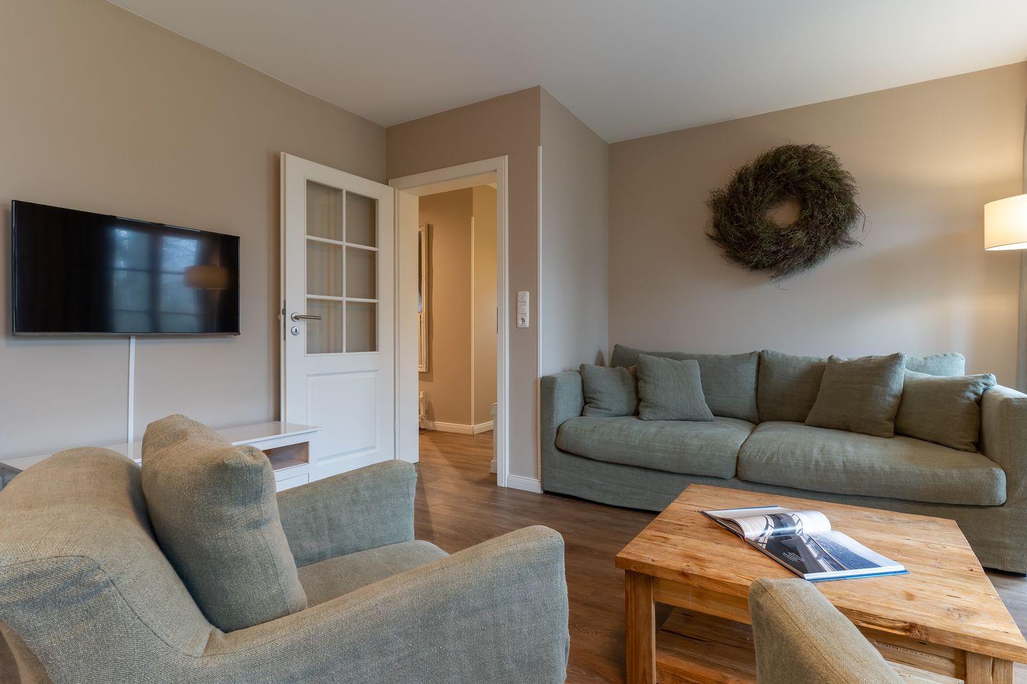 Im Erdgeschoss befindet sich der Wohnraum mit einer offenen Küche und einem gemütlichen Essbereich. Die Küche ist voll ausgestattet mit hochwertigen Geräten. Im Erdgeschoss ist ebenso ein großer Flur mit Garderobe, ein Duschbad und ein Chill-Out-Room mit TV. Wunderbarer Rückzugsort zum Lesen, TV schauen, Spielen oder Chillen. Das Sofa kann zu einem gemütlichen Schlafbett für 2 Personen umgebaut werden. Über eine Holztreppe im Flur gelangt man in das Obergeschoss mit zwei Schlafzimmern. Eines verfügt über ein 180er Bett mit TV und das andere über 2 x 90er Einzelbetten mit hochwertigen Matratzen (diese können auch zusammengeschoben werden). Außerdem ist im Obergeschoss ein Bad mit Badewanne. Beide Bäder verfügen über ein Fenster.