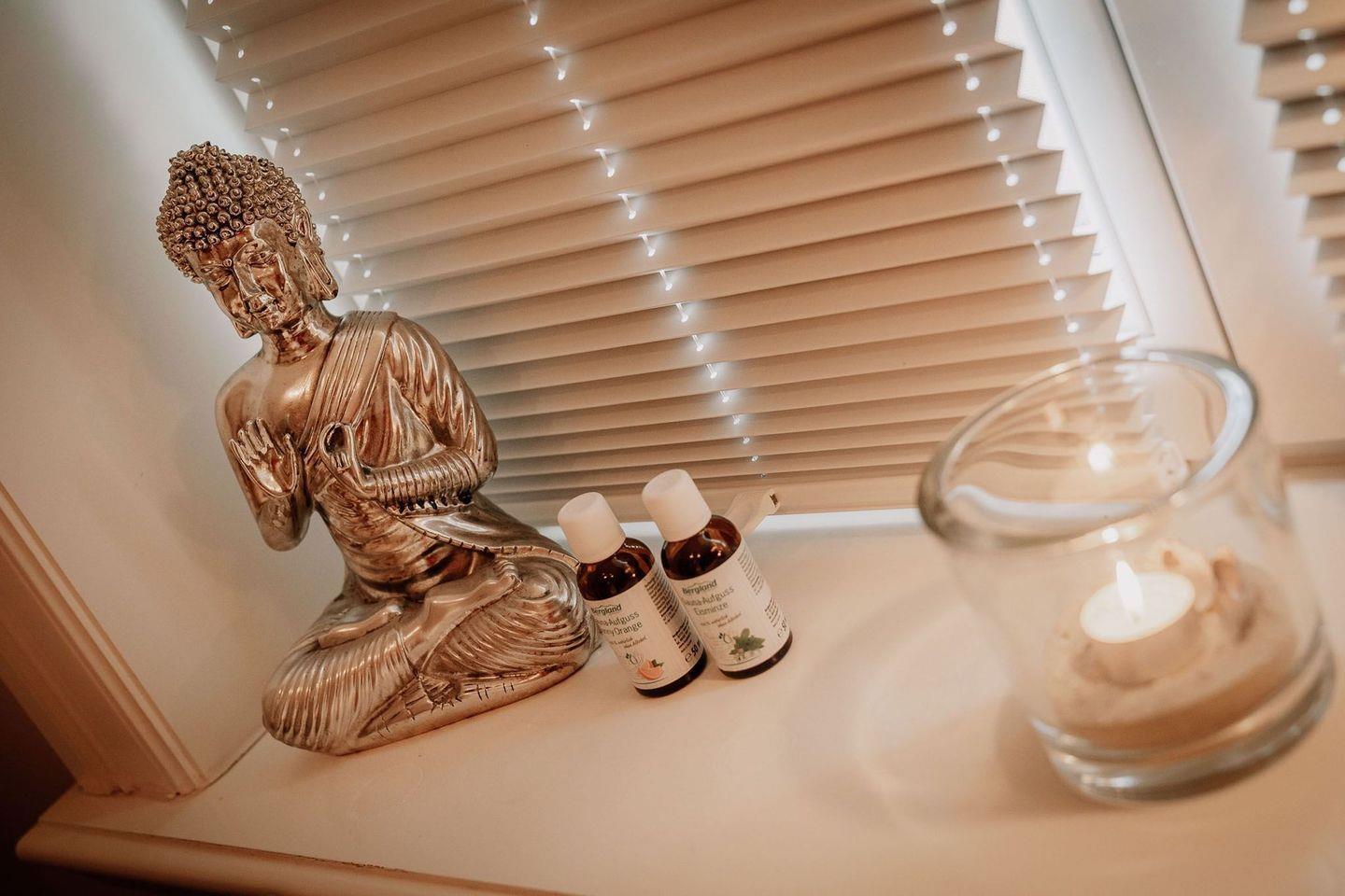 Das Grundstück mit Stellplatz, Garten und einer großzügigen Terrasse inklusive edlen Gartenmöbeln ist mit hübschen Pflanzen und einem Friesenwall angelegt.