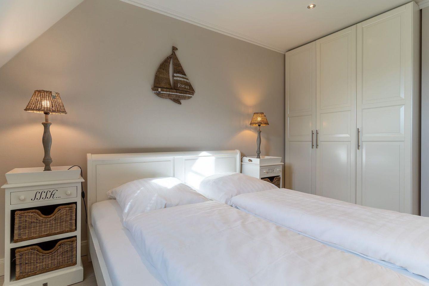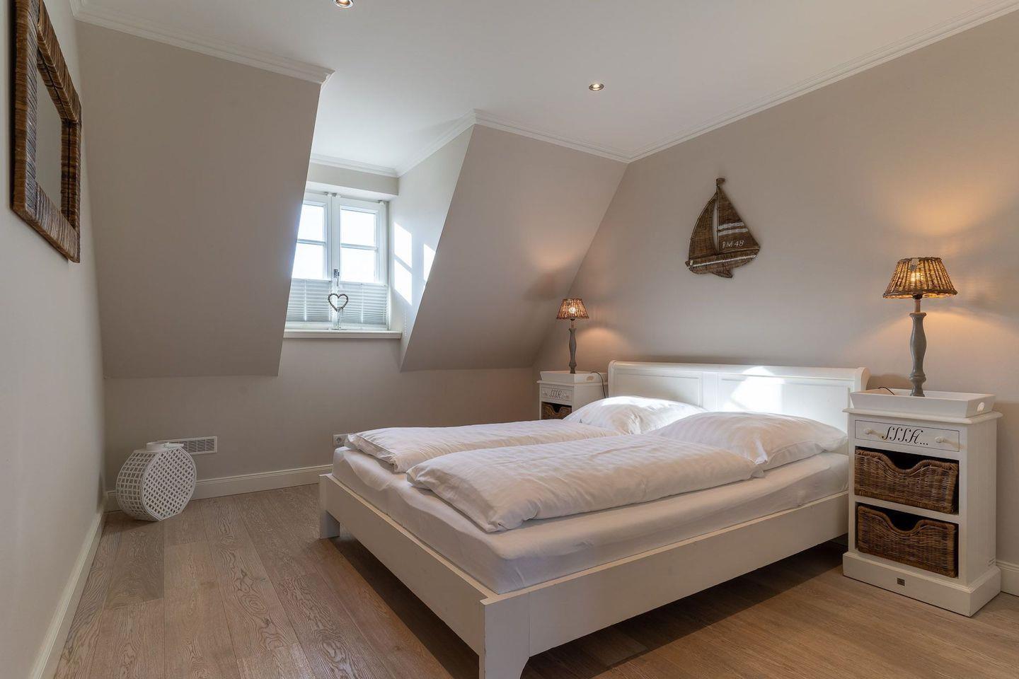 Über eine weitere Holztreppe geht es vom Flur ins Dachgeschoss mit gemütlichem Doppelbett und Flatscreen TV+DVD.