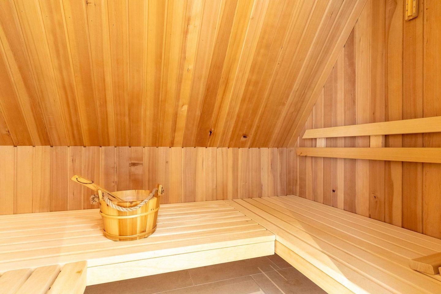 Über eine Holztreppe gelangt man in das Obergeschoss mit zwei großzügigen Schlafzimmern, einem Vollbad mit Dusche und Eckbadewanne sowie einem Saunaraum mit gemütlicher Ruhezone.