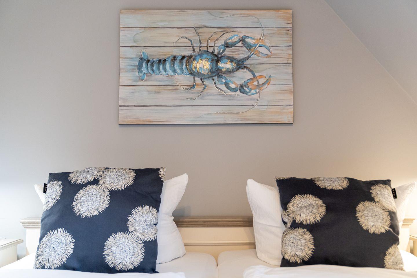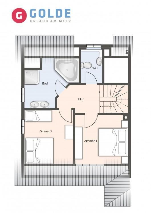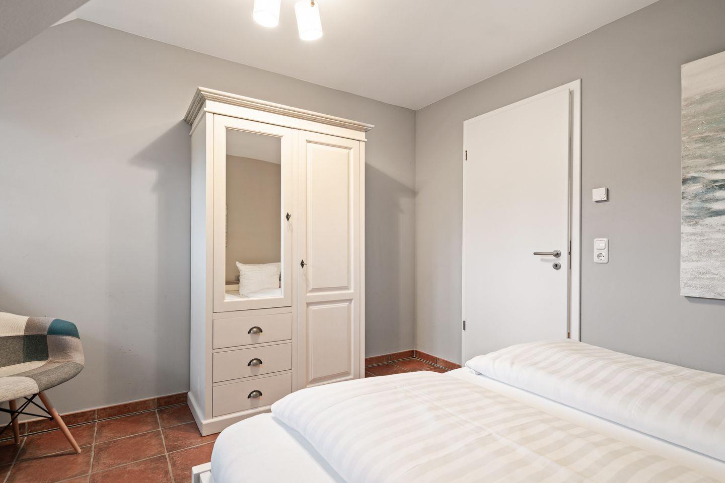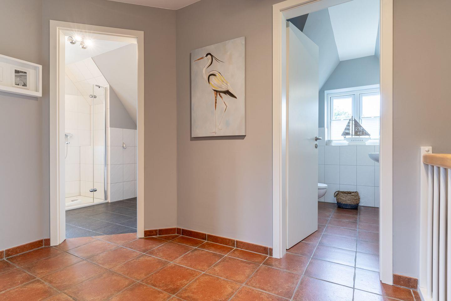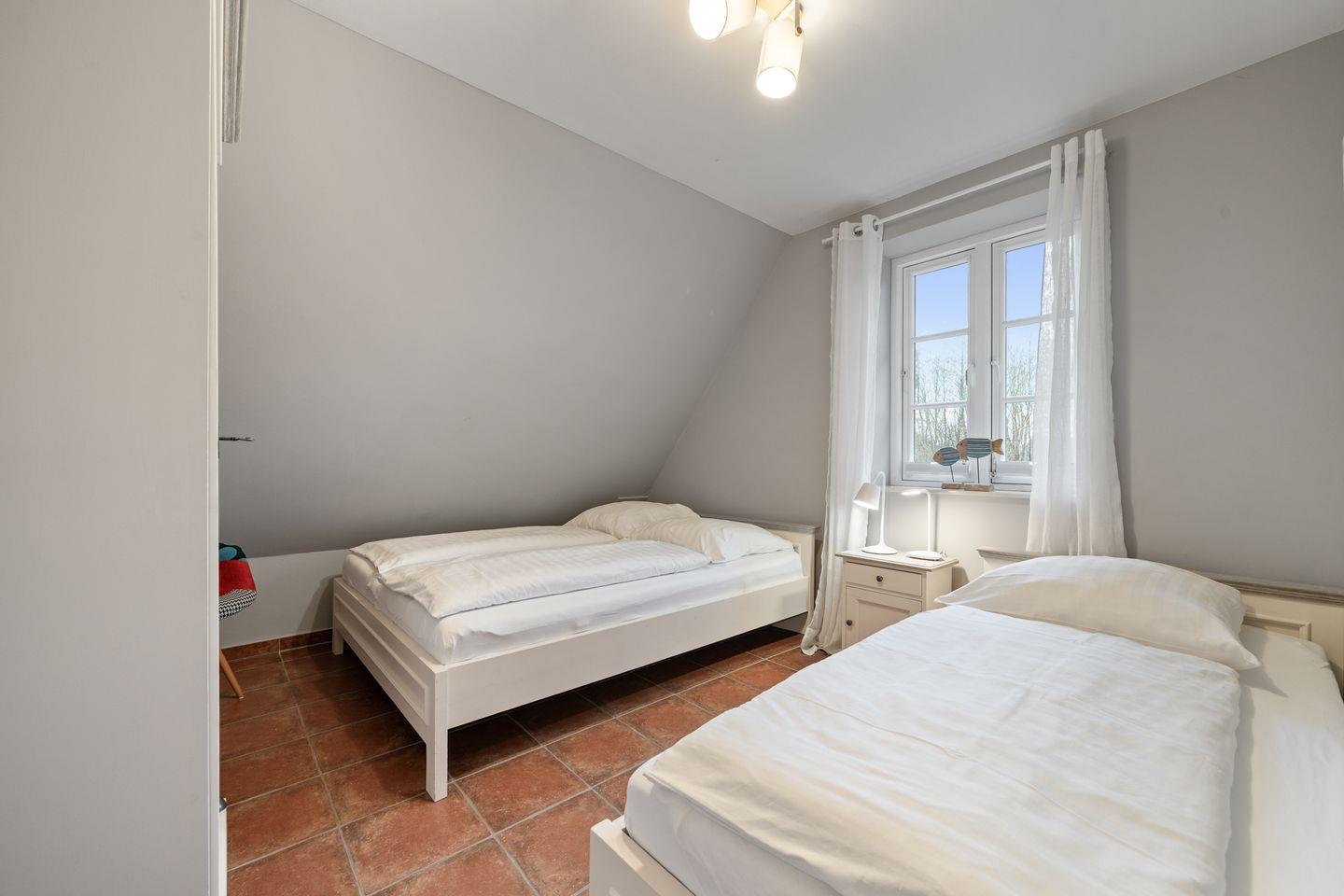 Im Erdgeschoss befindet sich der wunderschöne Wohnraum mit einem gemütlichen Essbereich und Zugang zu 2 Terrassen. Die offene Wohnküche ist mit allen wichtigen Geräten voll ausgestattet und lädt zum gemeinsamen Kochen ein. Ebenso ist im Erdgeschoss ein geräumiger Flur und ein Gäste WC. Im Obergeschoss befinden sich zwei Schlafzimmer. Eines mit einem Doppelbett und großem Kleiderschrank und ein weiteres mit 3 Schlafplätzen, einem Doppelbett und einem Einzelbett. Außerdem ist im Obergeschoss ein geräumiges Vollbad mit Eckbadewanne. Zusätzlicher Luxus im Obergeschoss ist ein weiteres Gäste-WC.