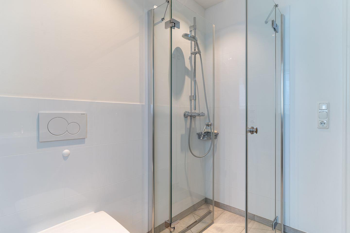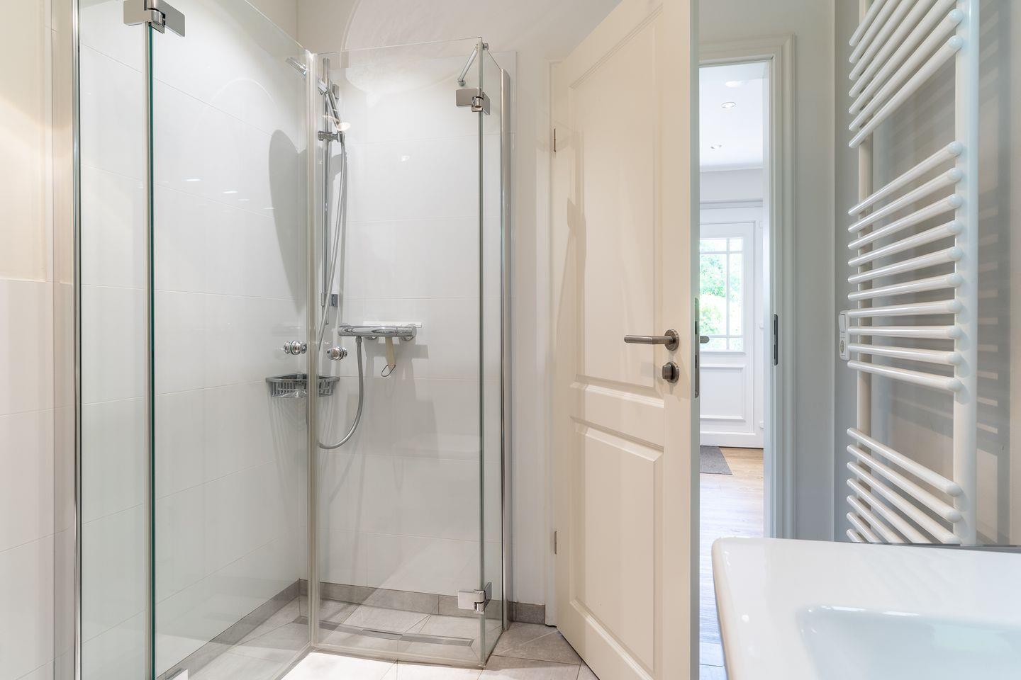Die Küche ist mit hochwertigen Geräten und edlem Geschirr voll ausgestattet. Im Erdgeschoss ist ebenso ein Flur mit Garderobe, ein Abstellraum unter der Treppe und ein großzügiges Duschbad.