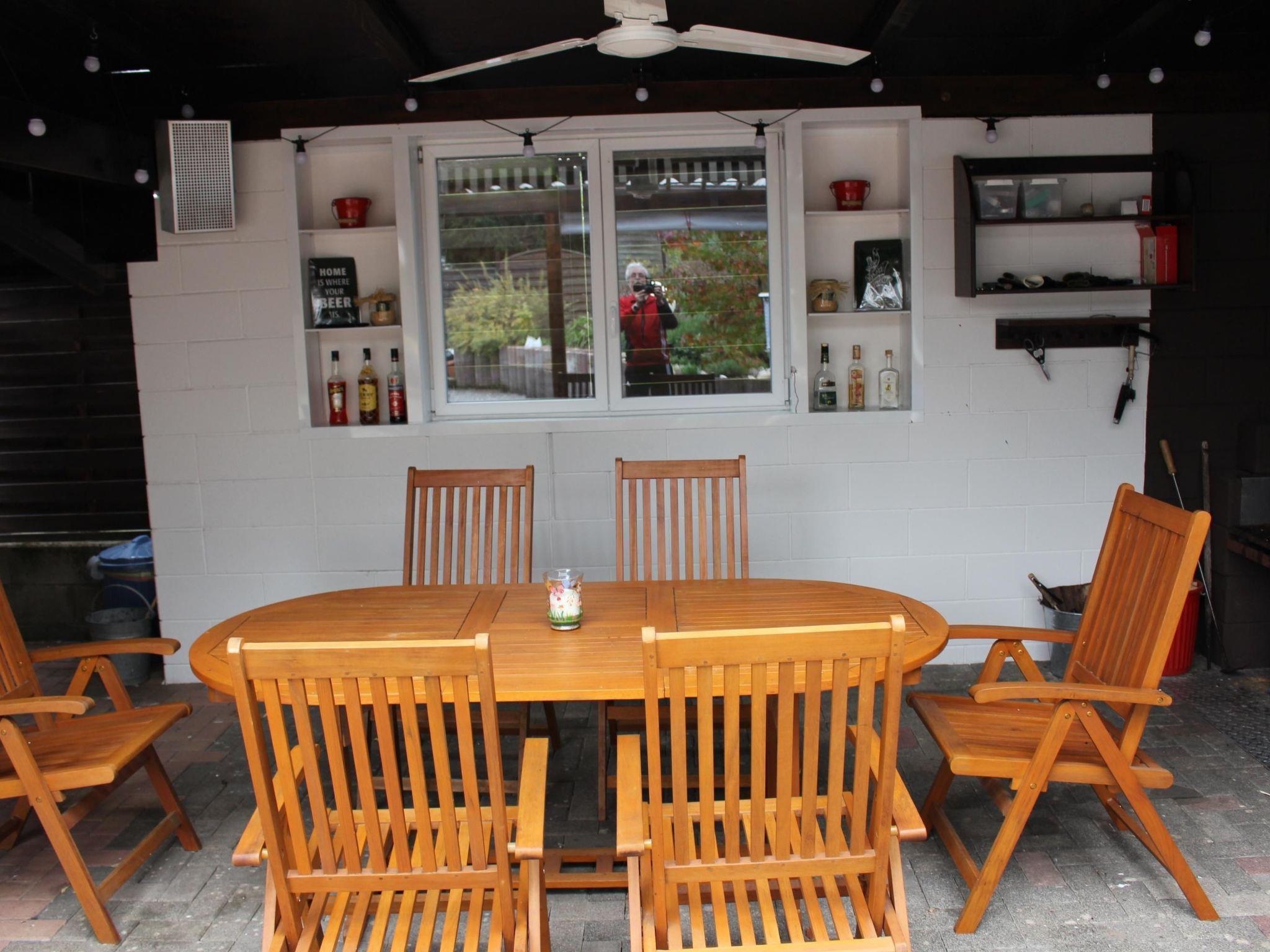 The doors in the living room and bedroom open onto a covered terrace with garden furniture, deckchairs, awning and parasol. The outdoor kitchen includes kitchenware, fridge, coffee machine, two hotplates and sink. A covered barbecue area can be used in the garden, as can the garden shed and a WC. A free parking space is available in the courtyard.