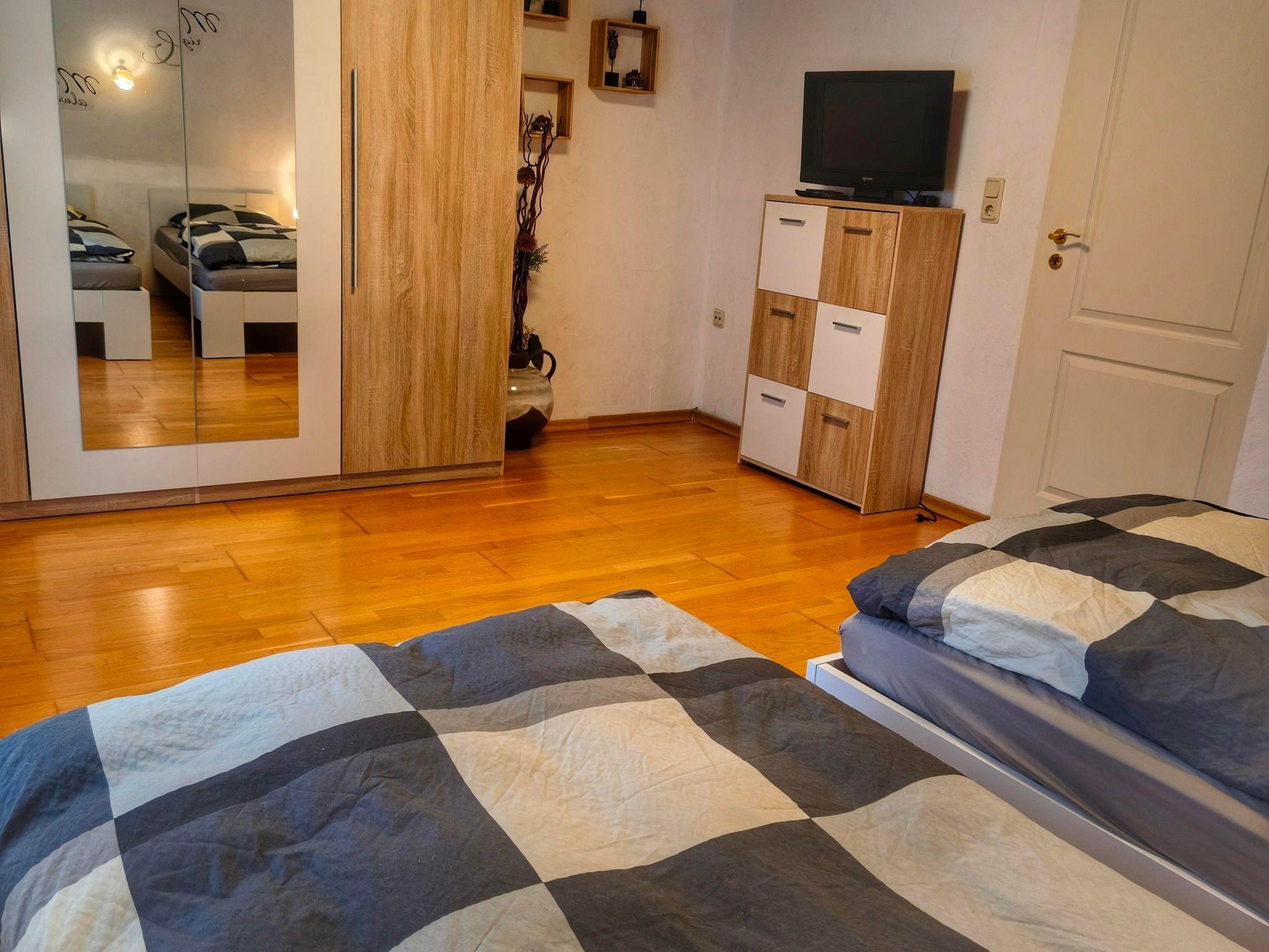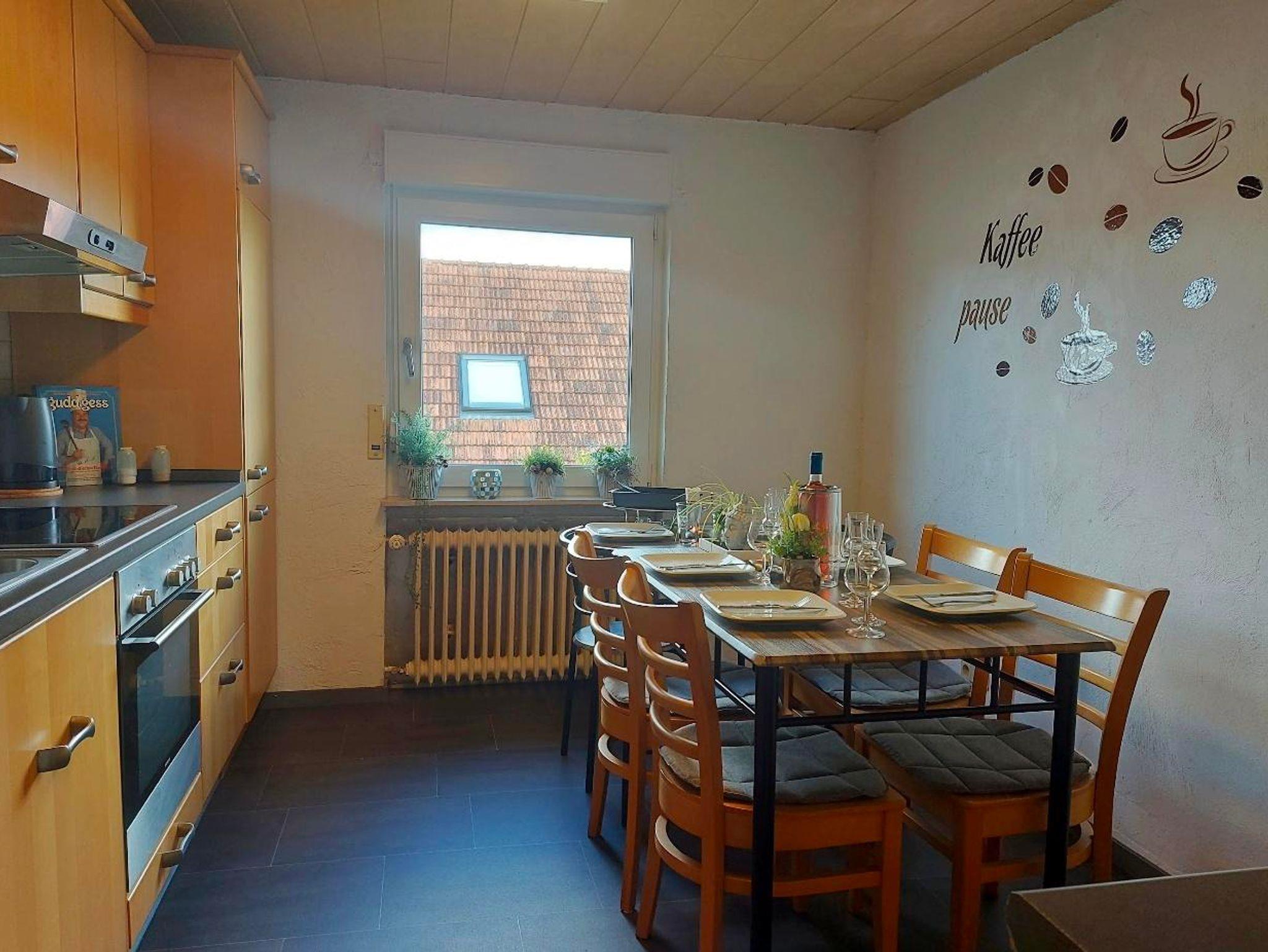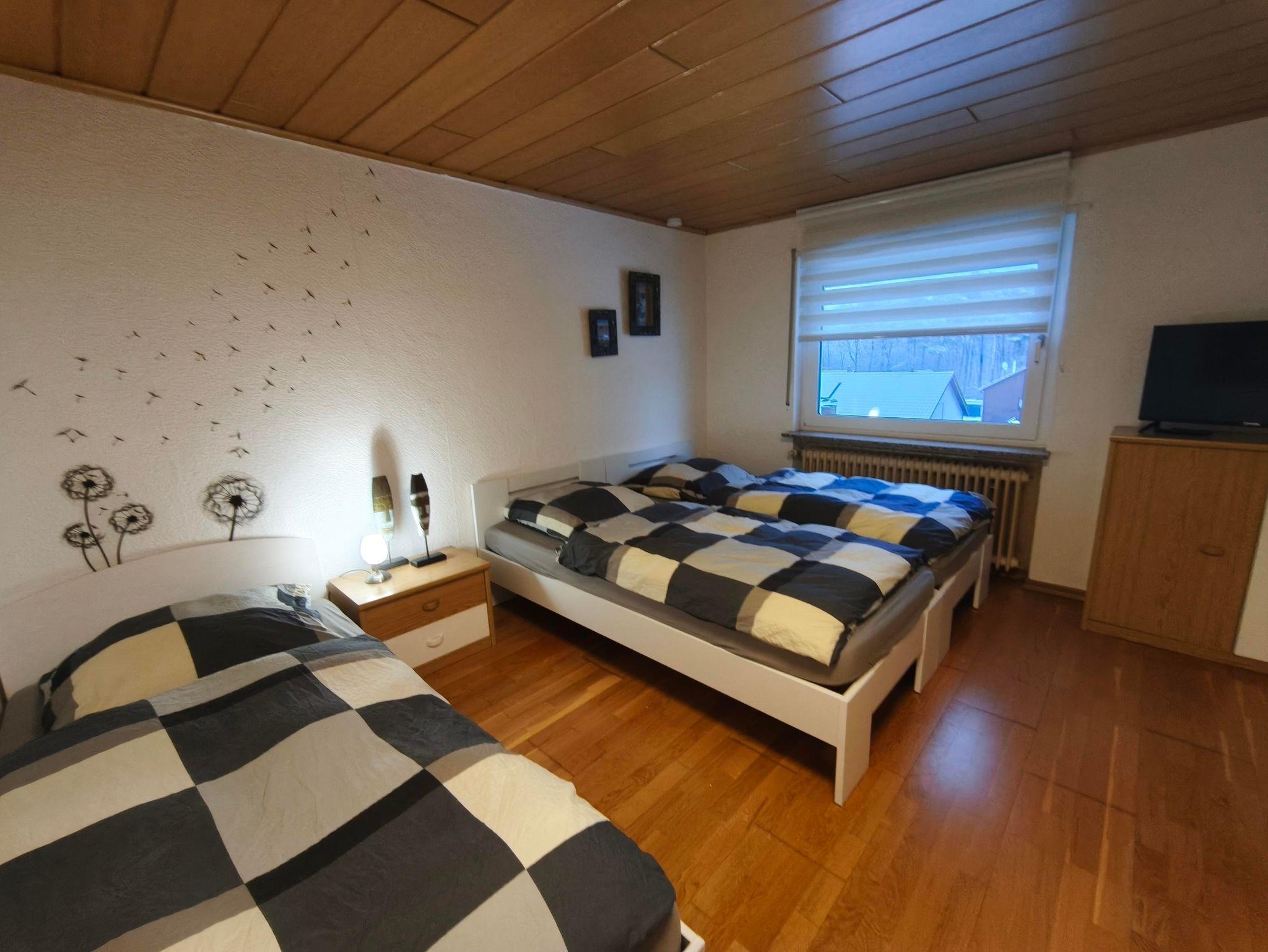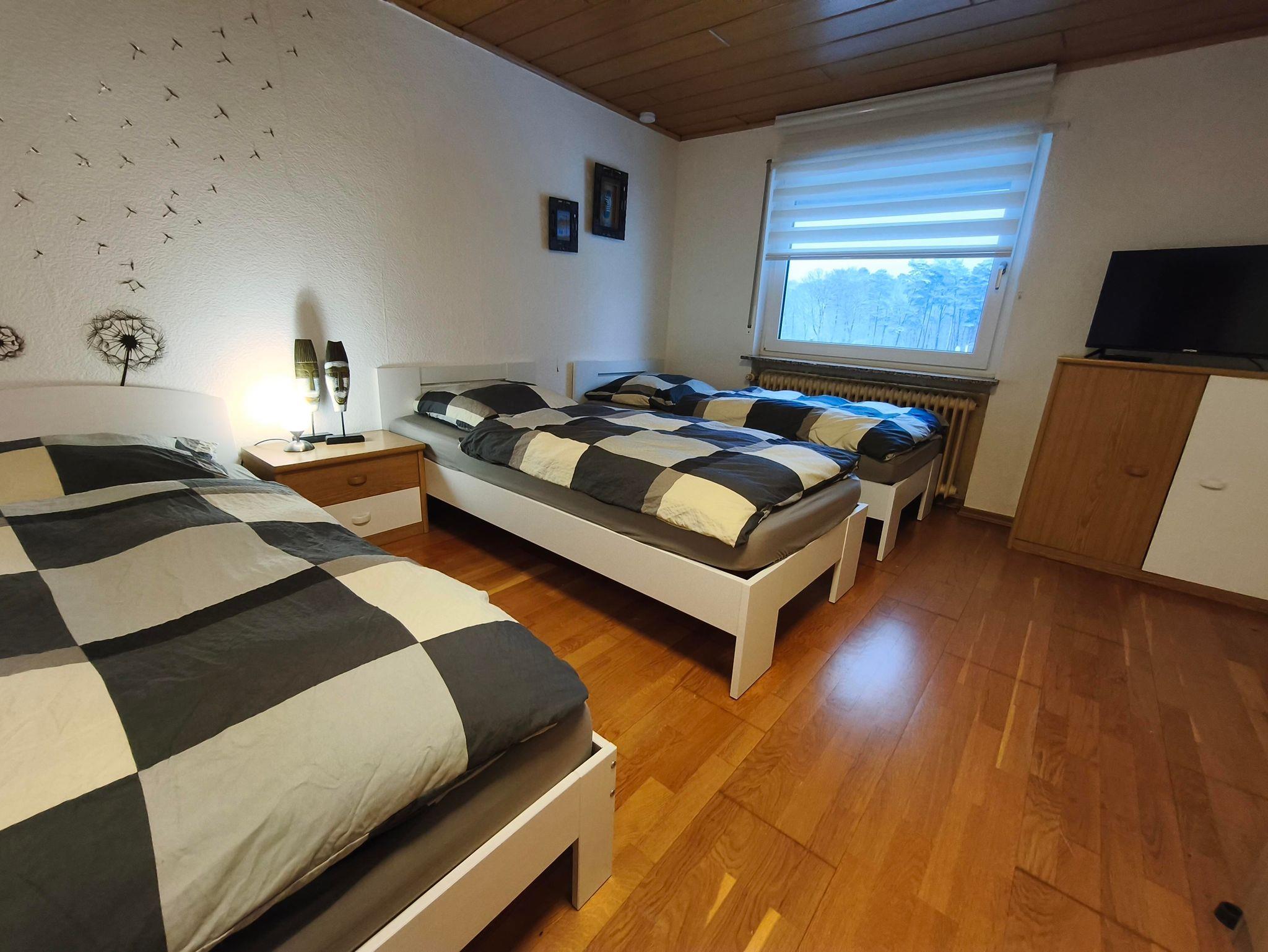 Wohnung in der 1. Etage eines Zweifamilienhauses Eingezäunter Garten Grill und Aufstellpool (Pool wird von beiden Wohnparteien genutzt) Haustiere auf Anfrage Waldrandlage 3 Schlafzimmer: 1 Zimmer mit 2 Einzelbetten/ Fernseher 1 Zimmer mit 1 Einzelbett 1 Zimmer mit 3 Einzellbetten 1 Bad mit Dusche und Eckbadewanne 1 Wohnzimmer , Fernseher 1 voll ausgestattete Küche mit Backofen, Geschirrspüler, Kaffeemaschine, Toaster, Wasserkocher, Mikrowelle, Kühlgefrierkombination Balkon Balkonmöbel Handtücher Bettwäsche Kostenlose Parkmöglichkeiten direkt vorm Haus Einkaufsmöglichkeiten direkt vor Ort.