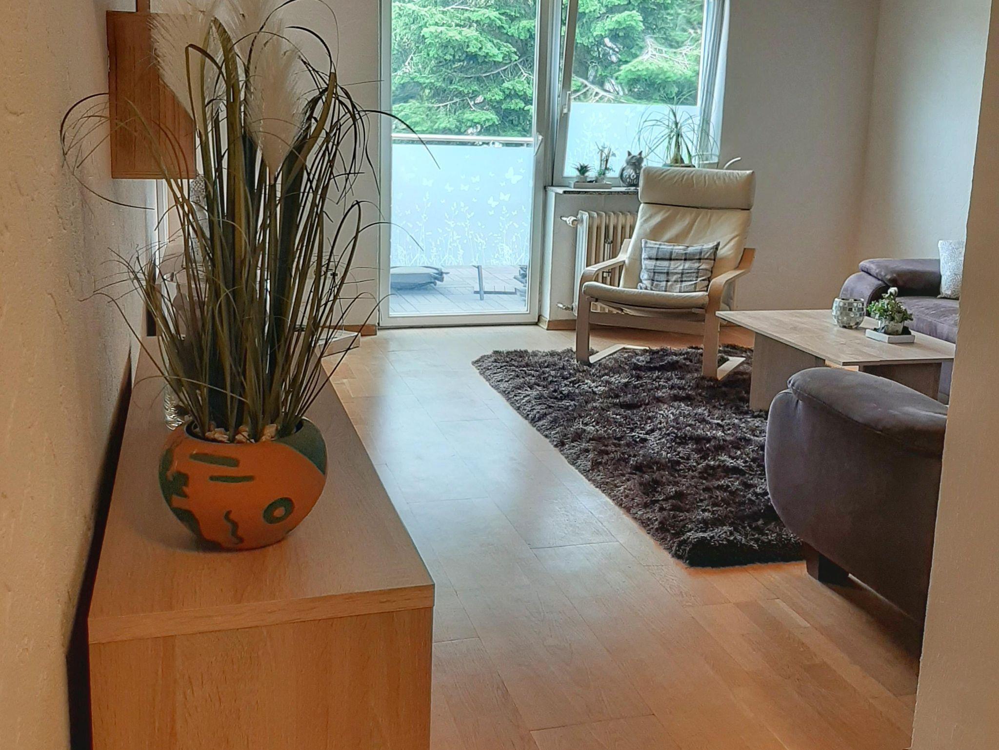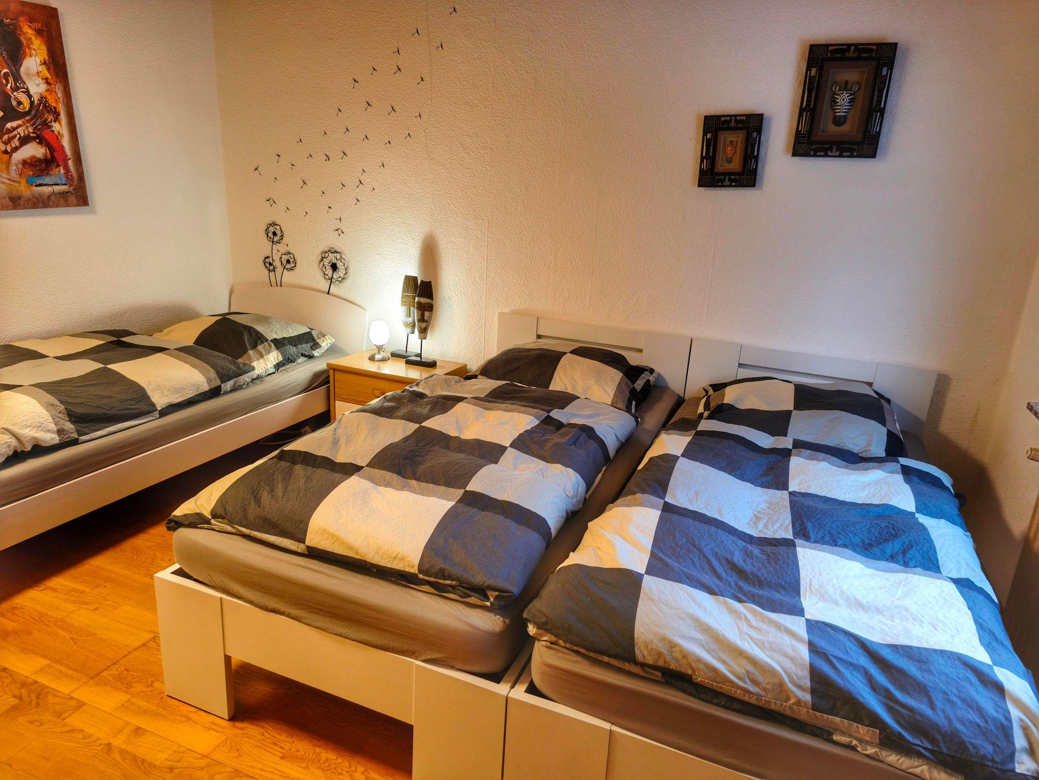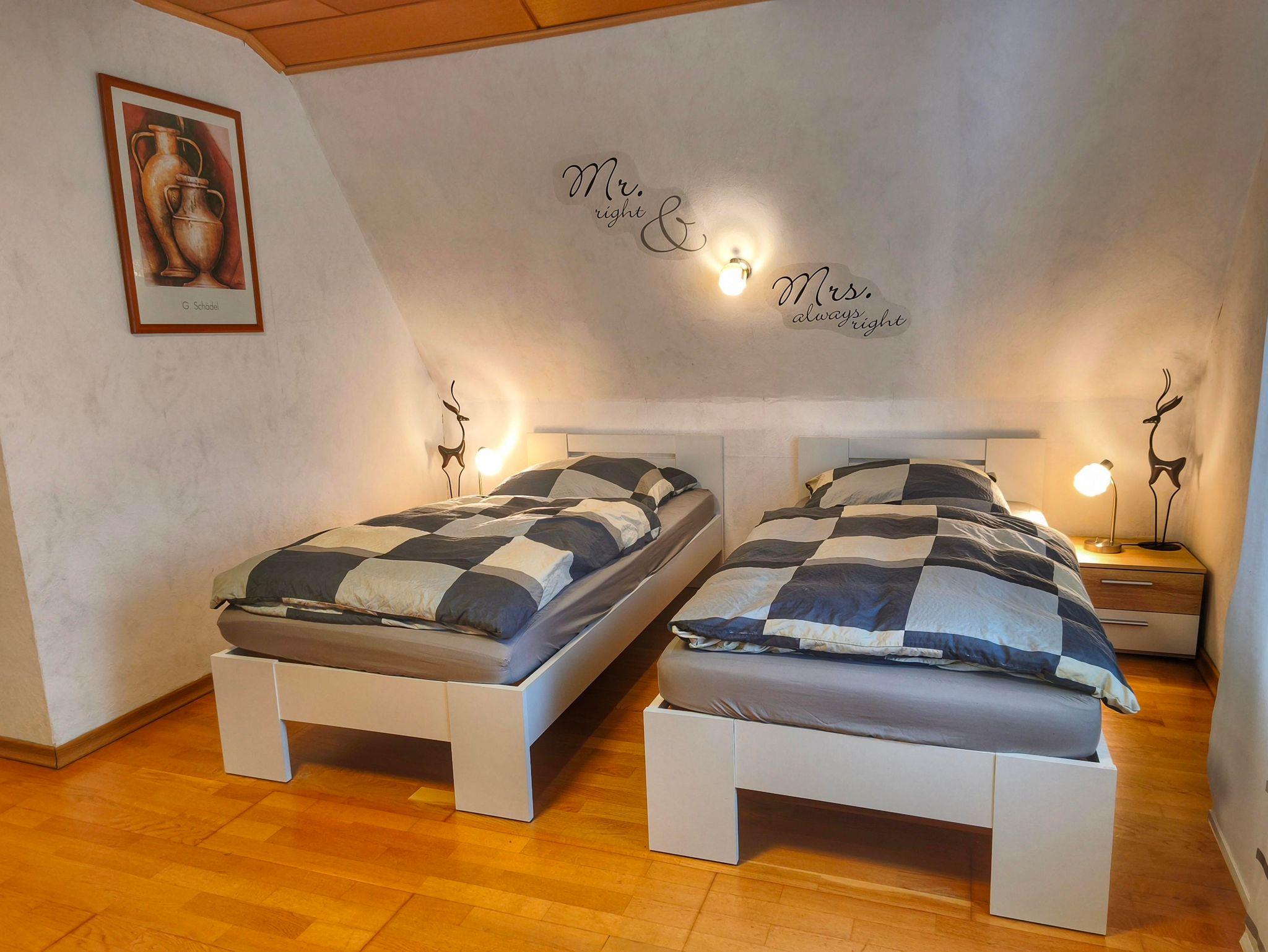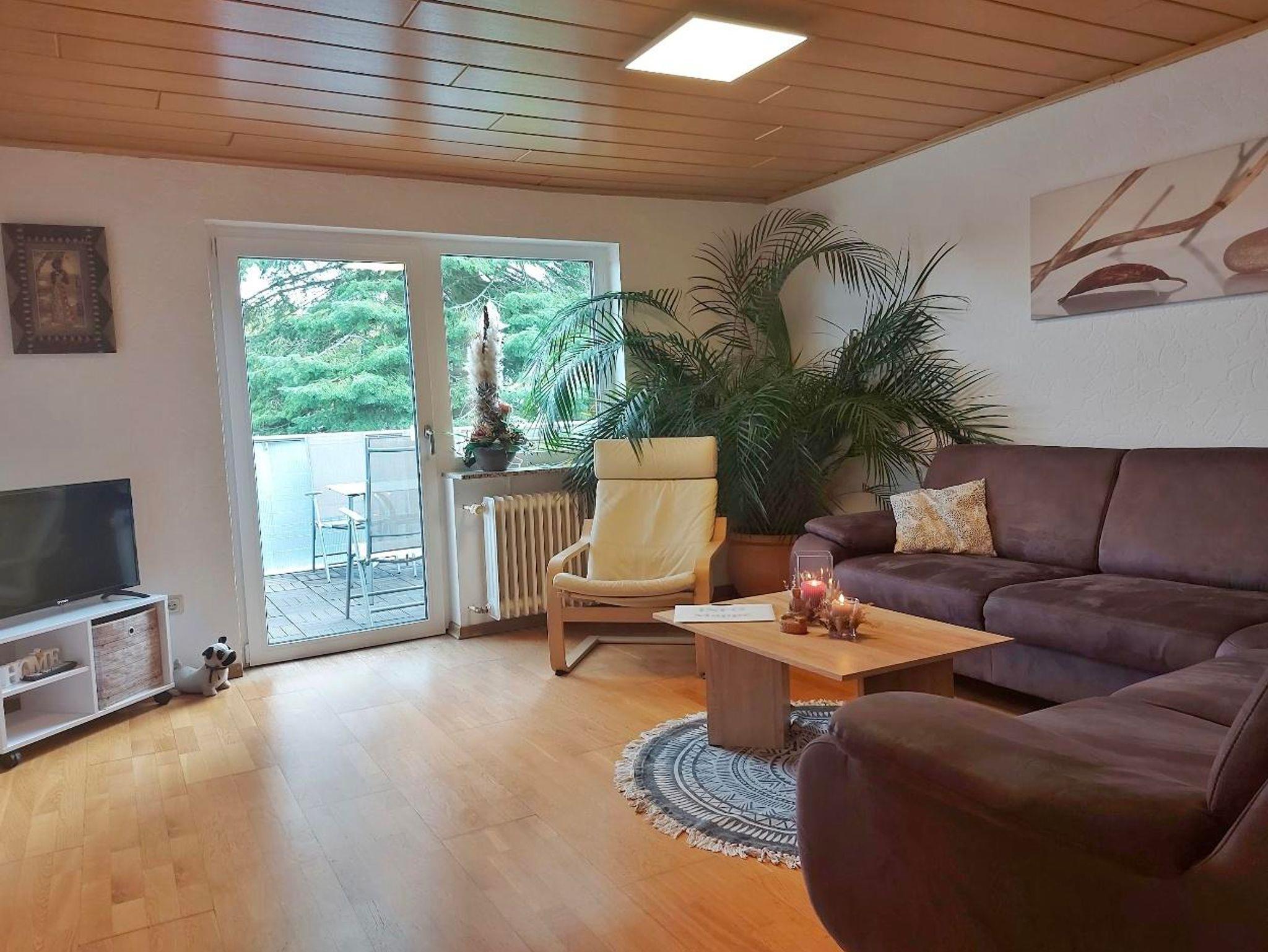 Wohnung in der 1. Etage eines Zweifamilienhauses Eingezäunter Garten Grill und Aufstellpool (Pool wird von beiden Wohnparteien genutzt) Haustiere auf Anfrage Waldrandlage 3 Schlafzimmer: 1 Zimmer mit 2 Einzelbetten/ Fernseher 1 Zimmer mit 1 Einzelbett 1 Zimmer mit 3 Einzellbetten 1 Bad mit Dusche und Eckbadewanne 1 Wohnzimmer , Fernseher 1 voll ausgestattete Küche mit Backofen, Geschirrspüler, Kaffeemaschine, Toaster, Wasserkocher, Mikrowelle, Kühlgefrierkombination Balkon Balkonmöbel Handtücher Bettwäsche Kostenlose Parkmöglichkeiten direkt vorm Haus Einkaufsmöglichkeiten direkt vor Ort.
