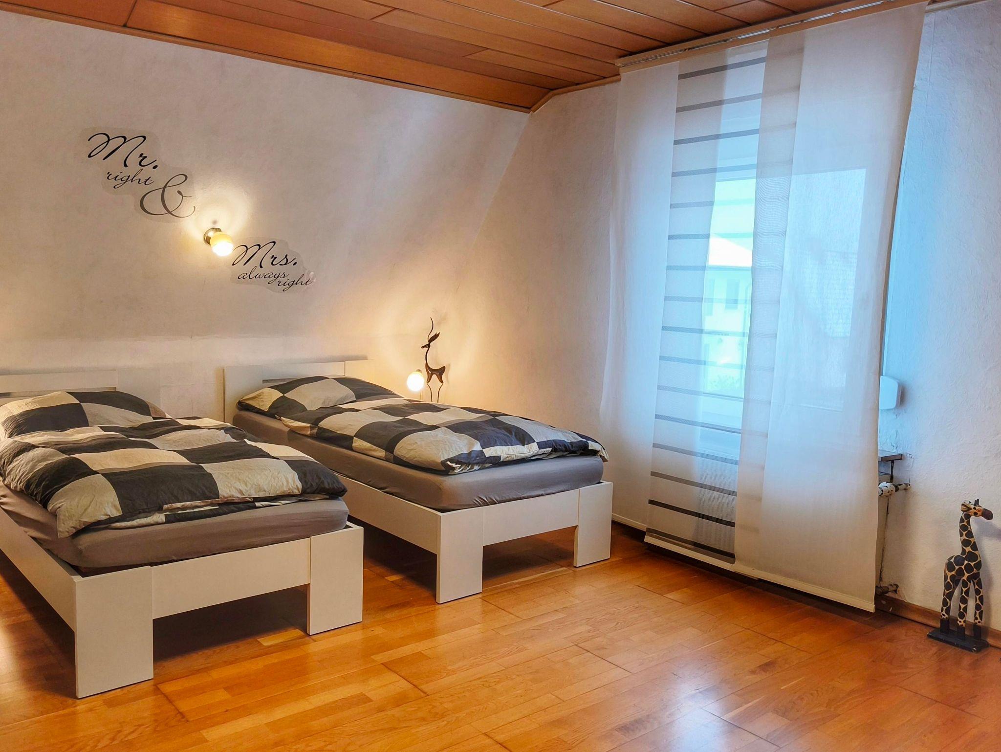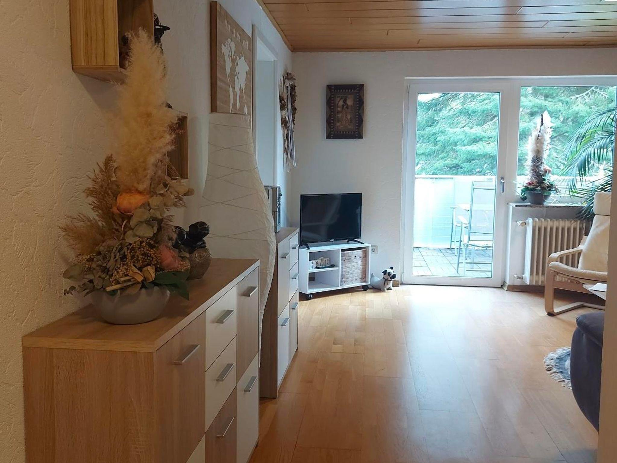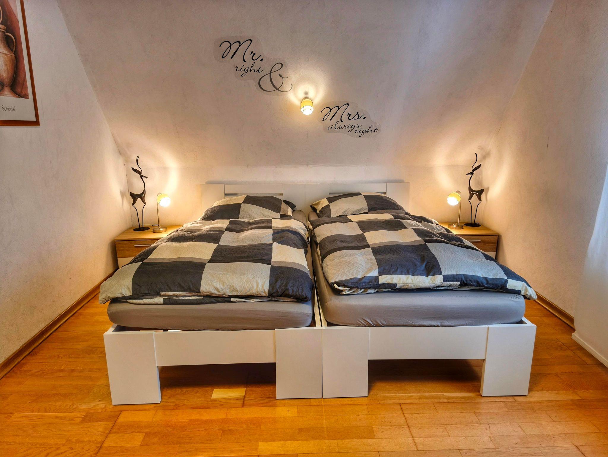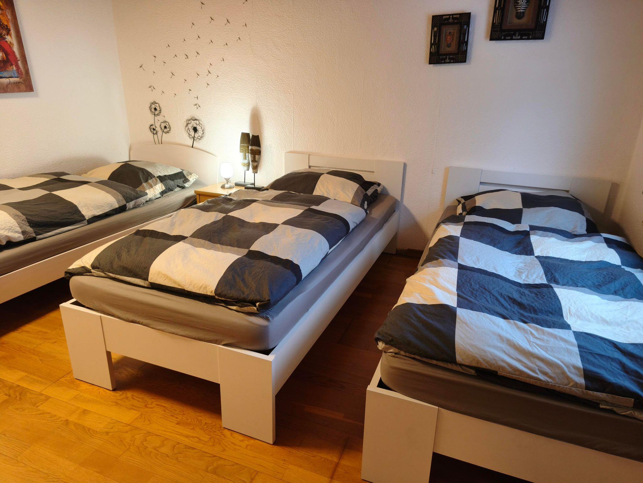 Wohnung in der 1. Etage eines Zweifamilienhauses Eingezäunter Garten Grill und Aufstellpool (Pool wird von beiden Wohnparteien genutzt) Haustiere auf Anfrage Waldrandlage 3 Schlafzimmer: 1 Zimmer mit 2 Einzelbetten/ Fernseher 1 Zimmer mit 1 Einzelbett 1 Zimmer mit 3 Einzellbetten 1 Bad mit Dusche und Eckbadewanne 1 Wohnzimmer , Fernseher 1 voll ausgestattete Küche mit Backofen, Geschirrspüler, Kaffeemaschine, Toaster, Wasserkocher, Mikrowelle, Kühlgefrierkombination Balkon Balkonmöbel Handtücher Bettwäsche Kostenlose Parkmöglichkeiten direkt vorm Haus Einkaufsmöglichkeiten direkt vor Ort.