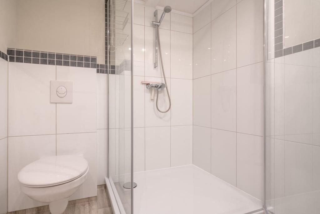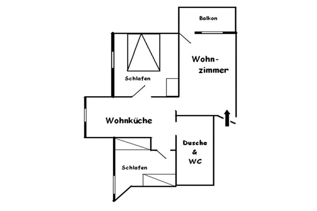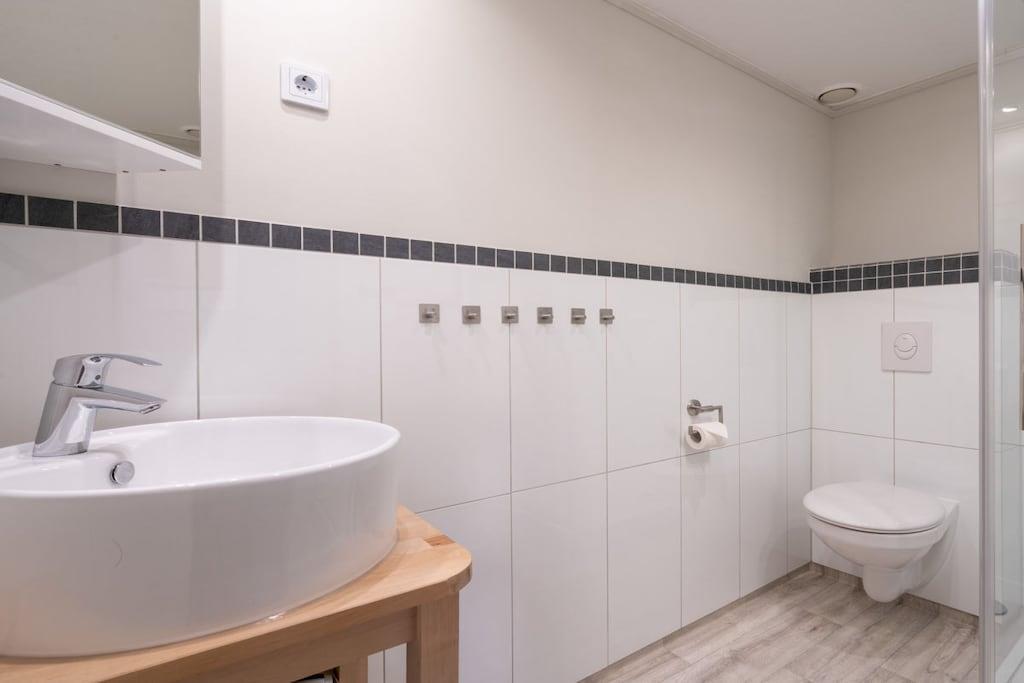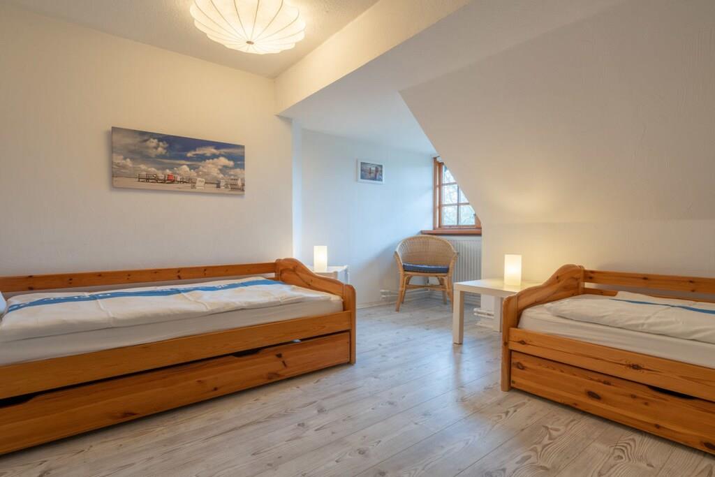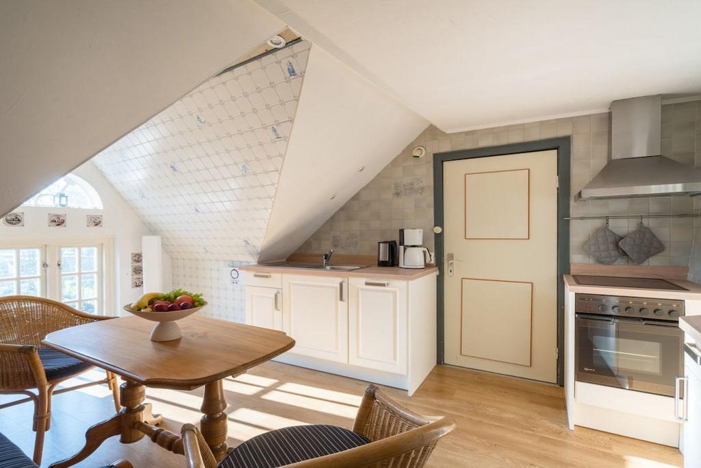 The rustic gabled apartment is on the upper floor and has a quiet location facing the apple orchard. Some of the supporting beams have been carefully exposed.