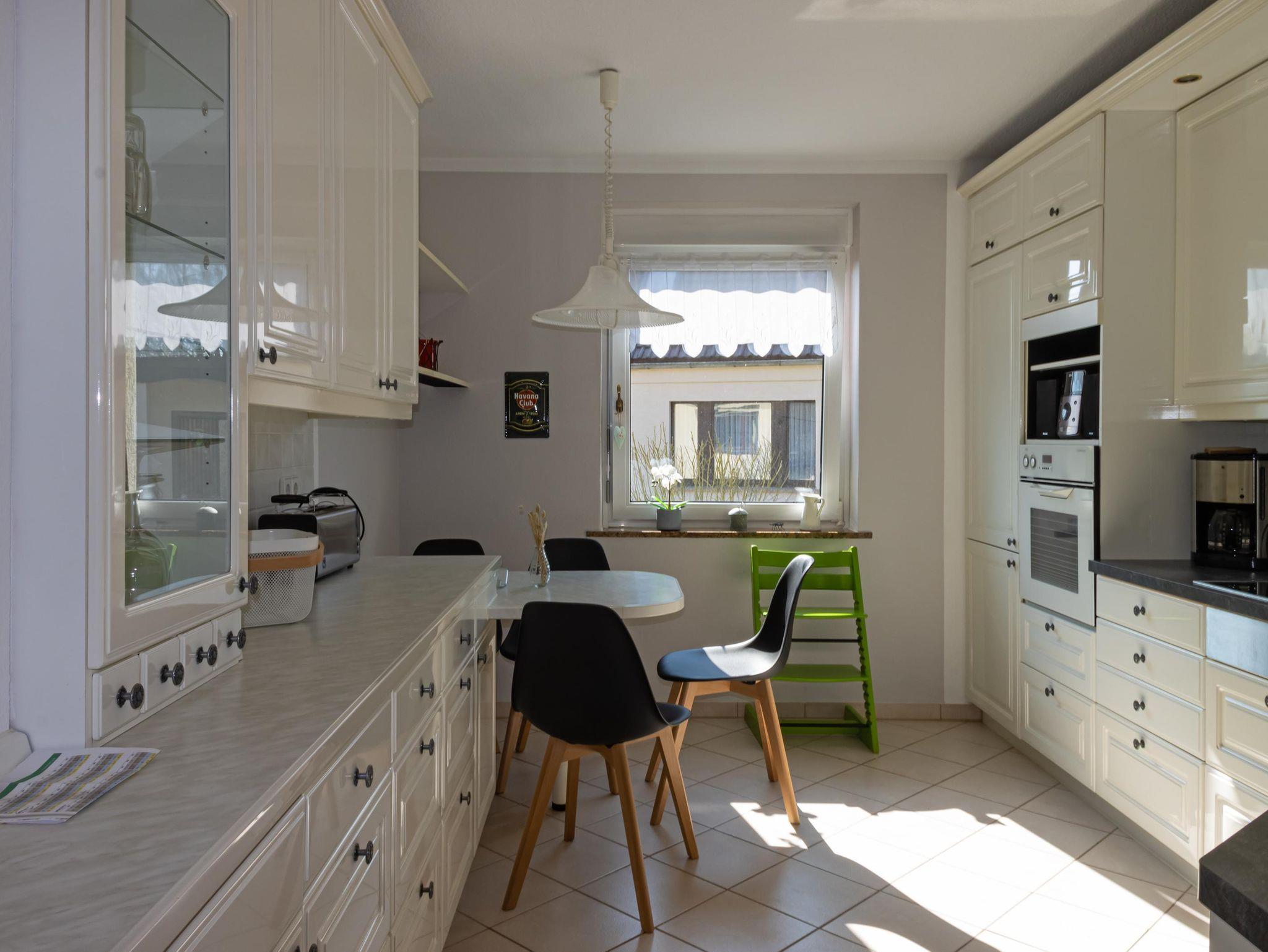 Im Erdgeschoss befindet sich eine große Küche mit Sitzmöglichkeiten, Wasserkocher, Geschirrspüler, Kühl-/Gefrierkombination, Kaffeemaschine, Toaster und einem E-Herd/Backofen sowie ein großzügiger Wohnraum mit Kamin, Schlafsofa (1,20m), begehbarer Terrasse und abgeteiltem Esszimmer.