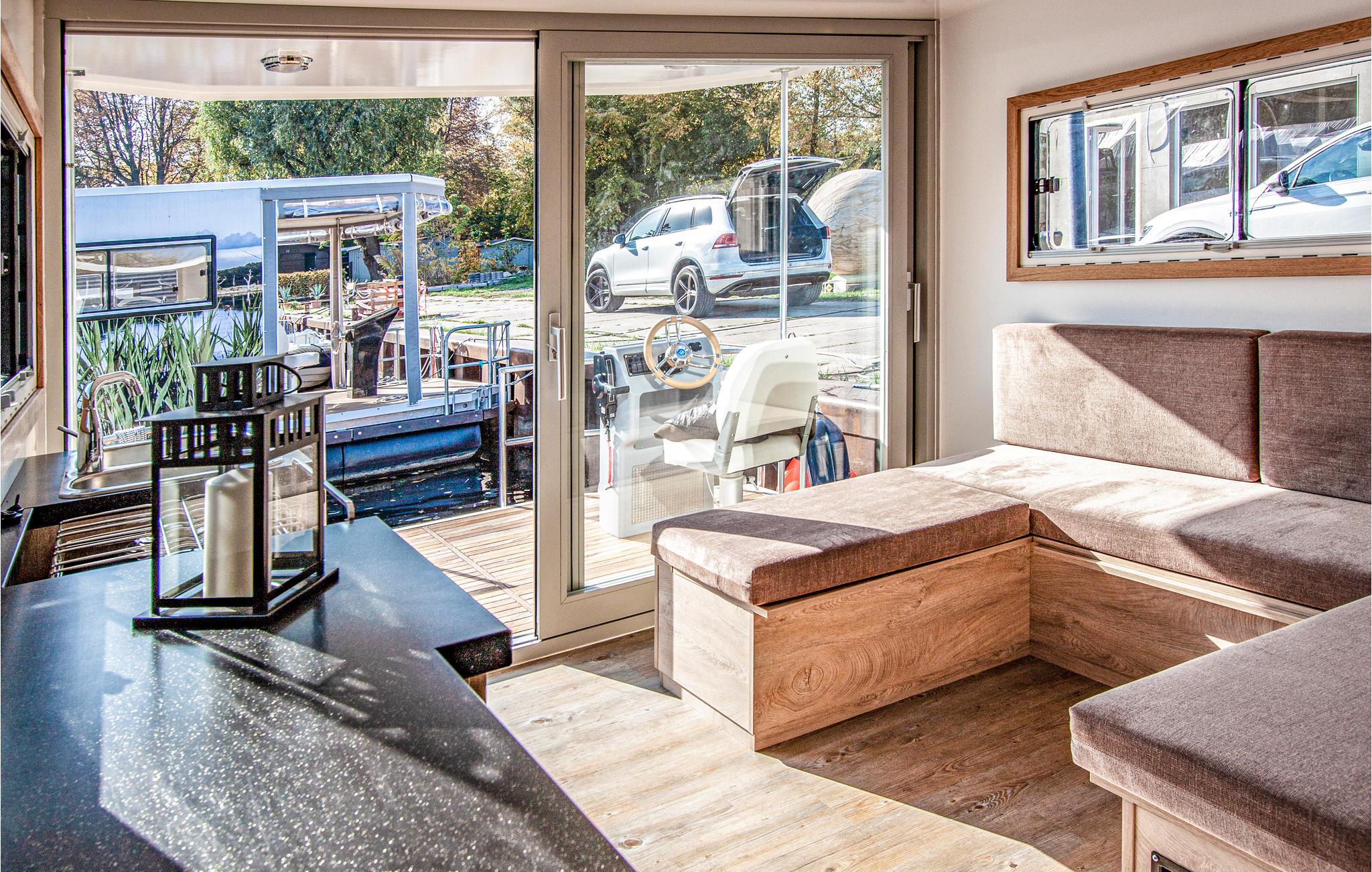 Denne husbåd er moderne og komfortabelt møbleret og kan lejes uden licens. En udvendig stige bagpå fører til tagterrassen, der kan bruges som græsplæne. Det sofistikerede værelse-koncept tilbyder masser af plads selv i de mindste rum - der er et soveværelse med en dobbeltseng og siddepladsen i opholdsområdet kan konverteres til en dobbeltseng. Et solsystem på taget sikrer energiforsyningen.