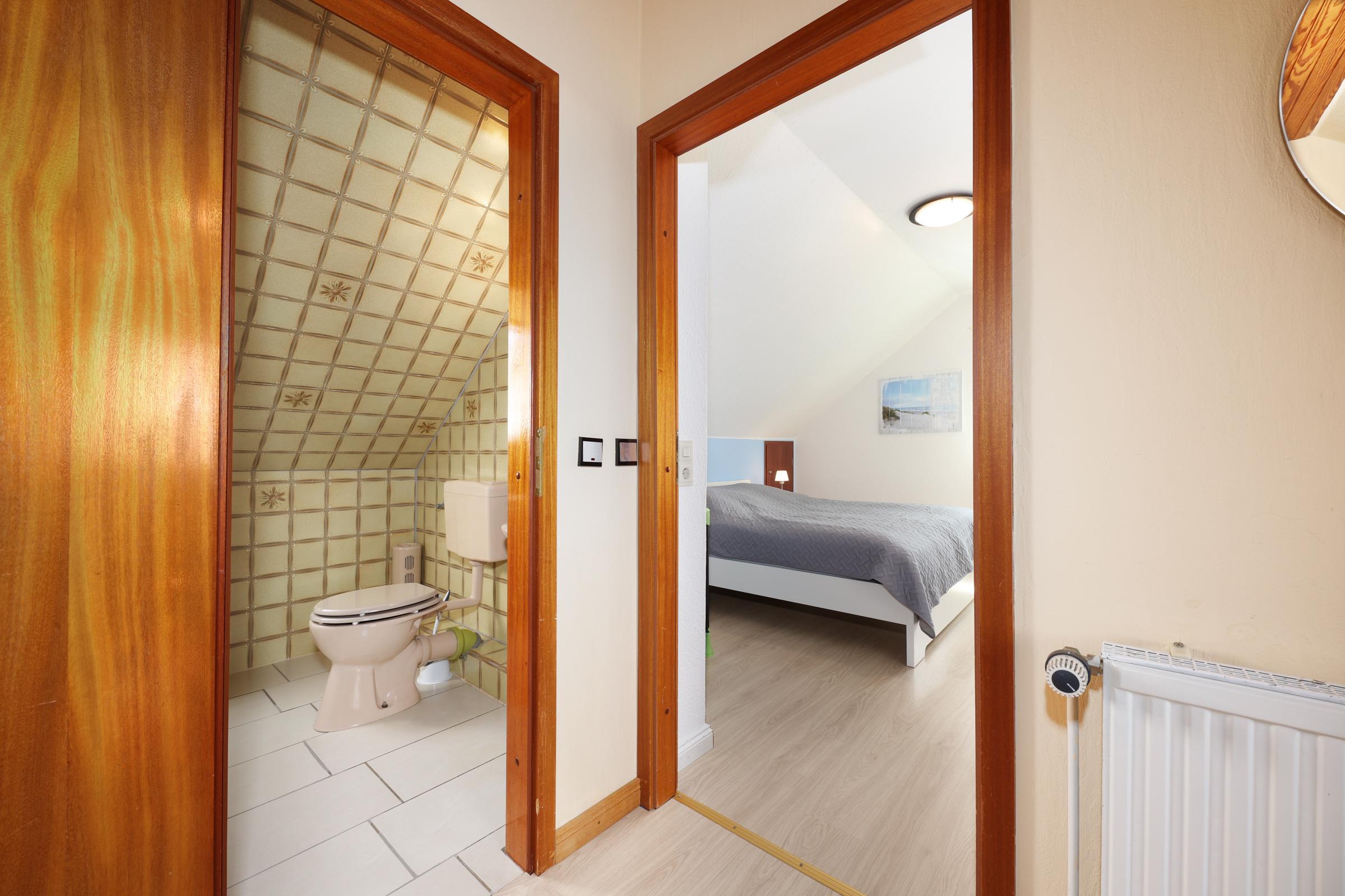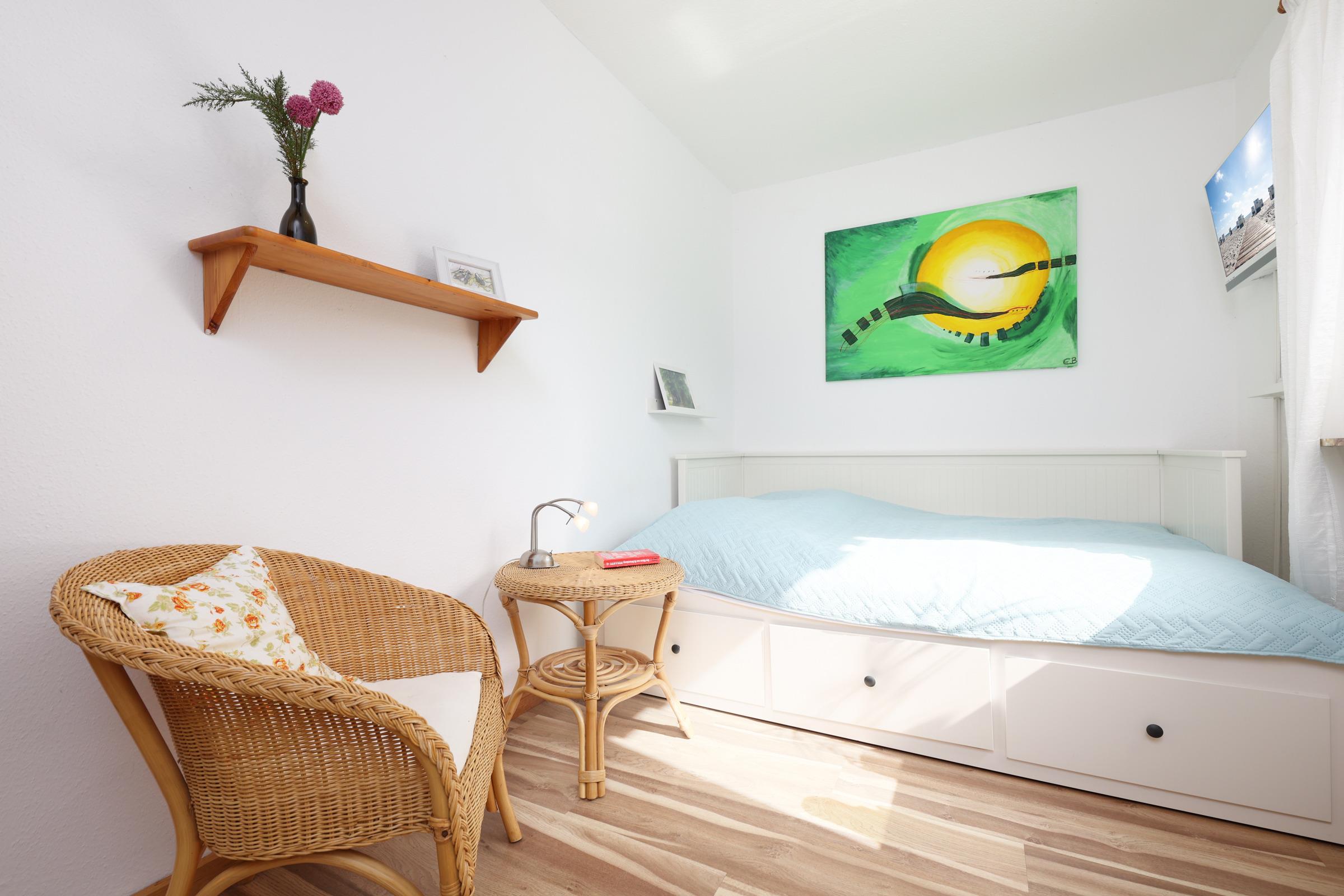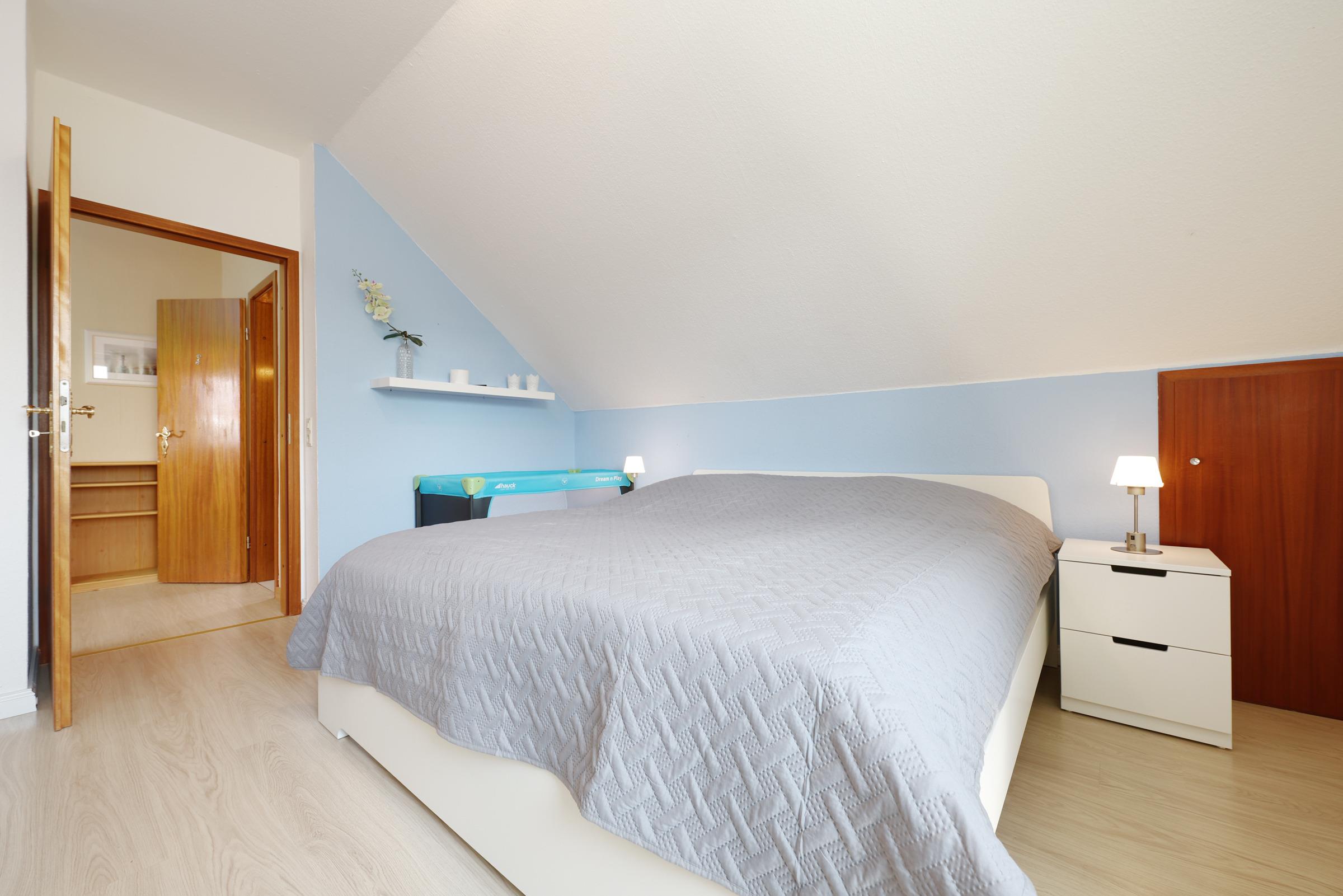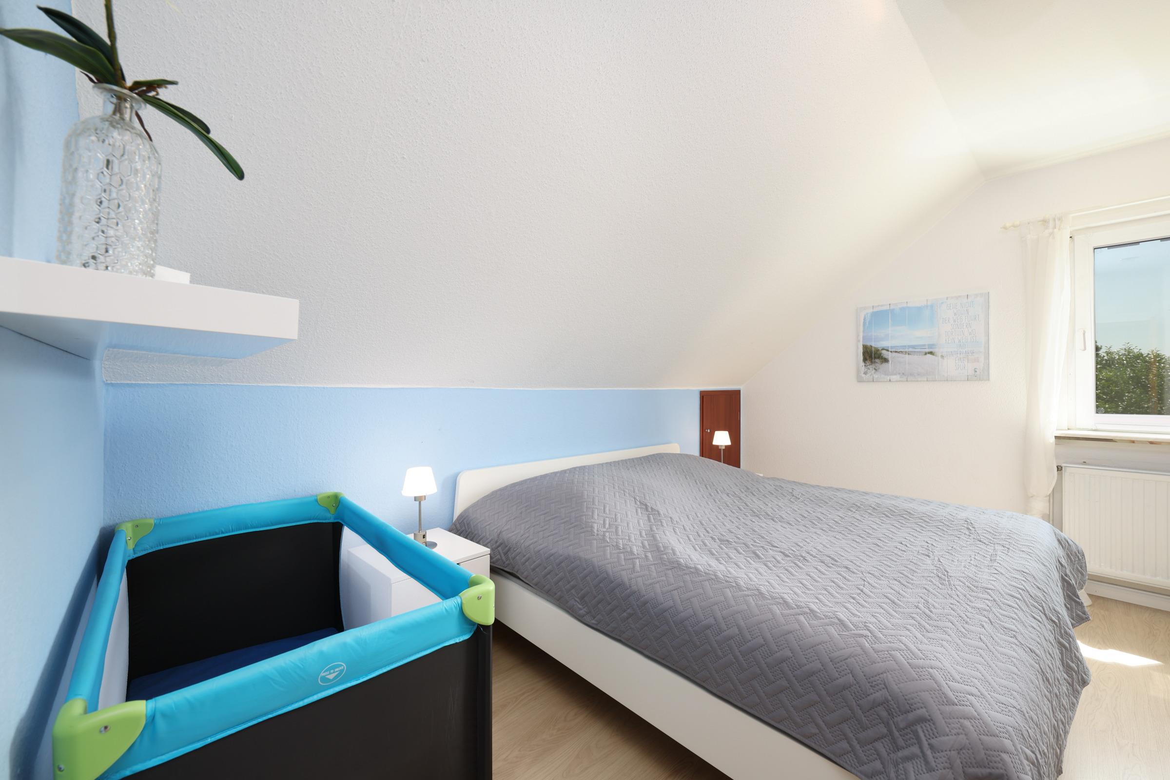 Schlafzimmer 1: 1 Doppelbett (2x 90x200 cm), Kleiderschrank, Verdunkelung: Gardinen, Platz für ein Babybett vorhanden