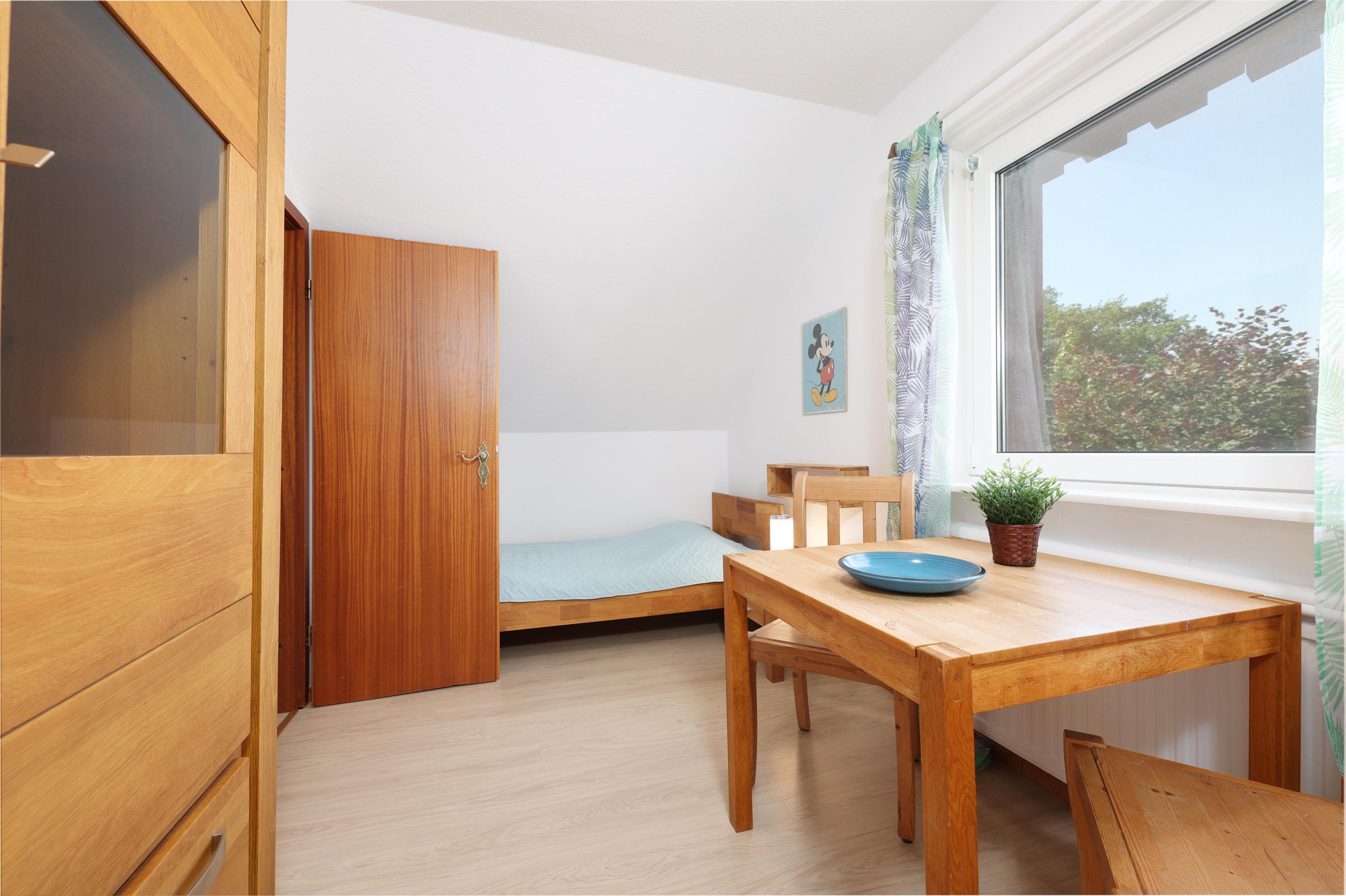 Schlafzimmer 2: 2 Einzelbetten (je 90x200 cm), Kleiderschrank, Verdunkelung: Gardinen, Platz für ein Babybett vorhanden