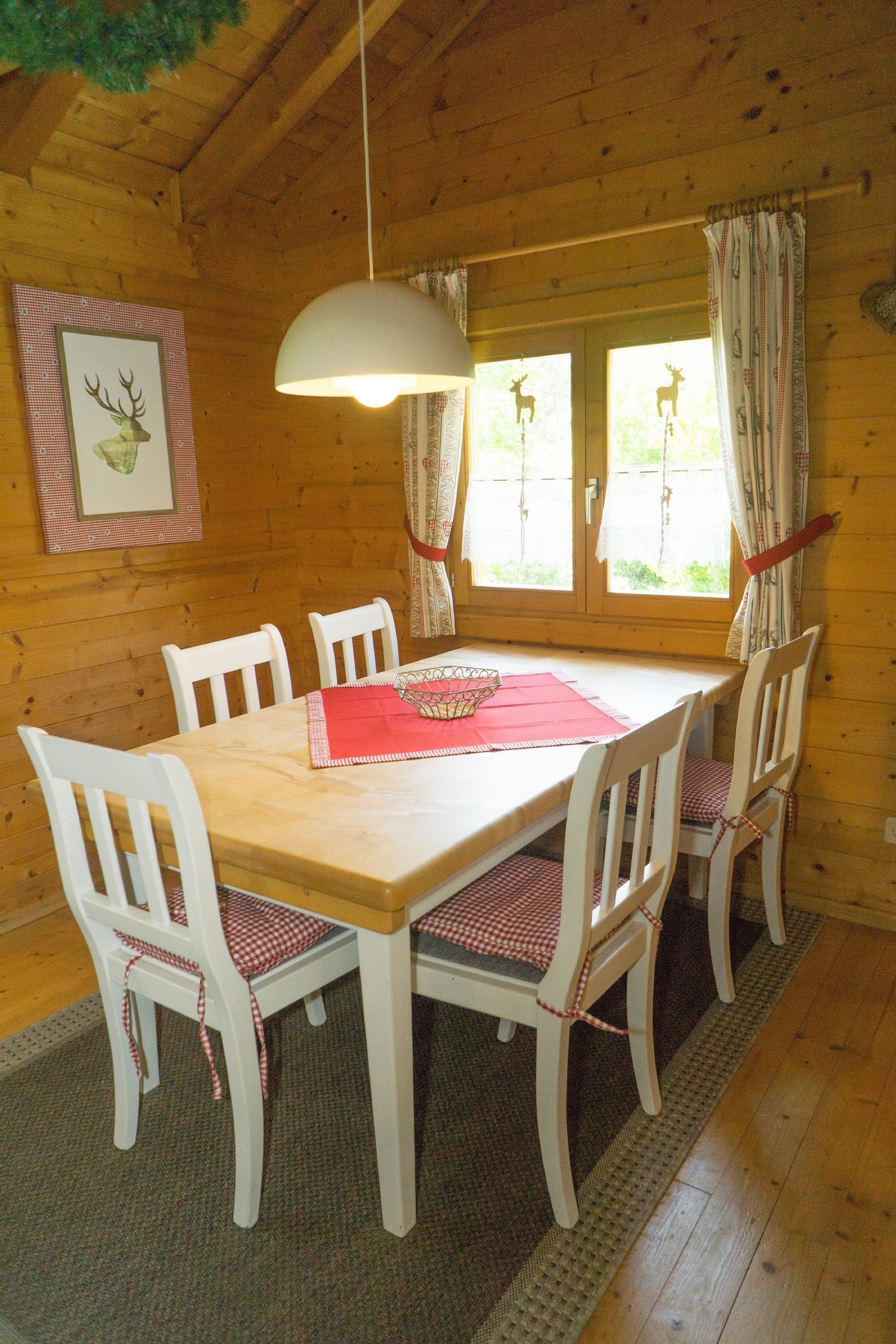 3-Zimmer-Blockhaus für 5 Personen, ca. 55 m² mit Terrasse und Anbau: 1 Wohn-/Essraum mit bequemer Sitzgruppe, Schrankwand mit großzügiger Unterbringung von Geschirr und Gläsern für 10 P, SAT-Digital-TV, Stereoanlage mit CD-Player, Bluray DVD-Player
