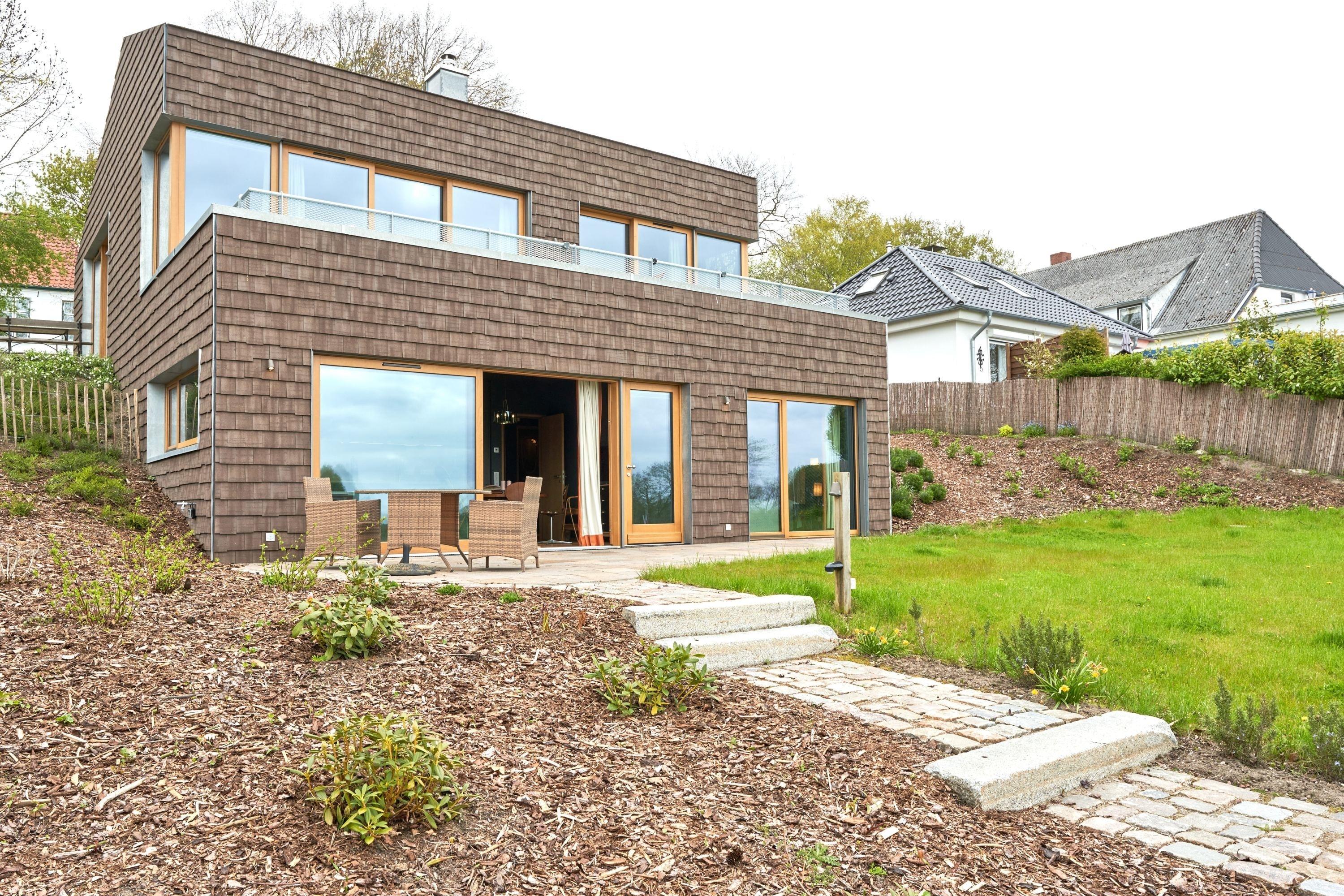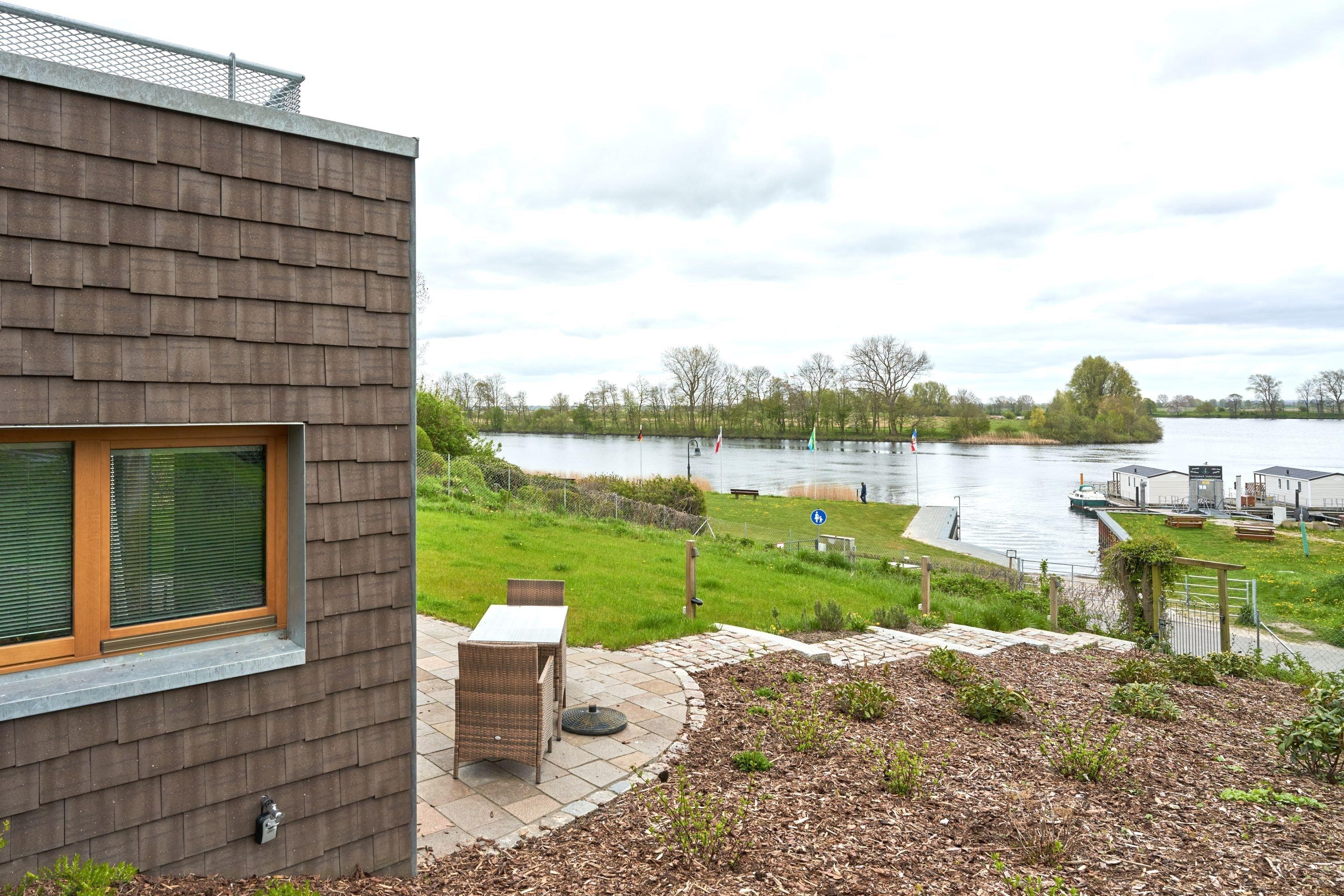 Über die gesamte Hausbreite öffnet sich eine großzügige Terrasse in Südausrichtung, mit freiem Blick auf die Eider.