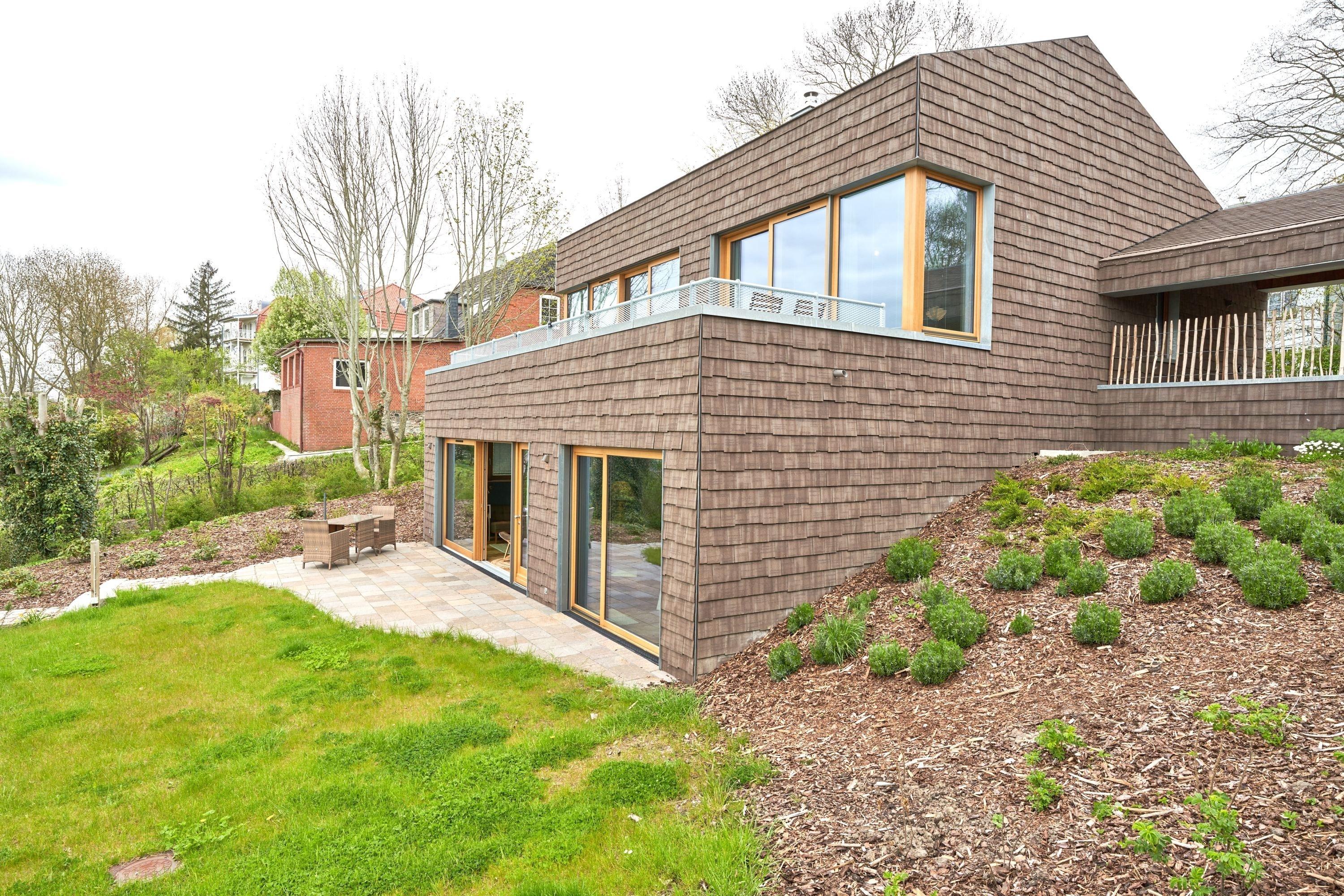 das mit seiner Architektur an einen amerikanischen Bungalow erinnert und durch seinen erdfarbenen Schuppenpanzer aus