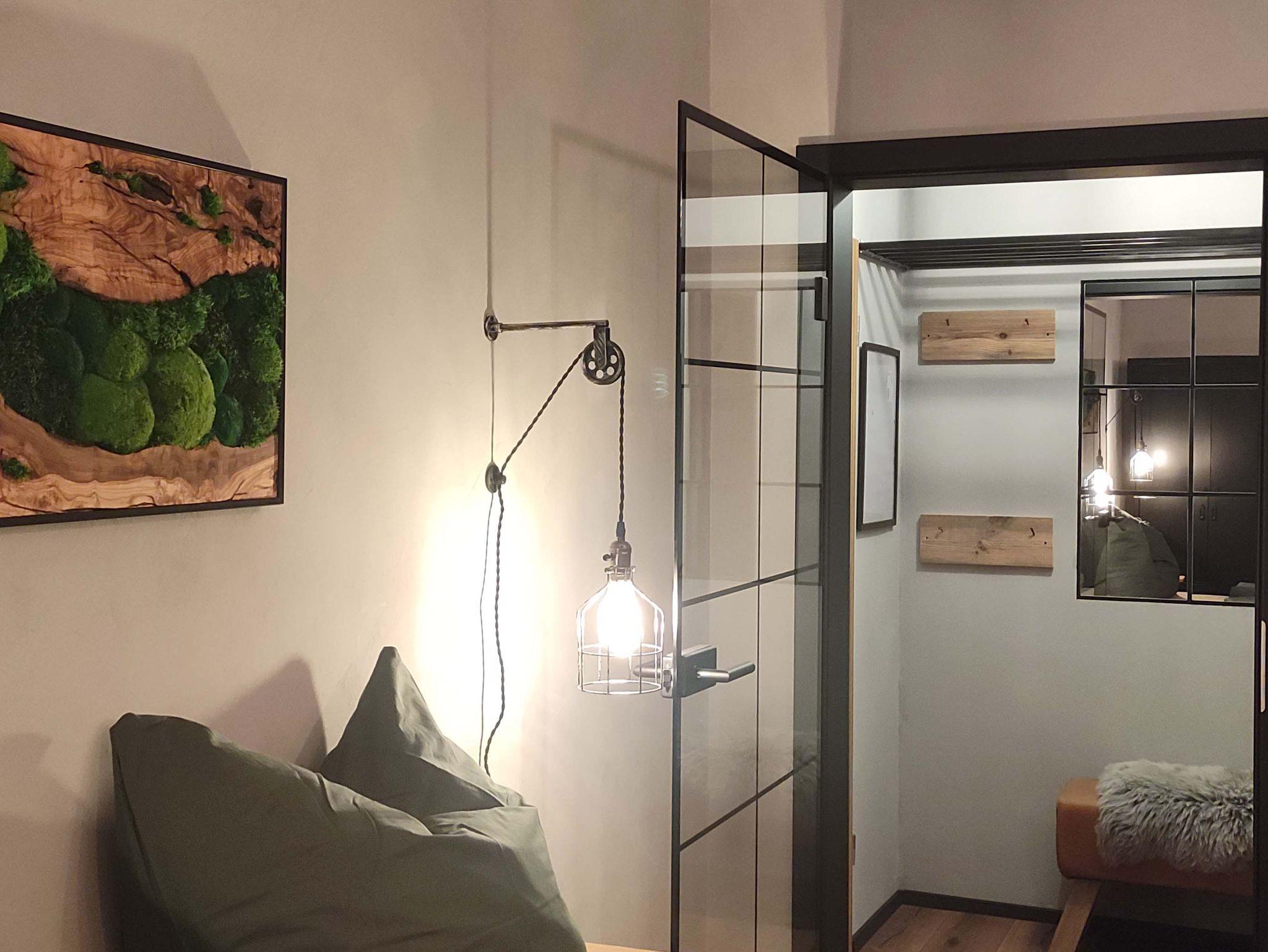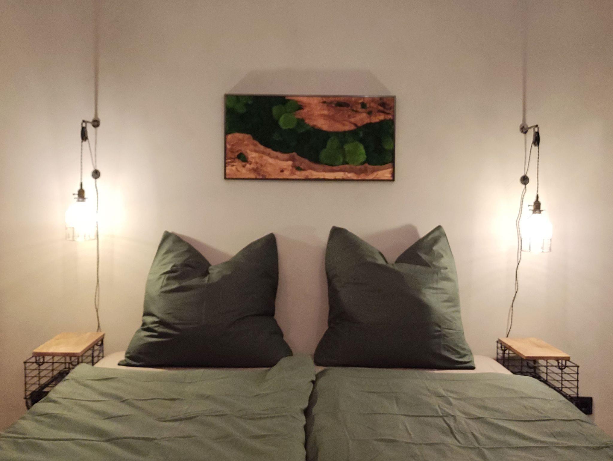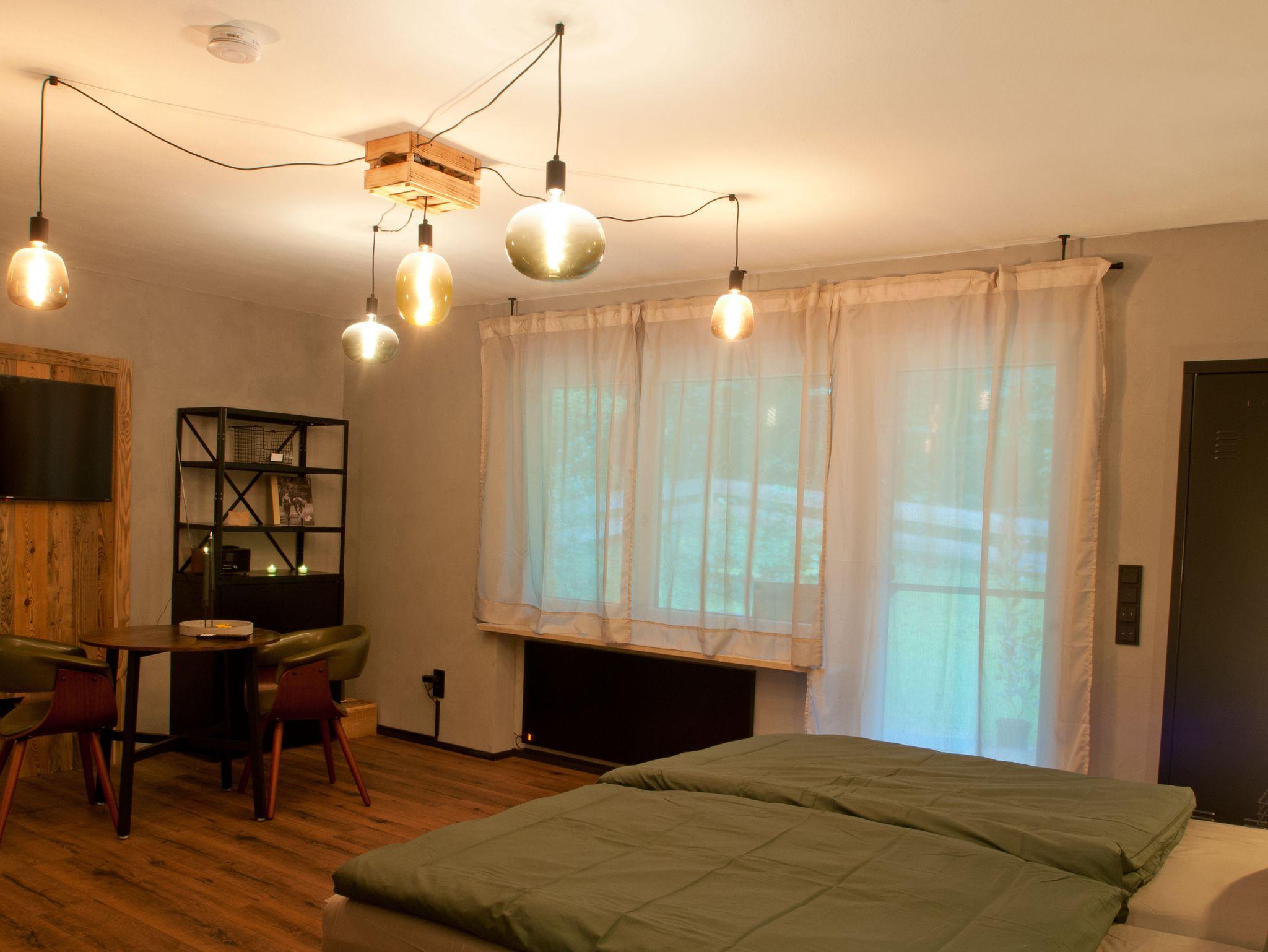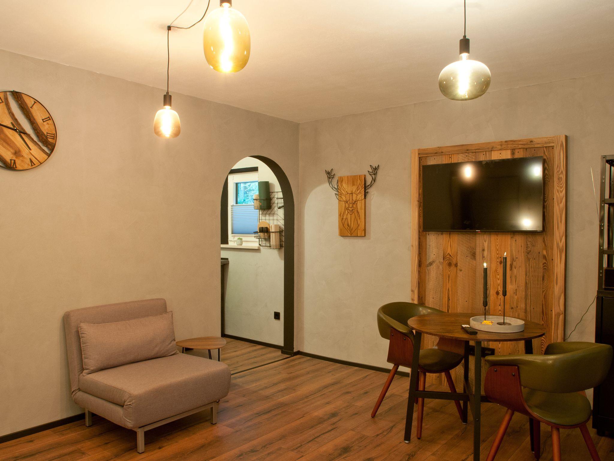 Die Ferienwohnung Waldgeflüster ist ein charmantes 1-Zimmer Appartement mit einer Größe von 34qm, dass sich im Erdgeschoss eines Mehrfamilienhauses am ruhigen Waldrand befindet. Die 12qm große Terrasse lädt zum Entspannen und Genießen der Natur ein. Der Wohn- und schlafraum ist mit zwei zusammengeschobenen Einzelbetten und einem Schlafsessel ausgestattet und schafft eine komfortable Atmosphäre zum Entspannen. Die Wohnung verfügt über eine separate, voll ausgestattete Küche, in der Sie Ihre Mahlzeiten zubereiten können. Das Badezimmer verfügt über eine moderne Dusche, die nach einen langen Tag im Freien zur Erholung einlädt. Die Lage und Ausstattung machen die Wohnung zu einen perfekten Rückzugsort für Naturliebhaber.