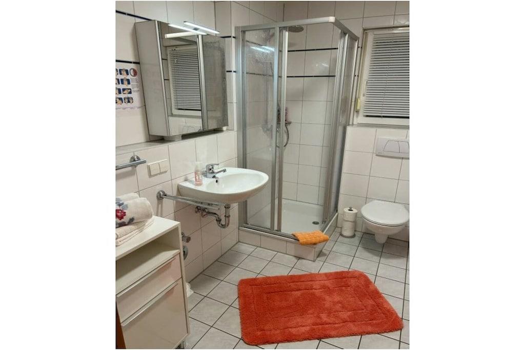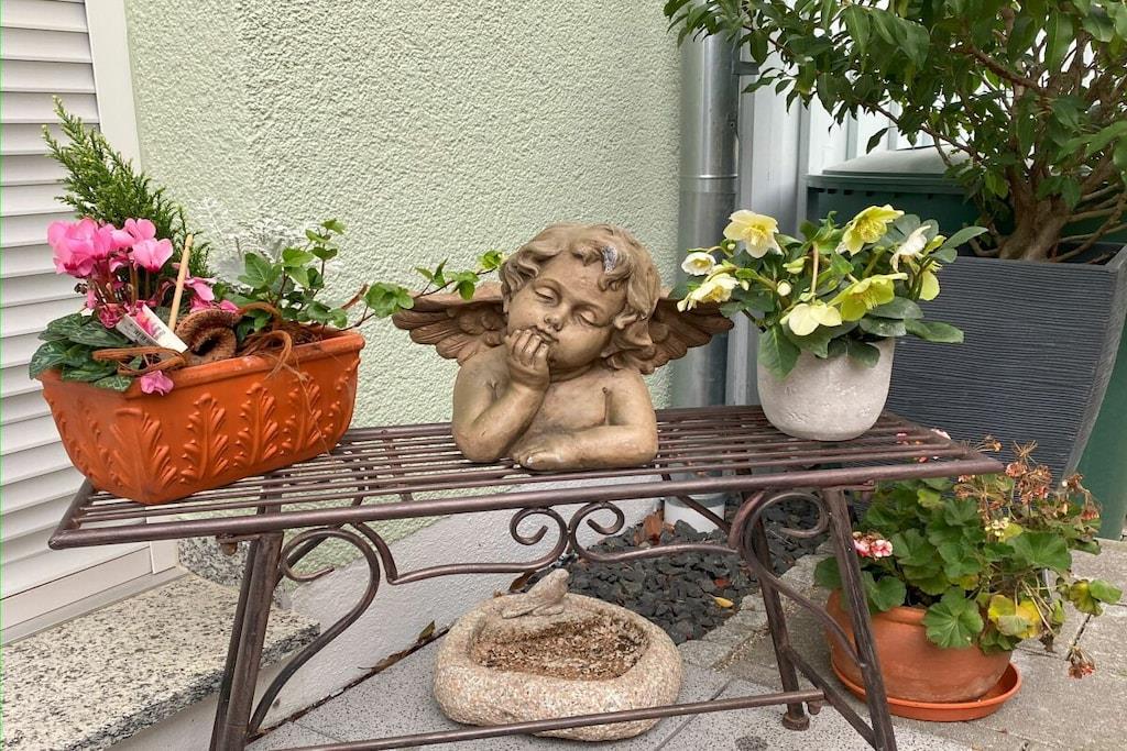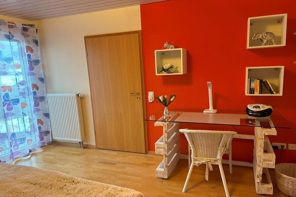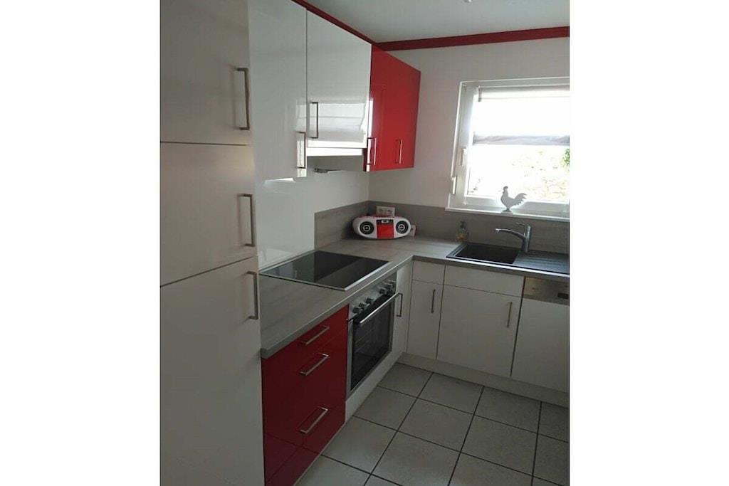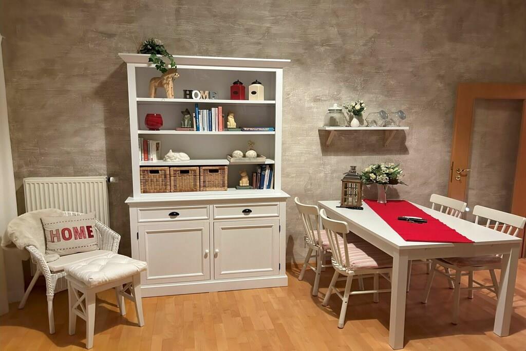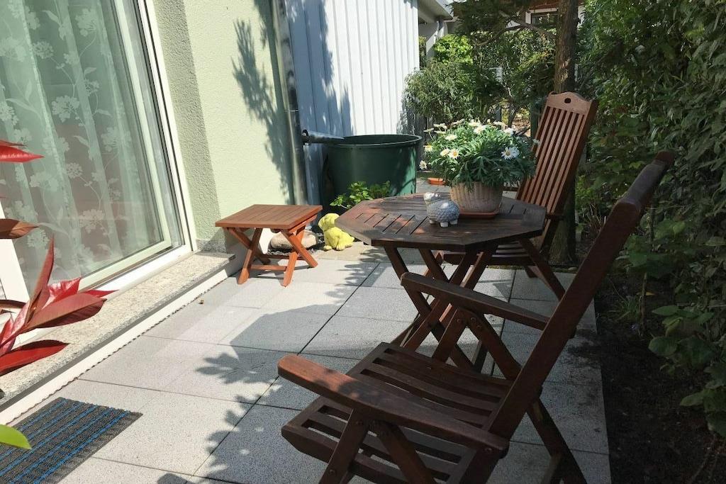A small, comfortably furnished holiday apartment invites you to be our guest. The fitted kitchen, a shower room with toilet and mirrored cabinet, the living room with dining corner, 2 sofa beds opposite each other and an adjoining small terrace can be found on the ground floor. A wooden staircase leads you from the bright living room, furnished in Scandinavian style, to the 1st floor and to the gallery, which gives you a clear view of the lower living room. From here you reach the spacious bedroom, with a double bed, wardrobe and desk, where you can work, read or retreat in peace if you wish. The car can be parked on the street. We offer a lockable shed for your bicycles.