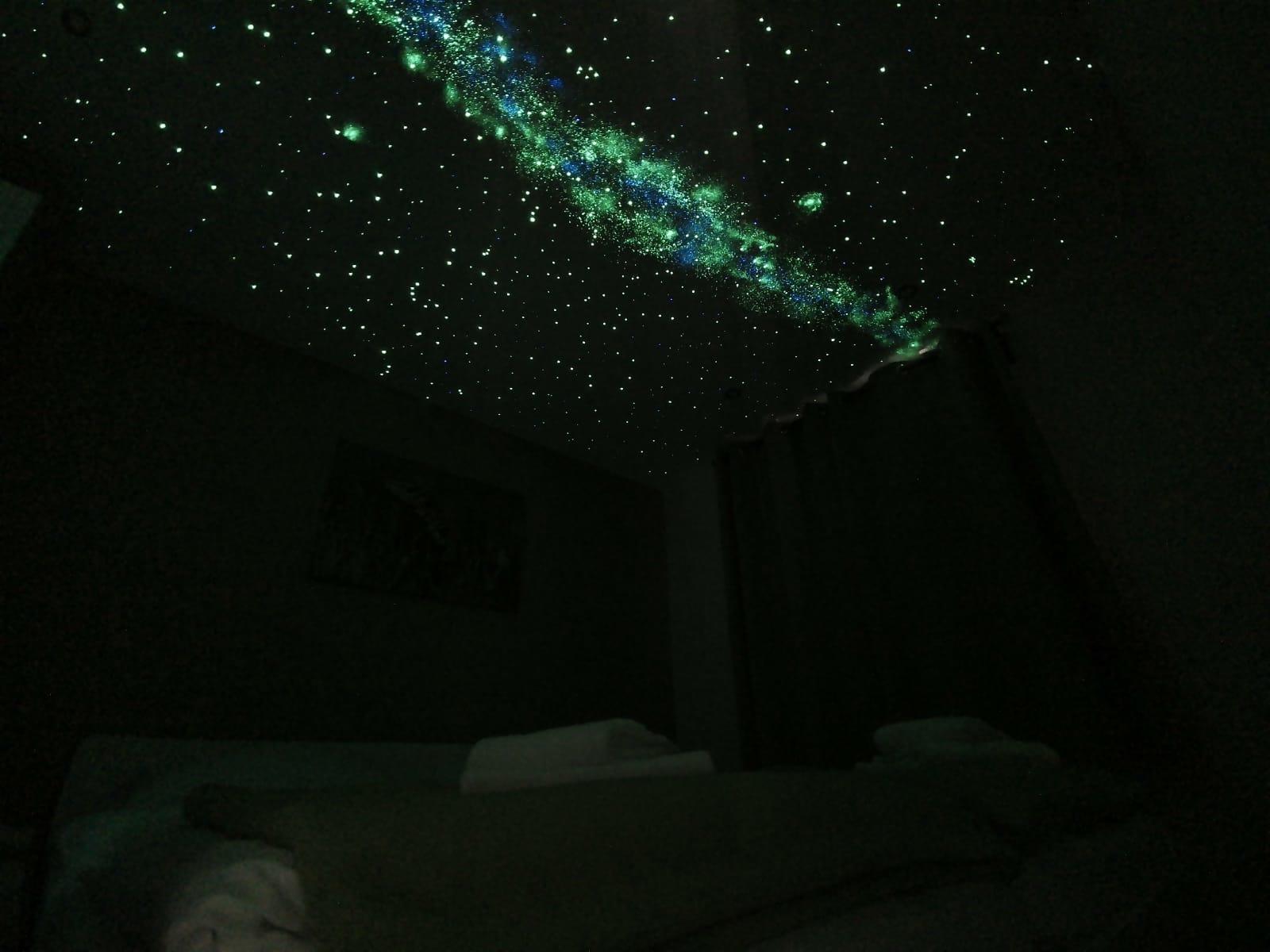 Das einzigartige Highlight des Ferienhauses , ist der nachtleuchtende Sternenhimmel an der Zimmerdecke des großen Schlafzimmers. Es erwarten Sie die Winter-Sternenbilder mit der Milchstraße und mehr.
