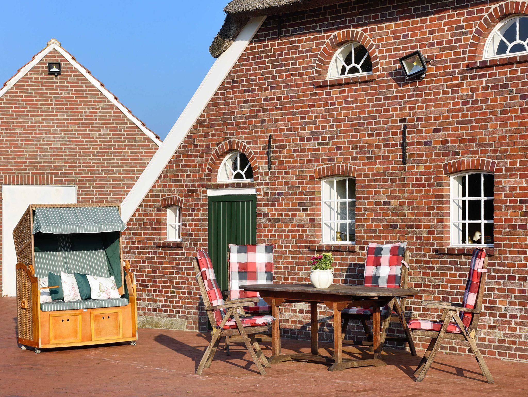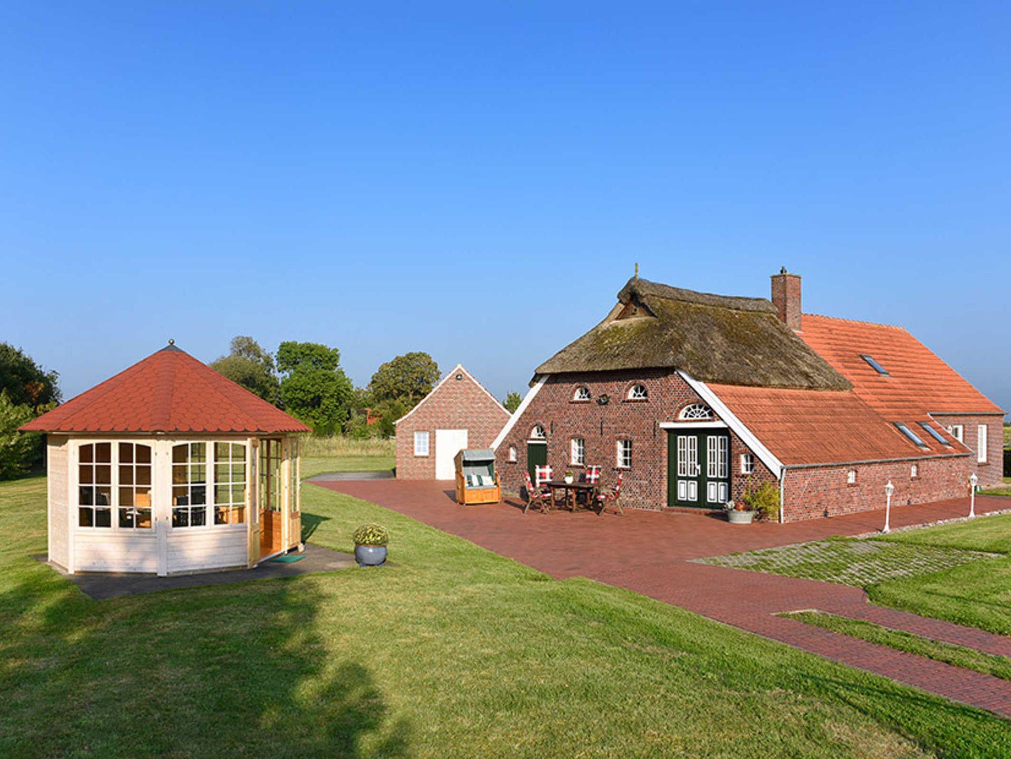 Am Haus direkt an der Ferienwohnung gibt es den Gästepavillion mit Grill und Gartenmöbeln, einen Strandkorb sowie eine grosse Spiel- und Liegewiese mit einem tollen weiten Ausblick auf die Felder rund um das Haus und auf Sonnenauf- und -untergang ? gerade zur Morgen- und Abenddämmerung sind auch oft Wildtiere zu beobachten! Terrasse und Garten sind ideal geeignet, mal so richtig faul in der Sonne zu sitzen oder bei einer Tasse Tee ? denn hier ist ja Ostfriesland ? endlich einmal ein gutes Buch zu lesen.