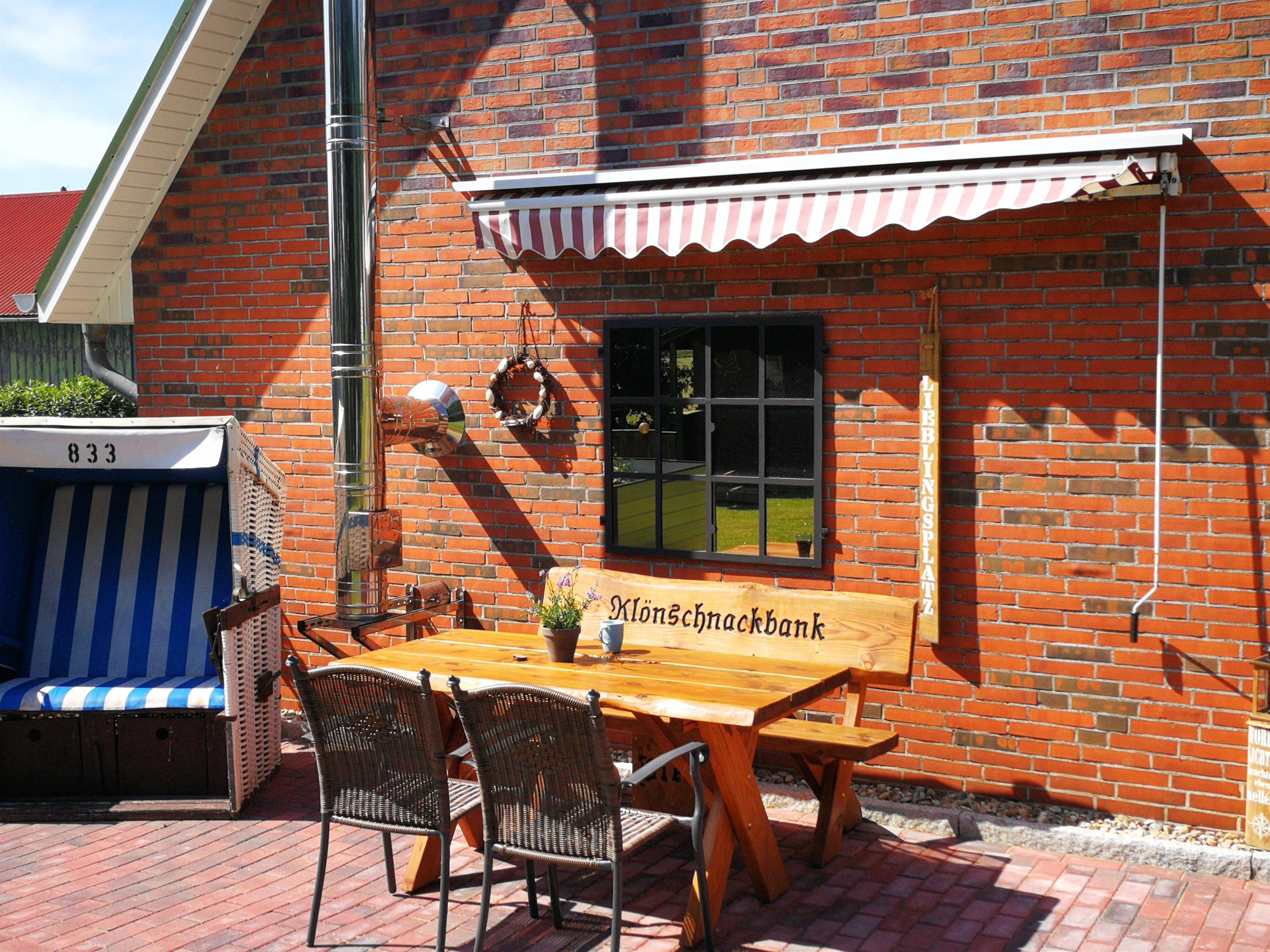 Platz findet ihr auch im großen Garten mit Klönschnackbank, Liegewiese und Gartenmöbeln zum relaxen.