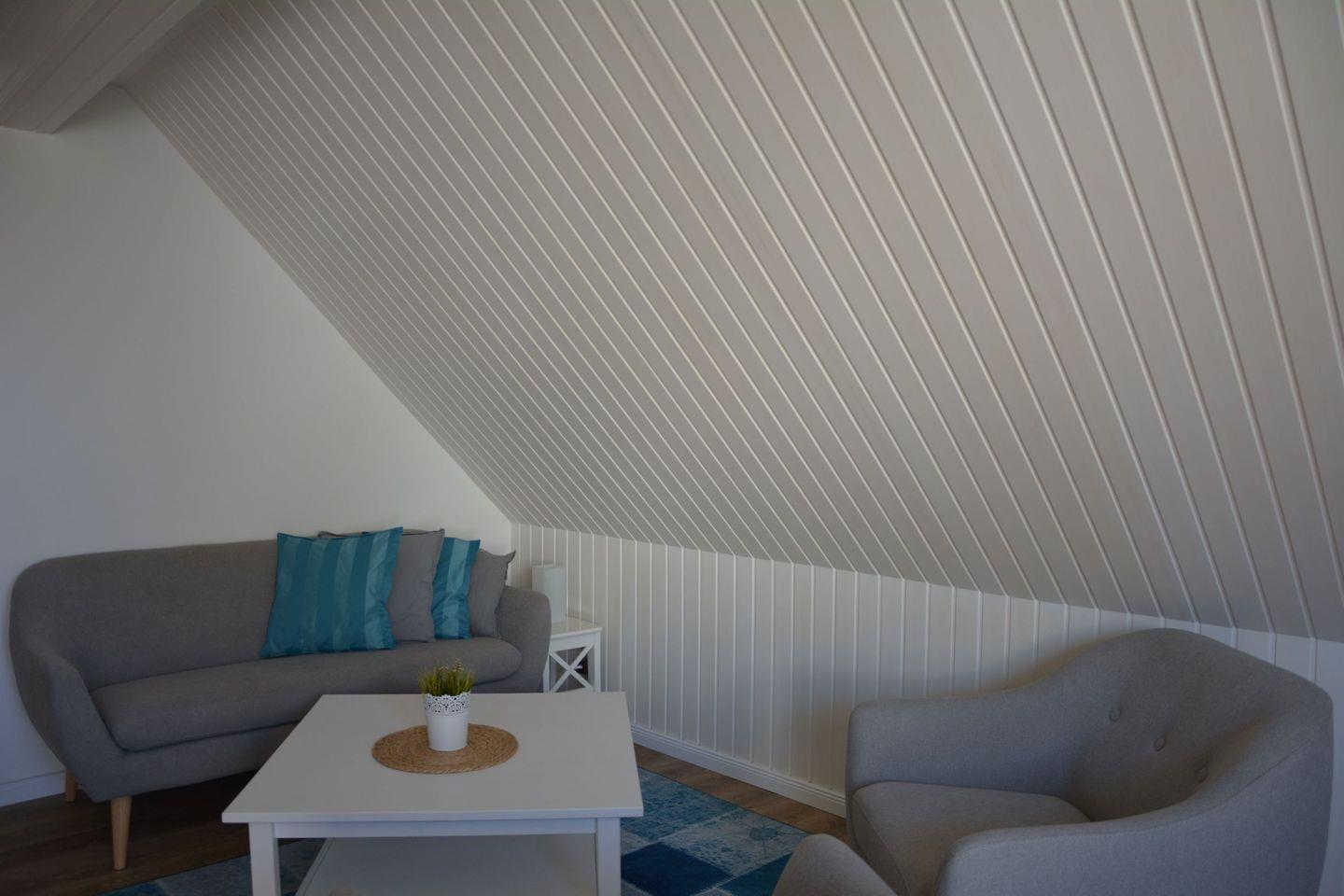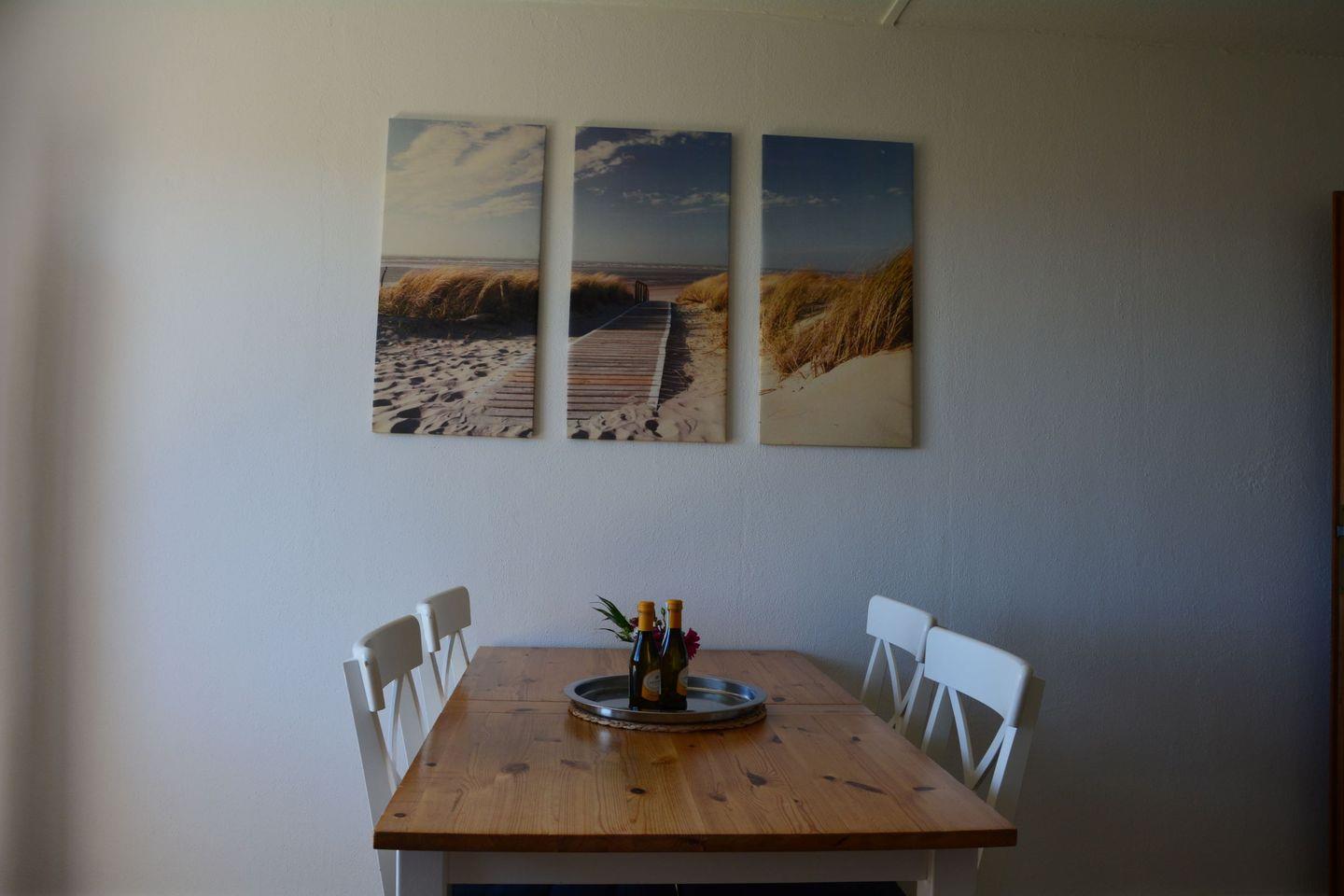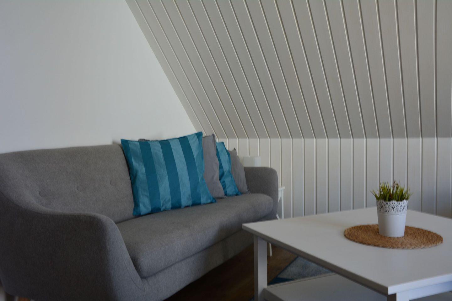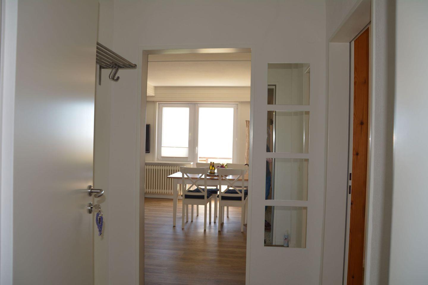 Die Ferienwohnung befindet sich im Obergeschoss eines Ferienhauses. Das Wohn-/Esszimmer hat einen Ausgang zum eigenen Balkon mit Meerblick. In der gut ausgestatteten Küche können sie ihre Mahlzeiten zubereiten. Lassen sie sich dabei vom Blick über das Watt bis nach Föhr und Sylt inspirieren.