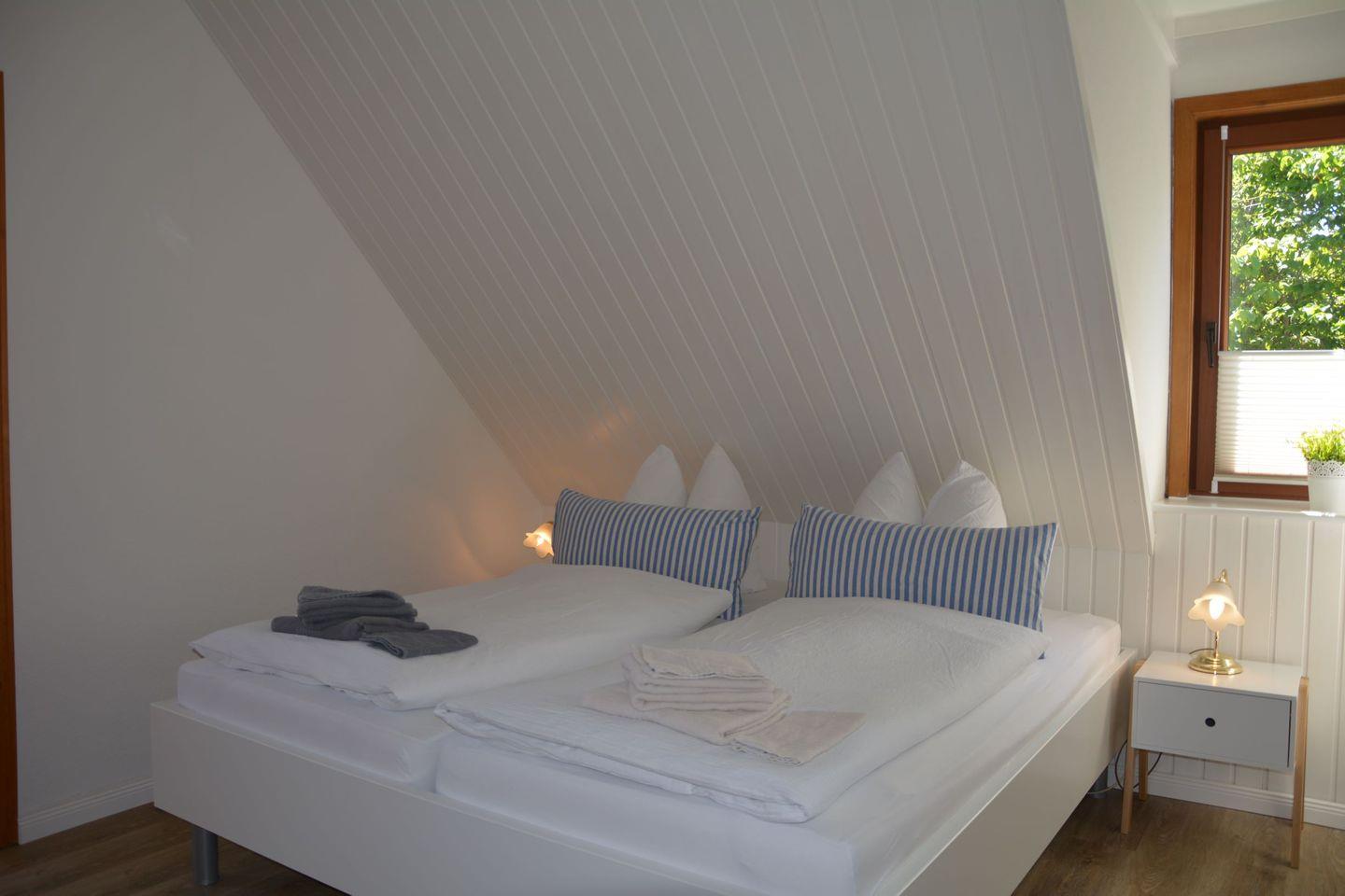 Das große Schlafzimmer ist mit einem Doppelbett ausgestattet und hat direkten Zugang zum Bad. Das daran anschließende Kinderzimmer ist mit 2 Einzelkojen ausgebaut. Ideal für Familien mit Kindern.