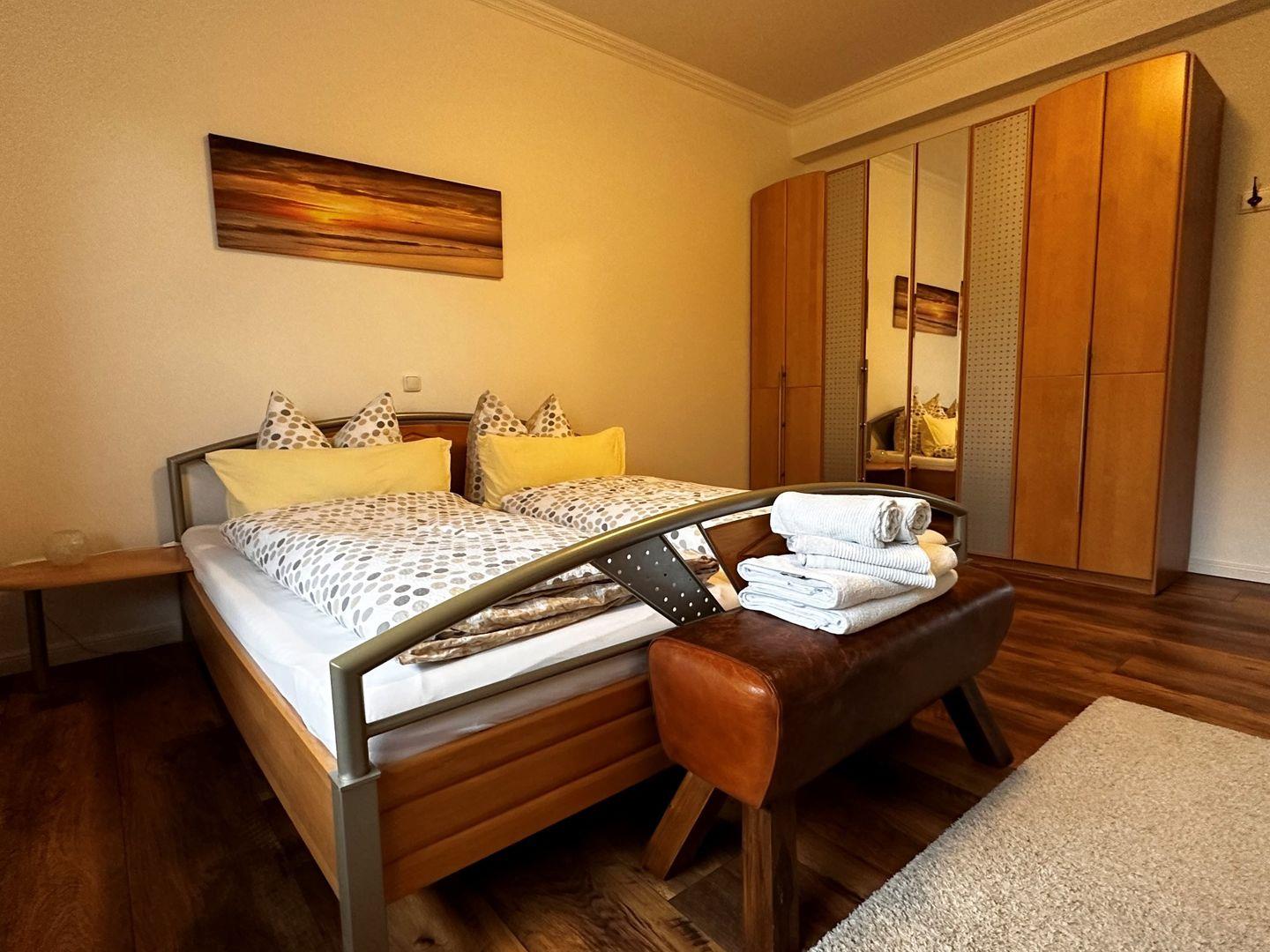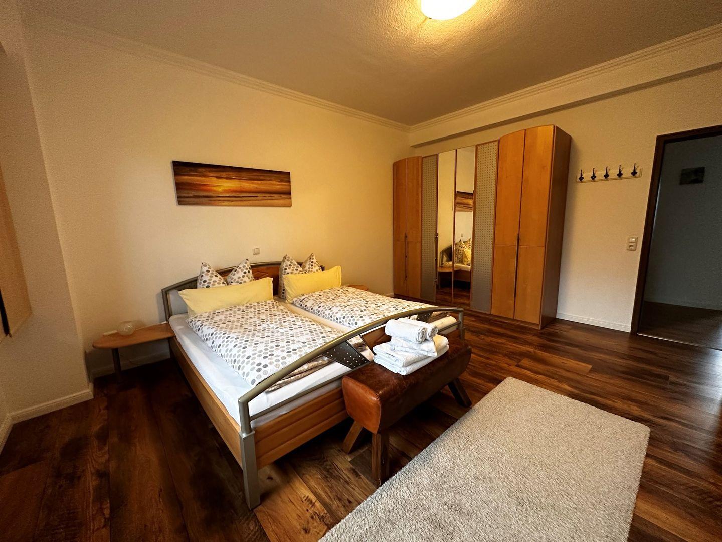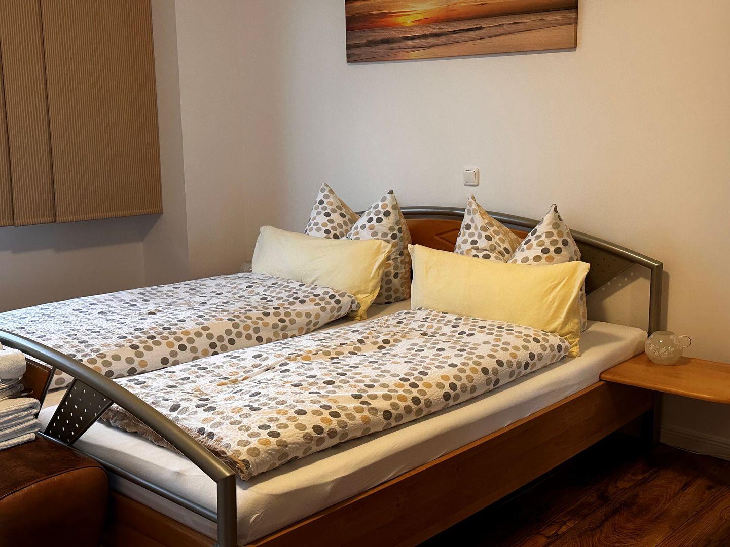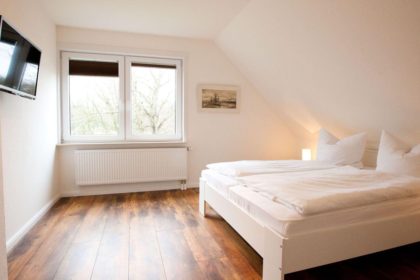 Das grosse Schlafzimmer im OG mit den zwei Einzebetten hat einen vorgelagerten eigenen Wohnraum mit Sofa und TV.