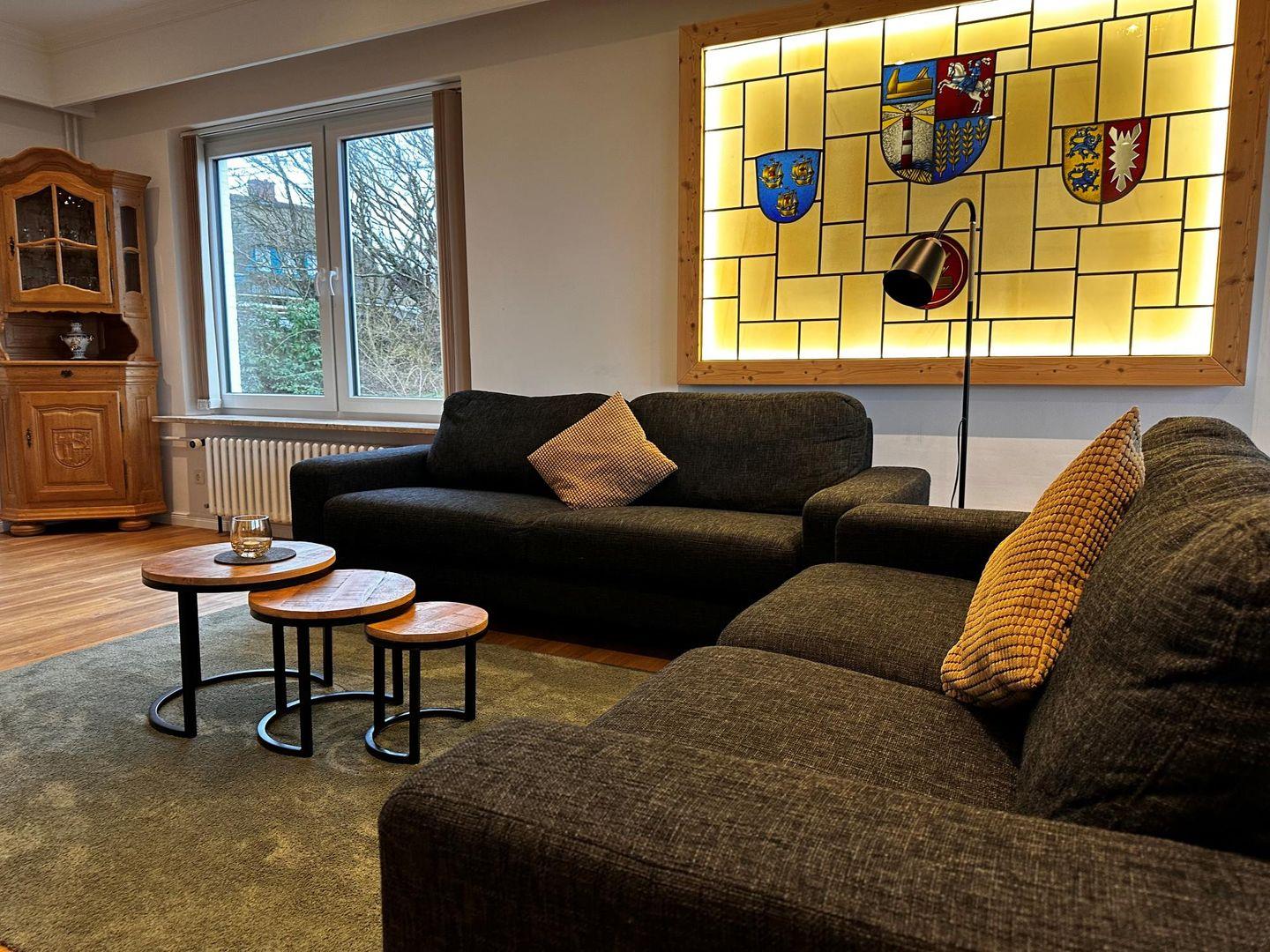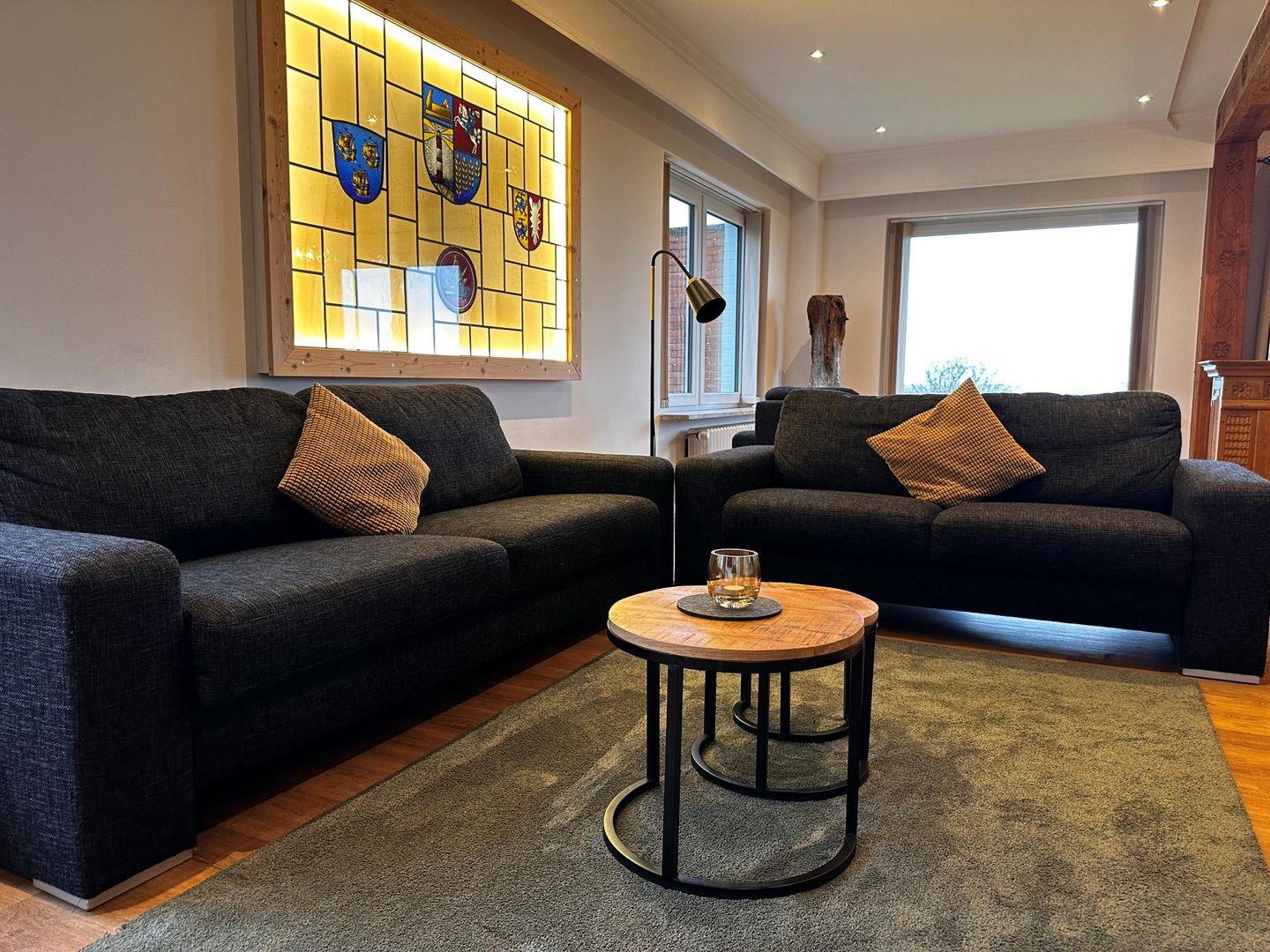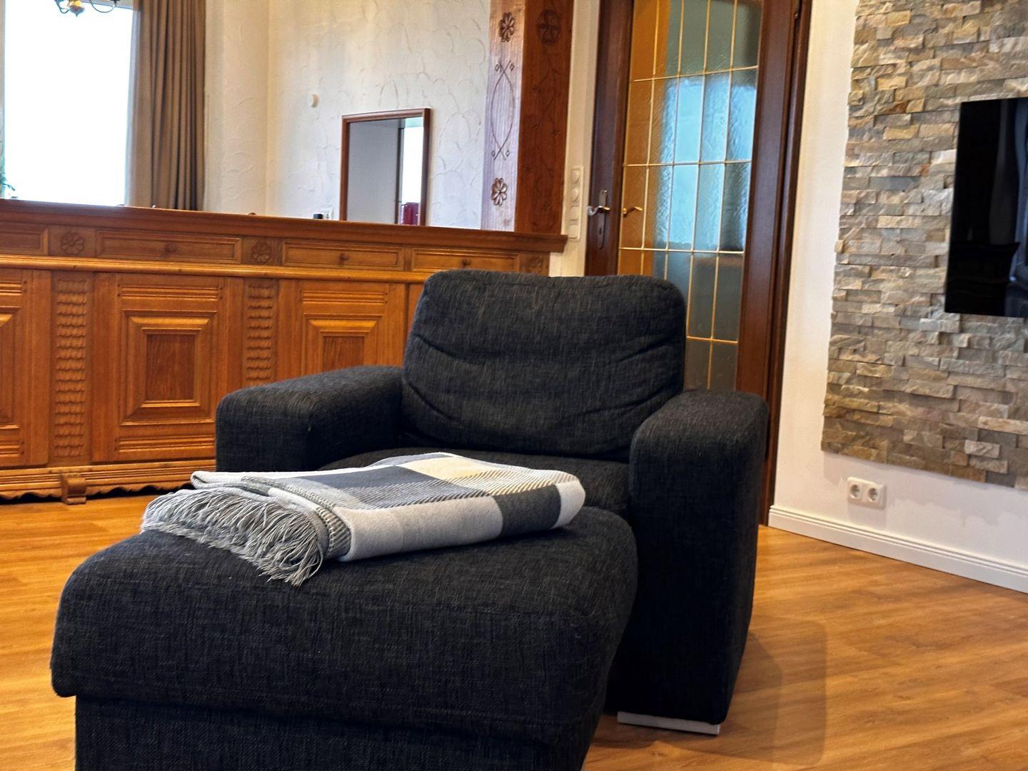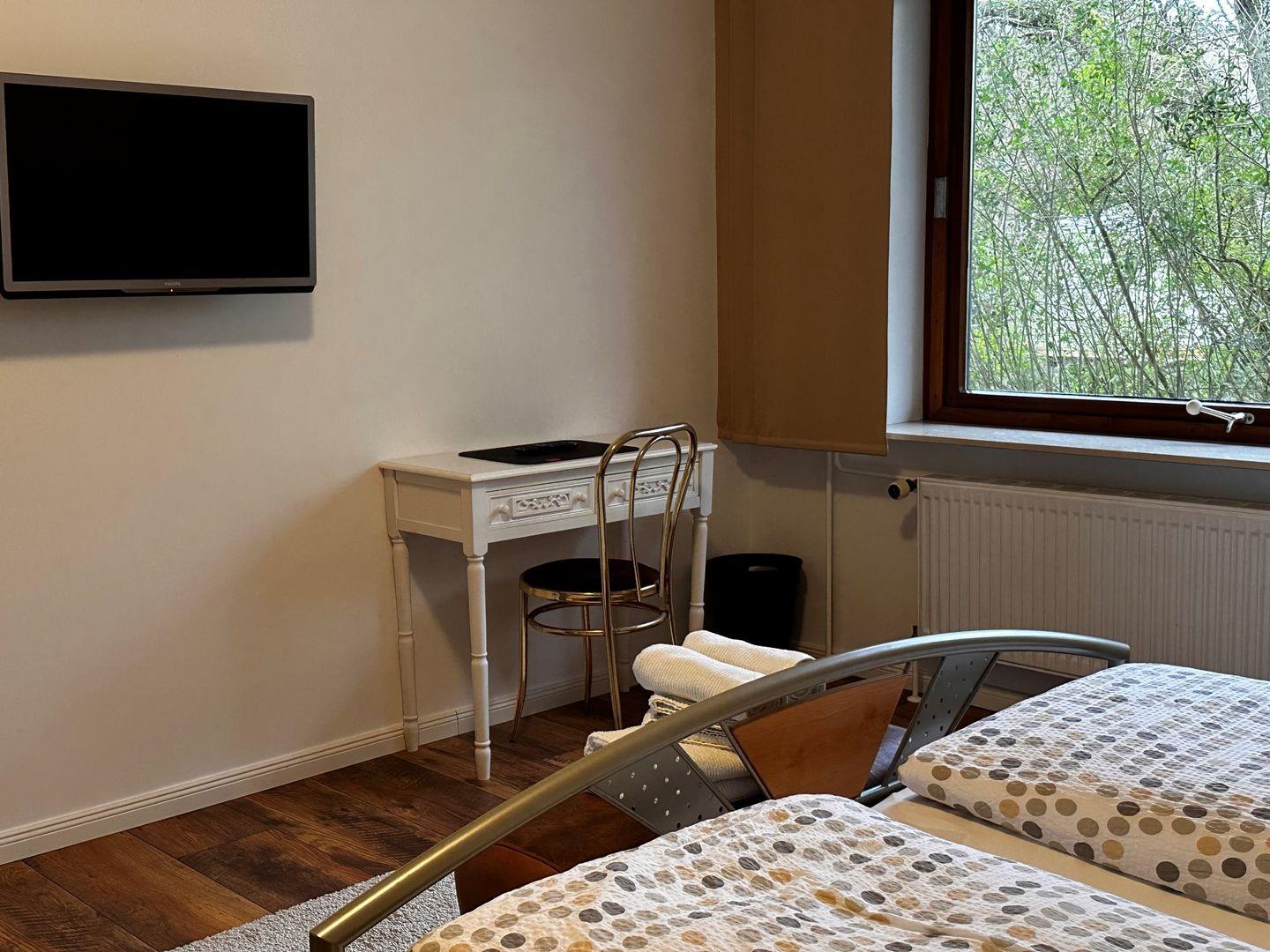 Das grosse Schlafzimmer im OG mit den zwei Einzebetten hat einen vorgelagerten eigenen Wohnraum mit Sofa und TV.