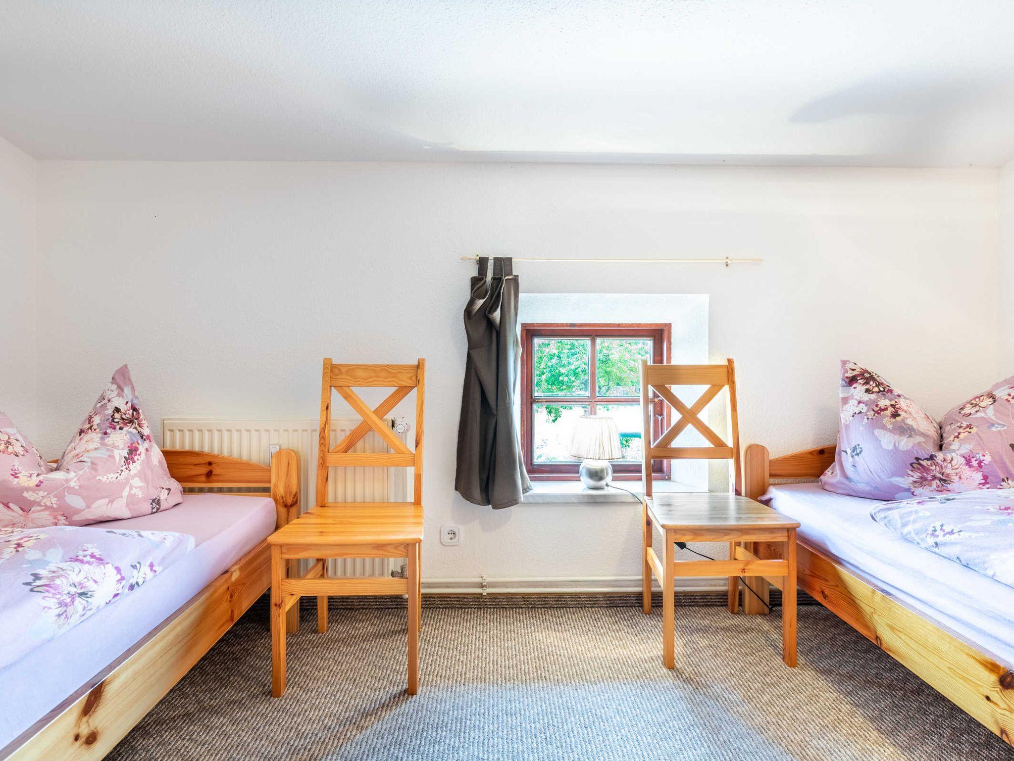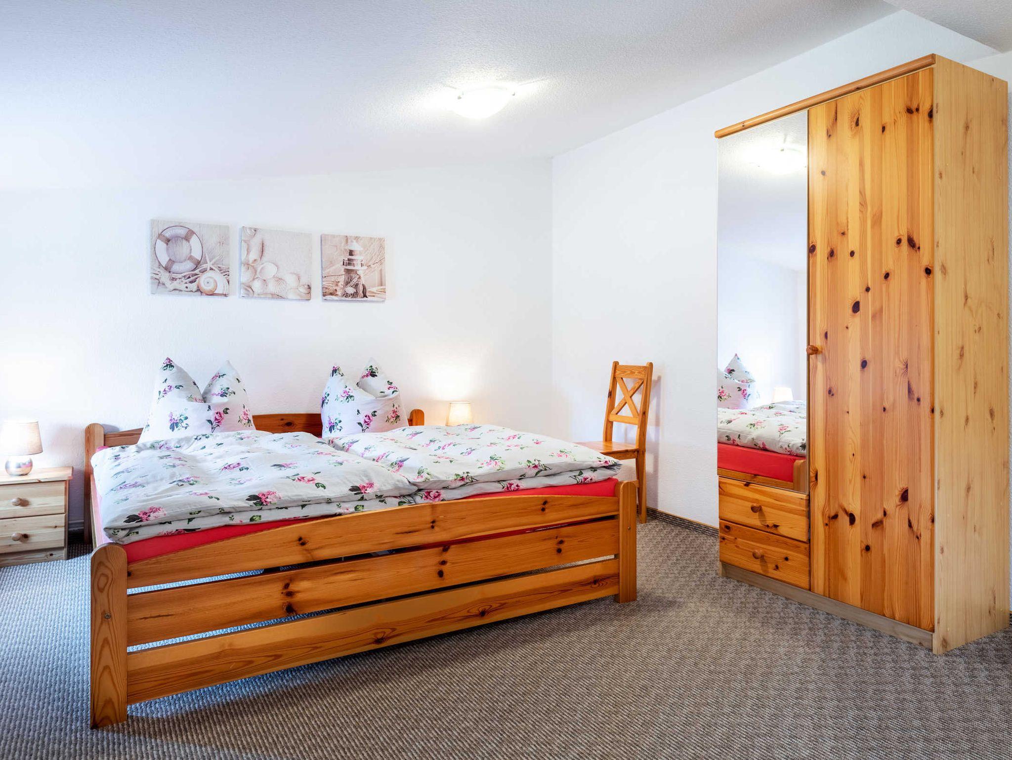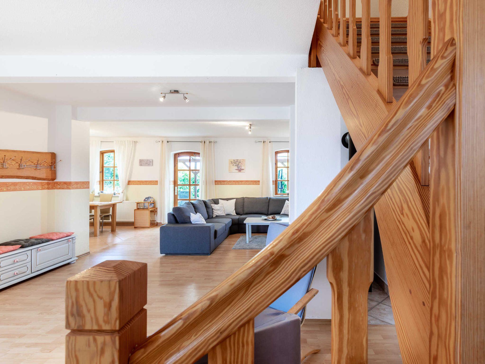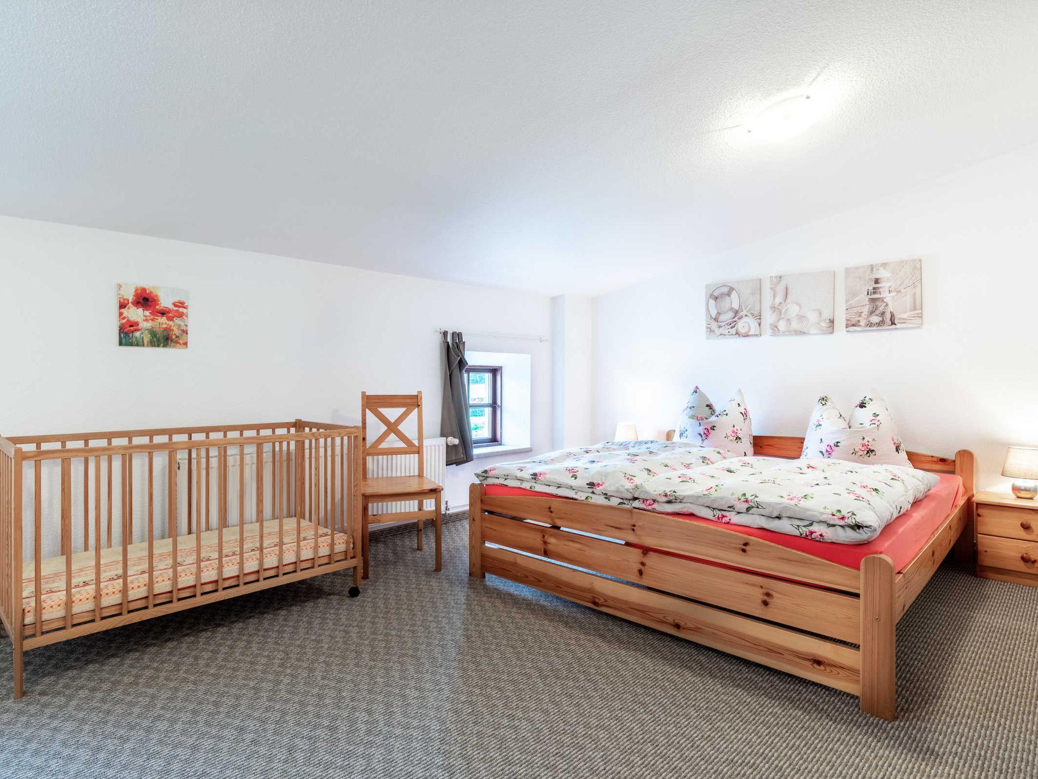 Oberer Bereich. Über eine stabile Treppe erreichen die Gäste den schönen oberen Bereich der Ferienwohnung. Hier befinden sich 3 großzügige separate Schlafzimmer. Schlafzimmer 1 mit Doppelbett und Kleiderschrank, Schlafzimmer 2 mit 2 Einzelbetten und Kleiderschrank. Schlafzimmer 3 mit Doppelbett sowie stabilem Holzkinderbettchen, Kleiderschrank.