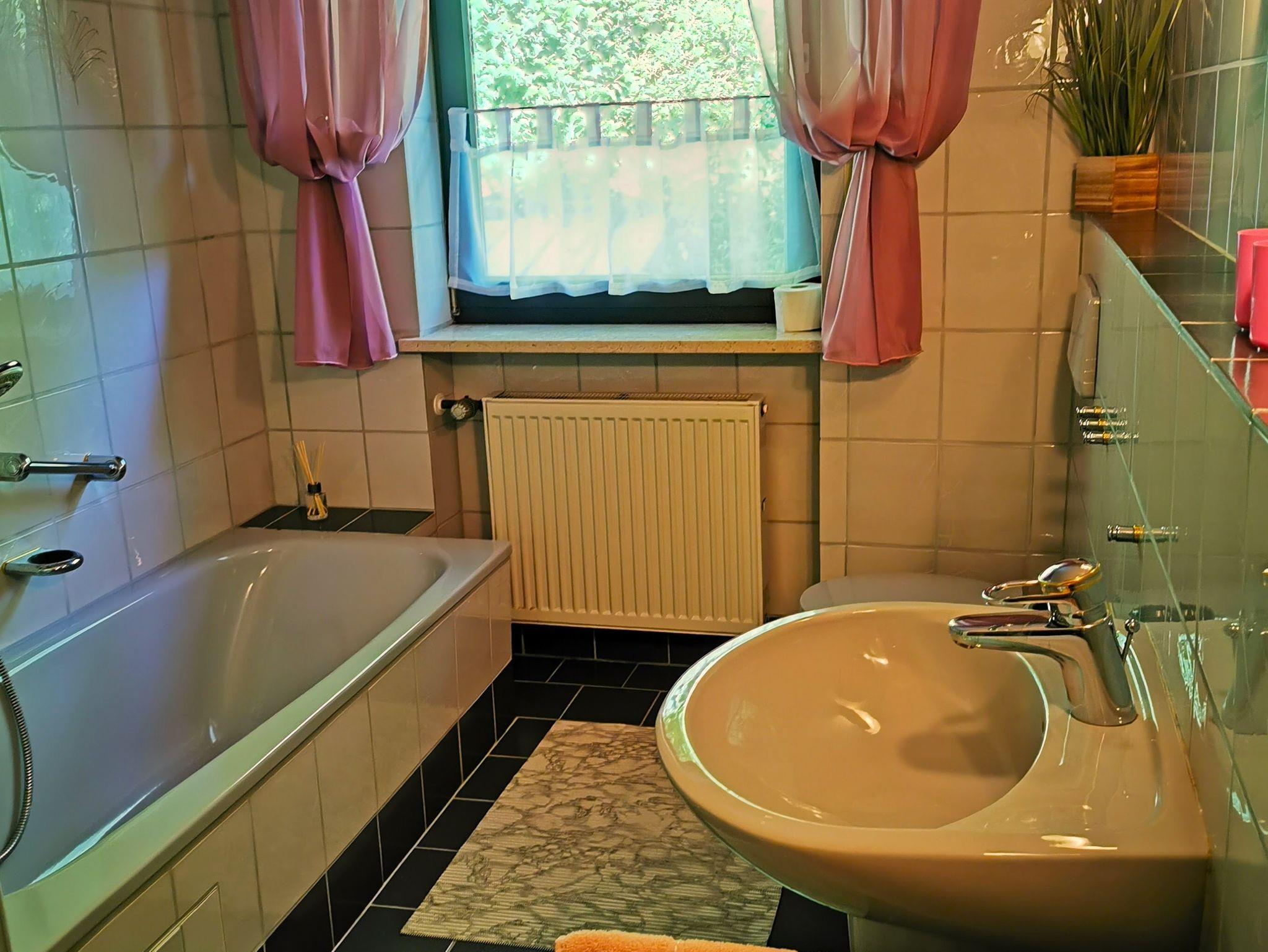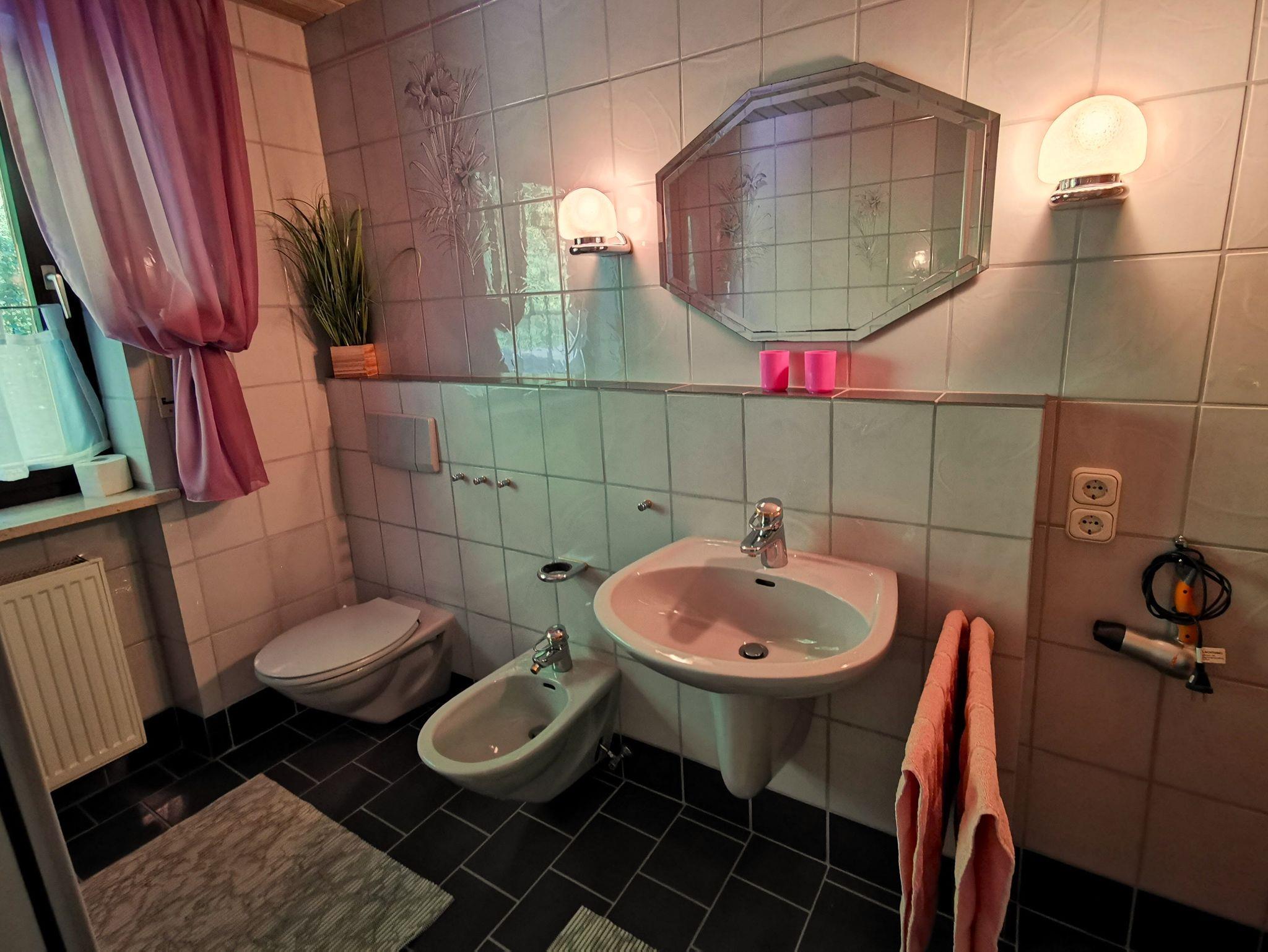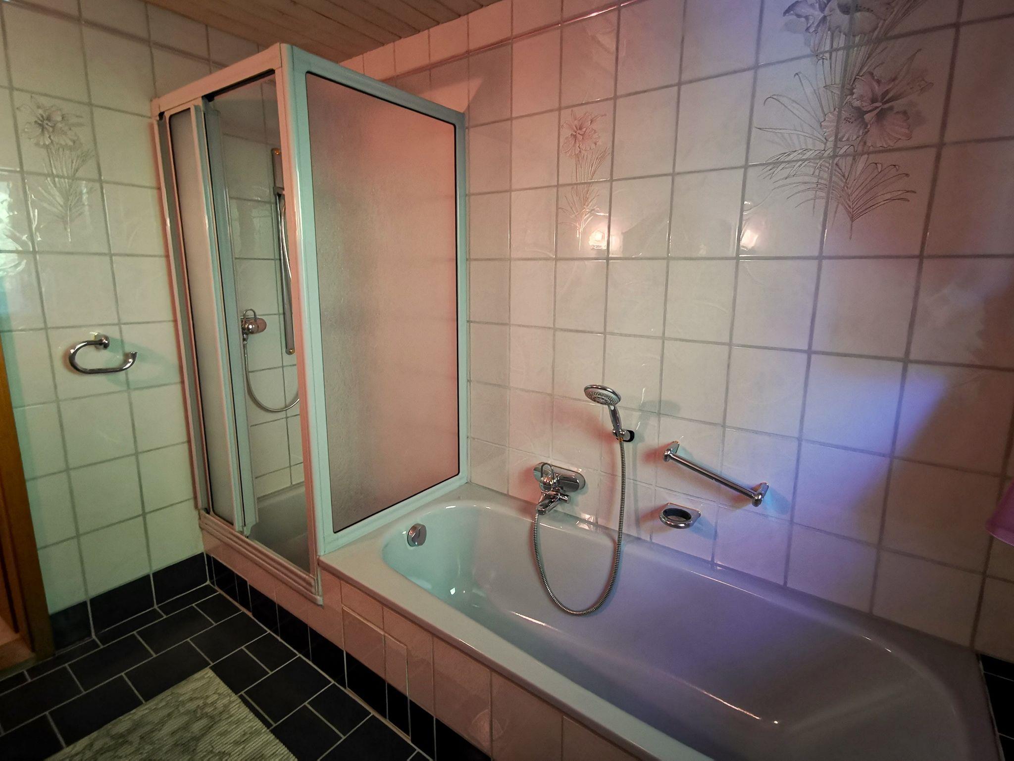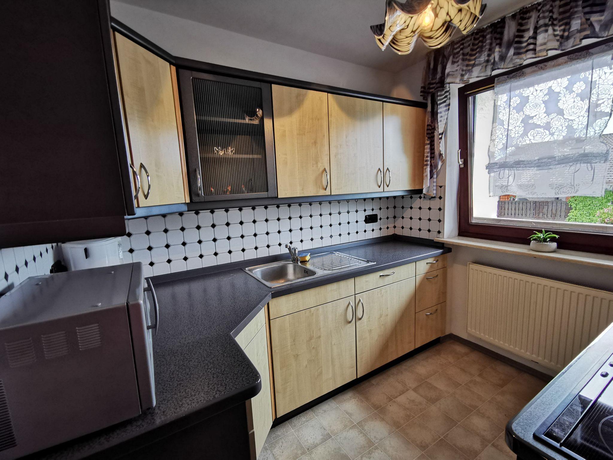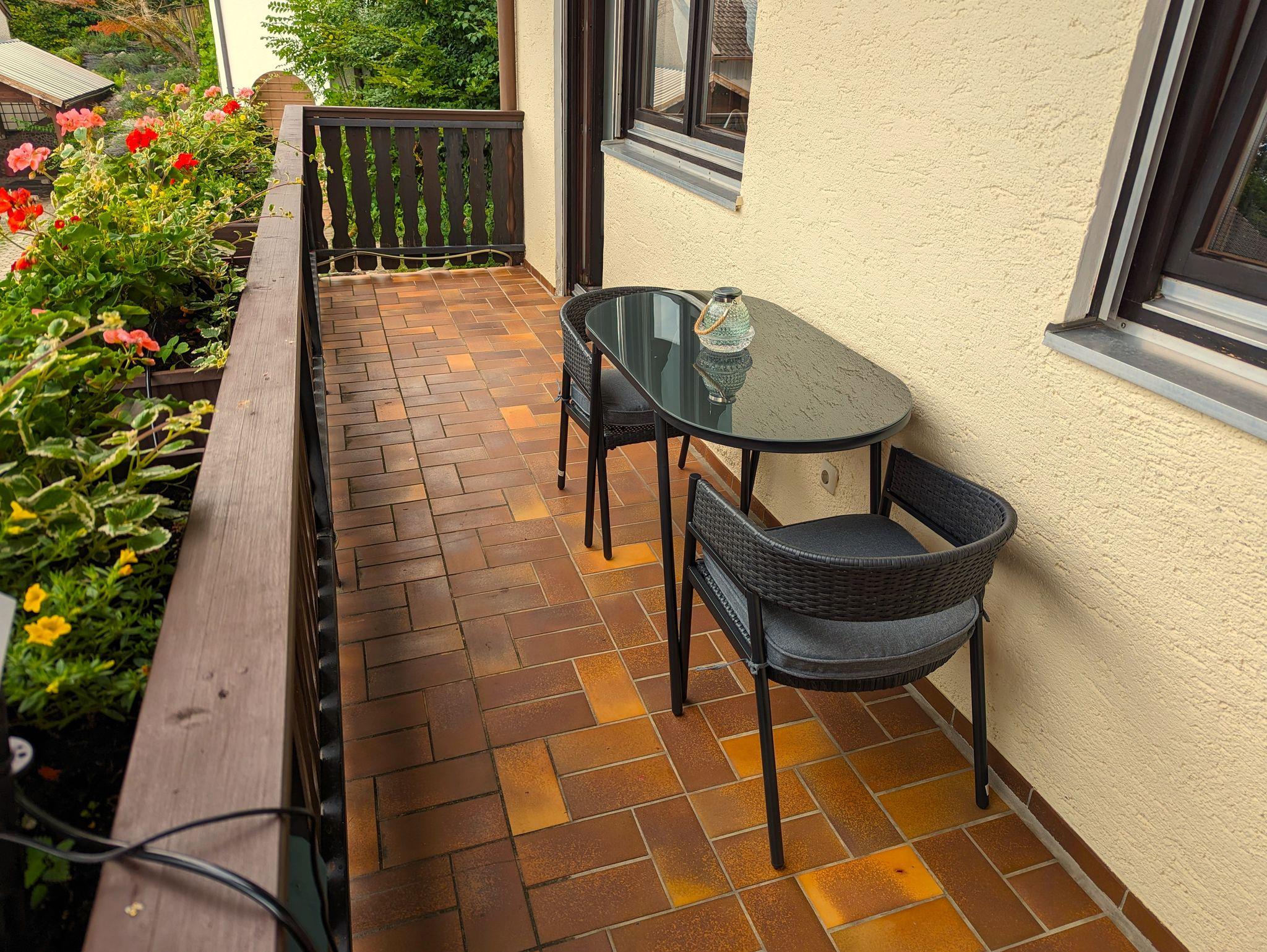 Die Ferienwohnung 1. befindet sich im 1. Stock und bietet ausreichend Platz für 2 Personen (ca. 59 m²). Sie ist ideal für Dienstreisen. Die Wohnung besitzt ein Schlafzimmer mit 2 Einzelbetten und einen kleinen Balkon. Der Wohn- Essbereich bietet eine Schlafcouch, eine Essecke, Kabel-TV und Kachelofen. Das Bad mit Dusche, Badewanne, WC, Bidet und Waschbecken besitzt auch einen Fön. WLAN ist kostenlos. Die kleine gut ausgestattete Küche mit einer Microwelle lädt zum Kochen ein. Eine Waschmaschine und ein Trockner sind vorhanden.