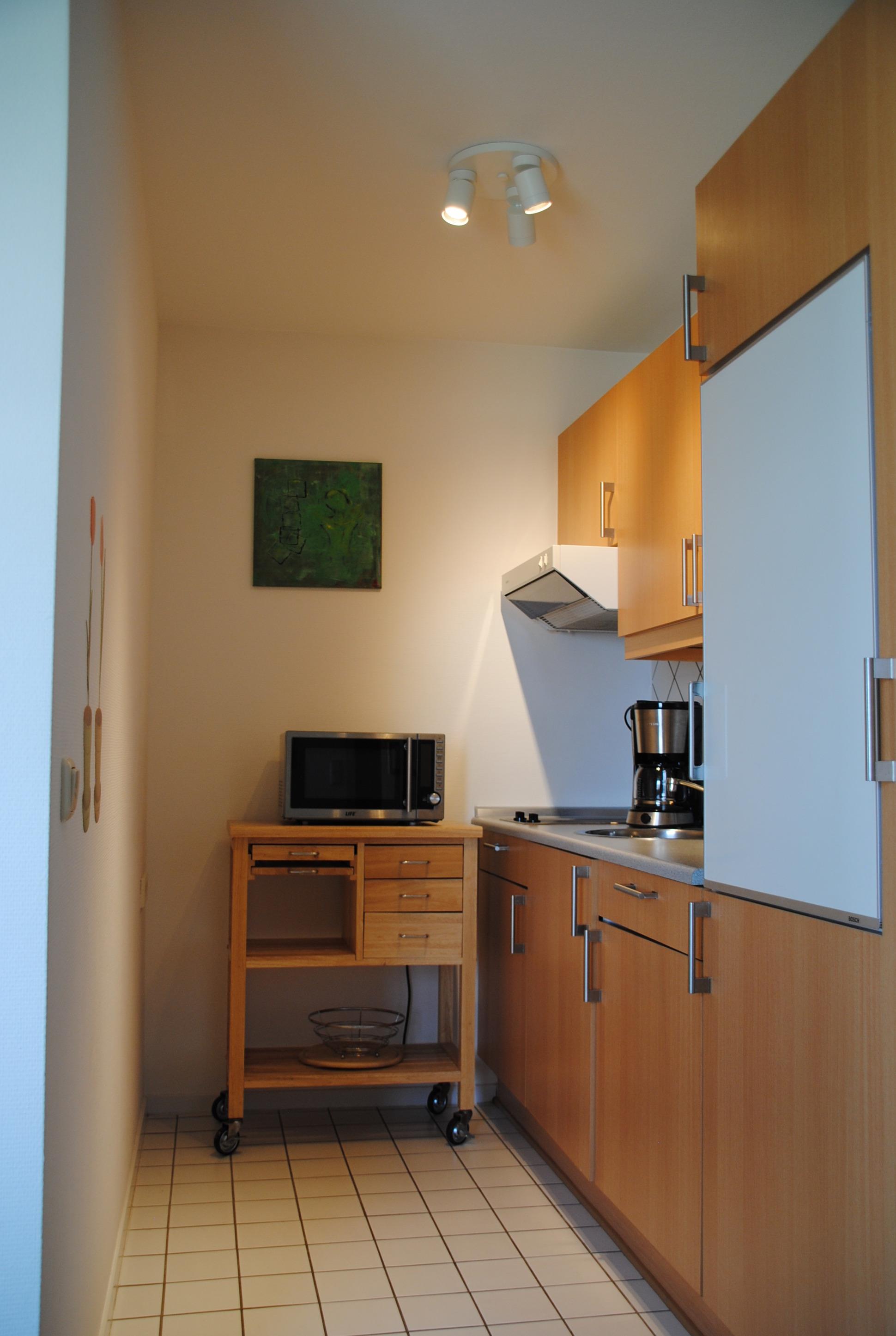 Das Appartement hat eine Größe von 47 qm und bietet bis zu 4 Personen Platz. Der kombinierte Schlaf- und Wohnbereich ist hell und modern eingerichtet und gerade renoviert. Die separate Küchenzeile ist mit Mikrowelle, Wasserkocher und Kaffeemaschine gut eingerichtet. Das moderne Badezimmer bietet neben Toilette und großem Waschbecken, eine Badewanne mit Duschmöglichkeit, viel Ablagefläche, sowie Fön und Kosmetikspiegel.