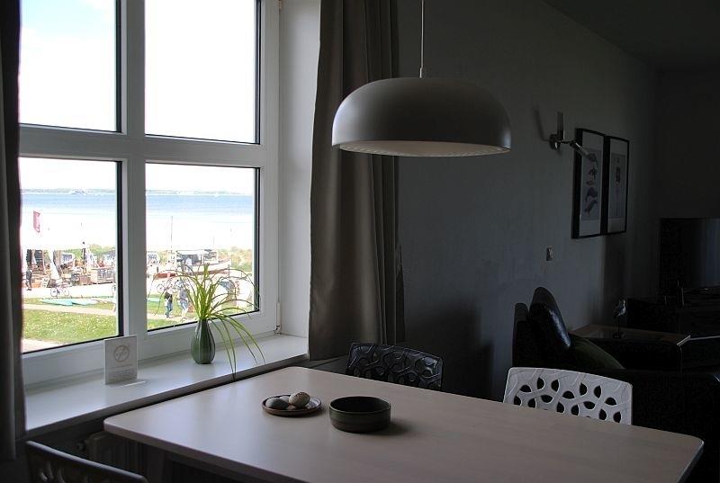 Vom Balkon des Appartements "Fördeblick" genießen Sie den ganzen Tag den Blick auf den Strand und die schöne Kieler Förde.