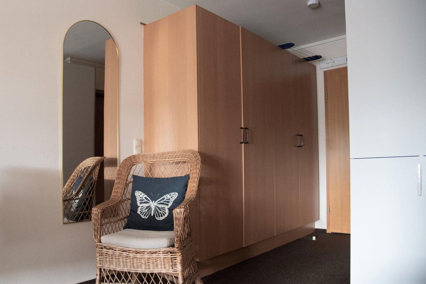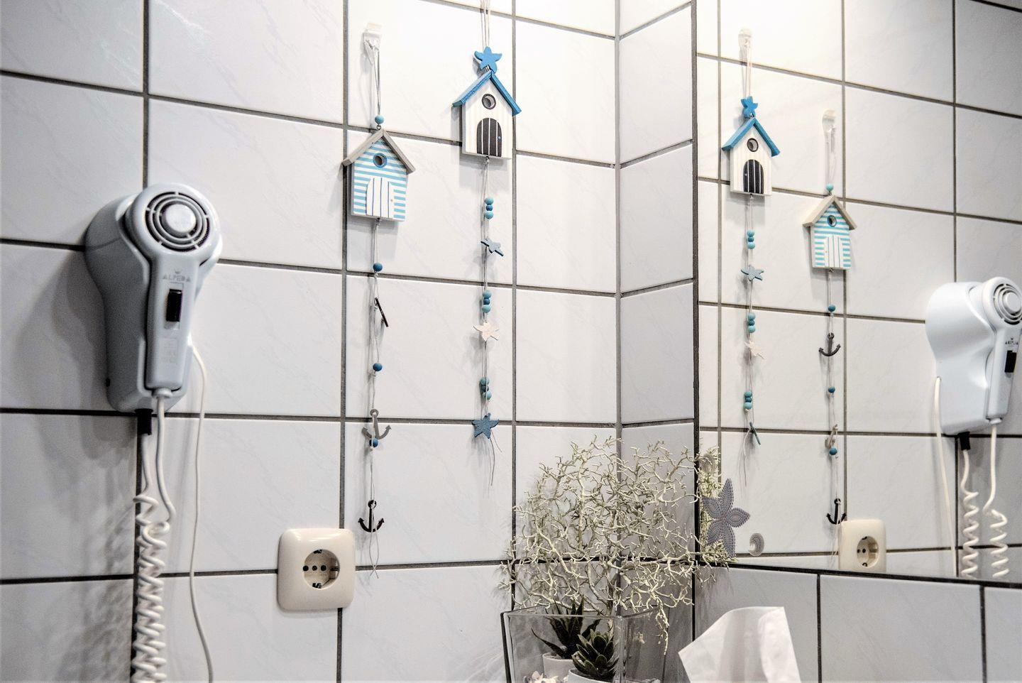 Im Badezimmer stehen Ihnen Dusche mit Badewanne, WC, Waschbecken, Spiegel und Kosmetikspiegel sowie Haartrockner und warmes Wasser zur Verfügung. Für den Alltag praktisch: Gemeinschaftliche Waschmaschinen- und Trocknernutzung, Wäscheständer, Bügelbrett und Bügeleisen. Ein Safe, Ganzkörperspiegel, Staubsauger, Verbandskasten und Rauchmelder ergänzen die Ausstattung.