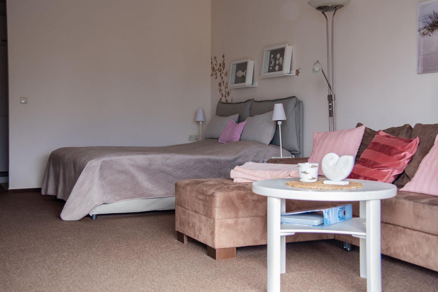 Der Wohnbereich ist mit Teppichboden ausgestattet und kombiniert Sofaecke und Essbereich zu einem angenehmen Mittelpunkt für Ihren Aufenthalt. Für Unterhaltung stehen Ihnen ein TV (44–55 Zoll) mit digitalem Anschluss, eine HiFi-Anlage, Radio, CD- und DVD-Spieler sowie Bücher zur Verfügung. Internet und WLAN sind vorhanden. Sichtschutz an allen Fenstern sorgt für Privatsphäre.
