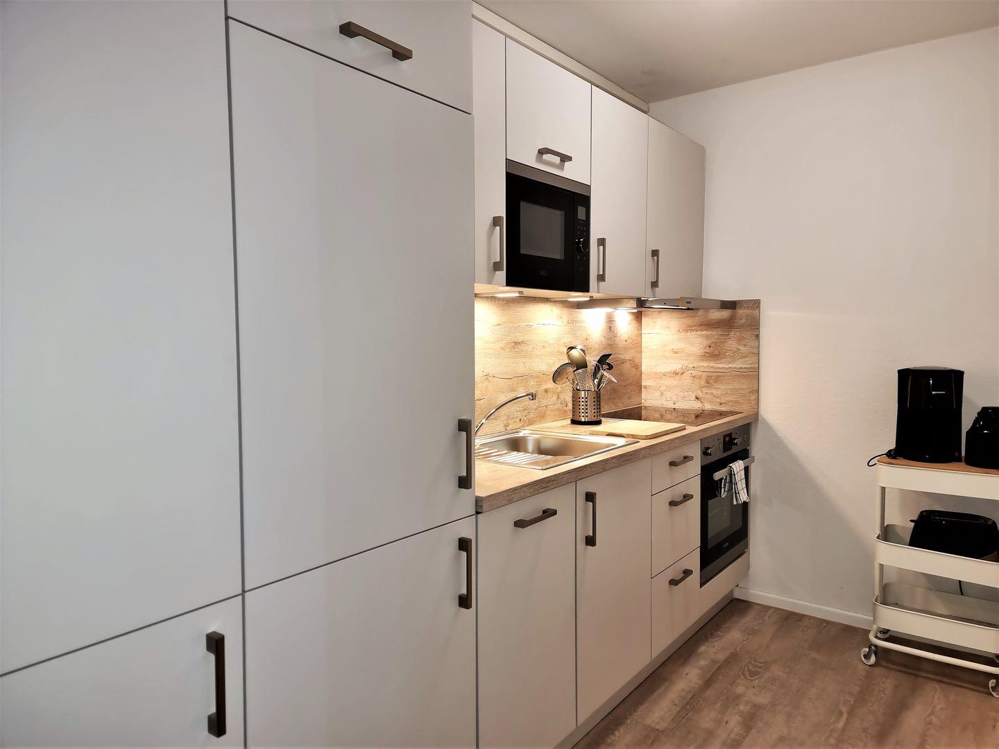 Die offene Küche ist zum Wohnzimmer hin gestaltet und gut ausgestattet für die Selbstversorgung: Ceranherd, Backofen (Elektro), Mikrowelle, Spülmaschine, Kühlschrank mit Gefrierfach, Kaffeemaschine, Wasserkocher, Toaster, Mixer sowie Küchenutensilien, Geschirr und Besteck. Geschirrhandtücher und Abfalleimer sind ebenfalls vorhanden.