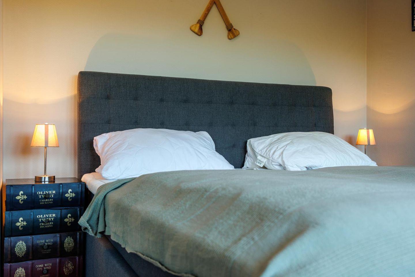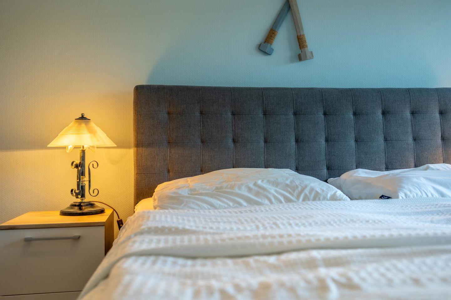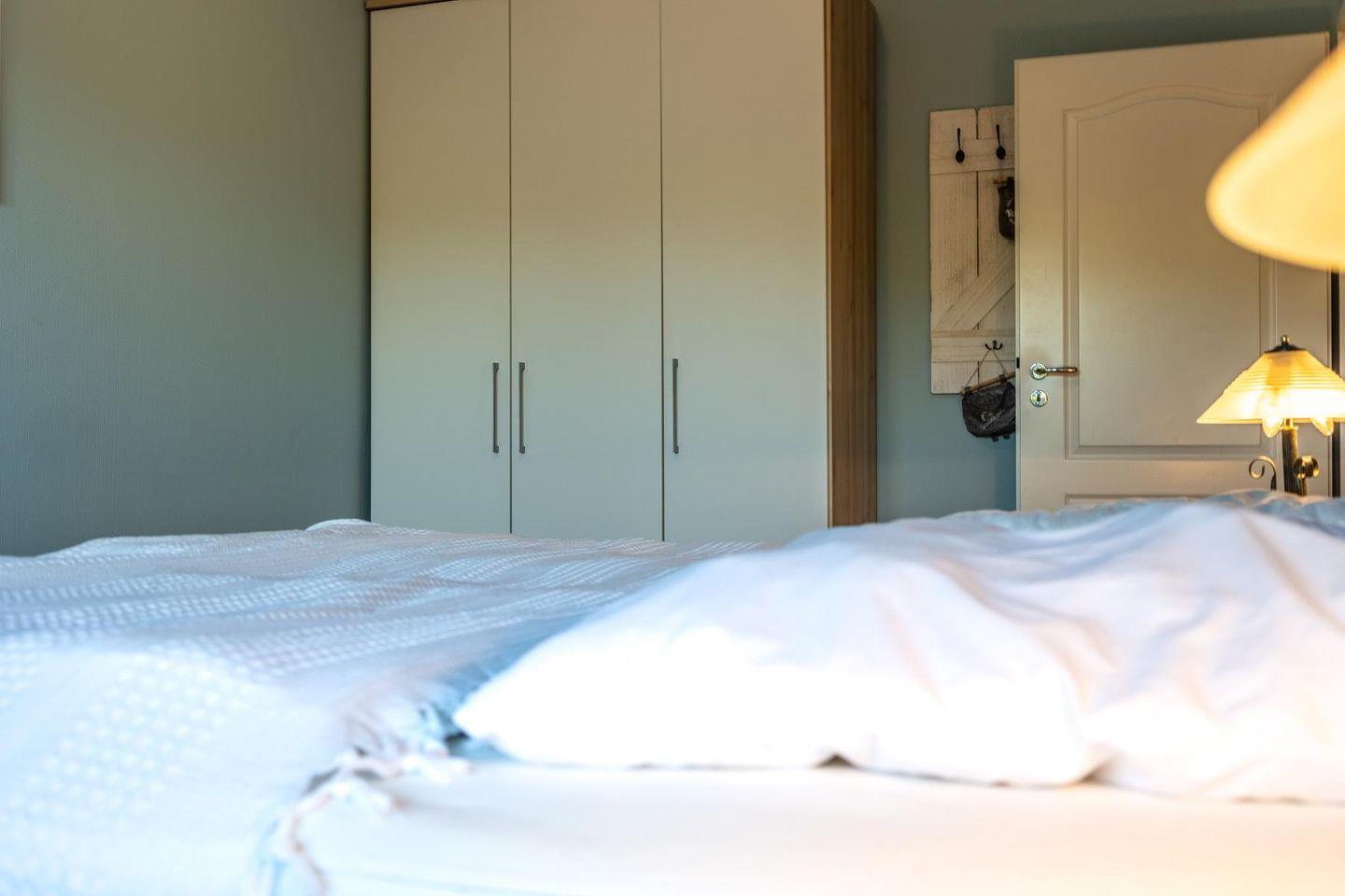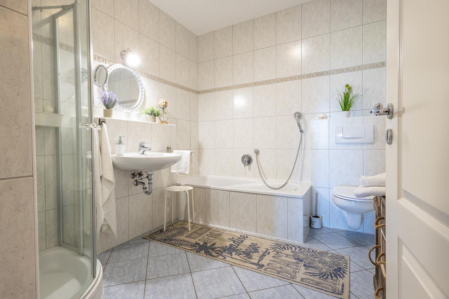 Zwei Schlafzimmer mit hochwertigen Boxspringbetten und jeweils eigenem Fernseher bieten dir und deinen Mitreisenden viel Ruhe und Komfort. Ein geräumiger Flur mit Garderobe führt ins Badezimmer. Es überzeugt mit Dusche, Badewanne und WC – gepflegt und einladend, genau richtig für den Start in den Tag oder ein warmes Bad zum Runterkommen.