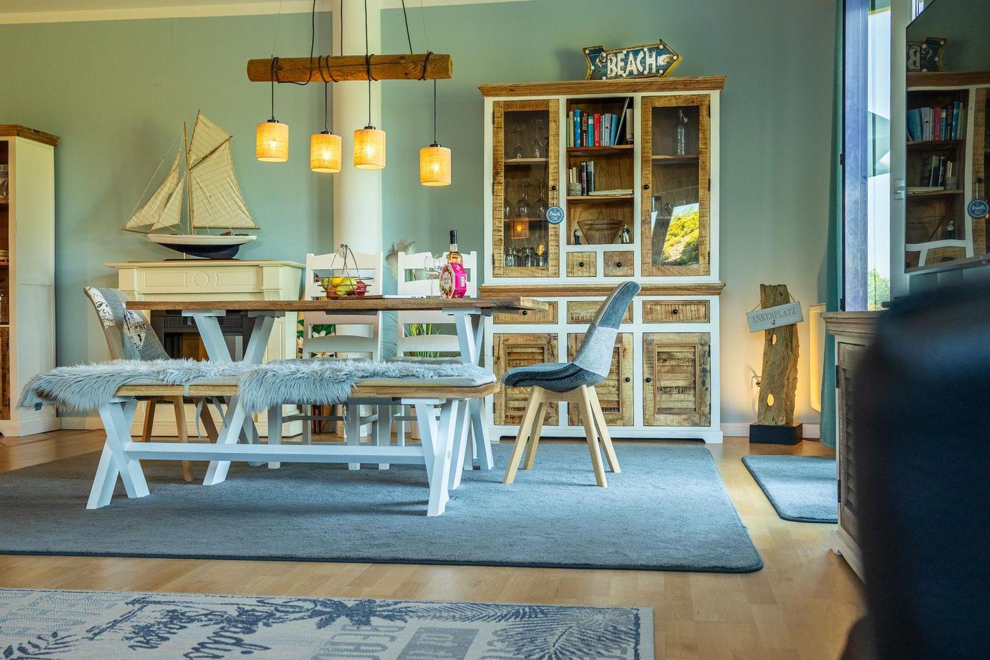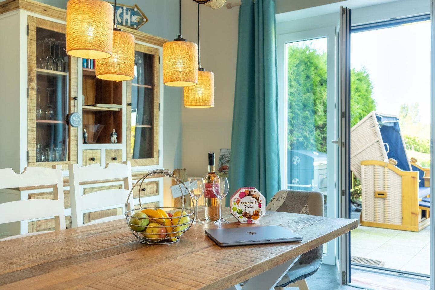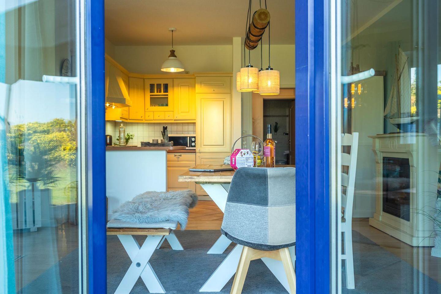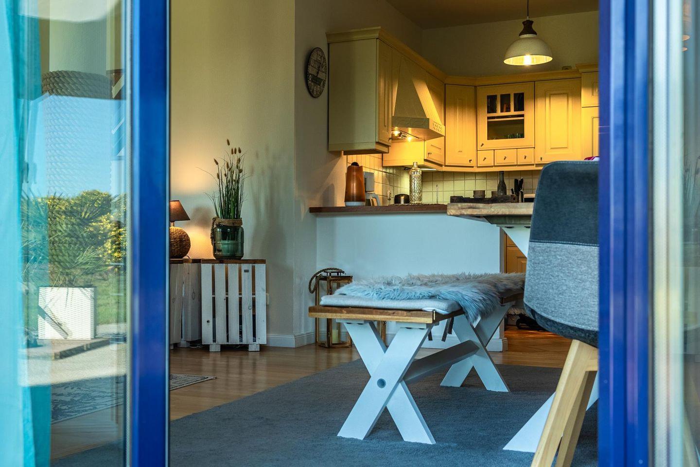 Das lichtdurchflutete Wohnzimmer lädt mit seiner gemütlichen Sitzgruppe, einem TV, einer Stereoanlage und einem DVD-Player zum Ausspannen ein. Hier kannst du es dir nach einem langen Strandspaziergang so richtig gemütlich machen. Die voll ausgestattete Küche bietet mit Geschirrspüler, Cerankochfeld, Backofen, Kühlschrank und einem praktischen Essplatz alles, was du brauchst – egal ob für den schnellen Snack oder das selbstgekochte Abendessen mit Meerblick.