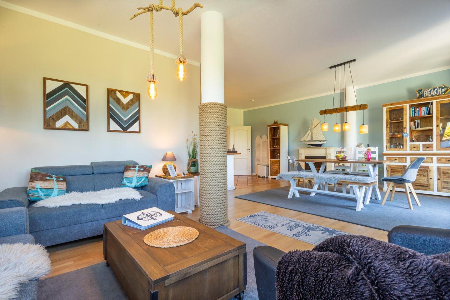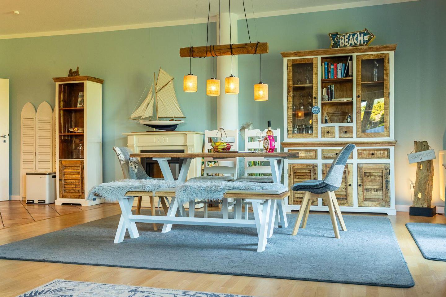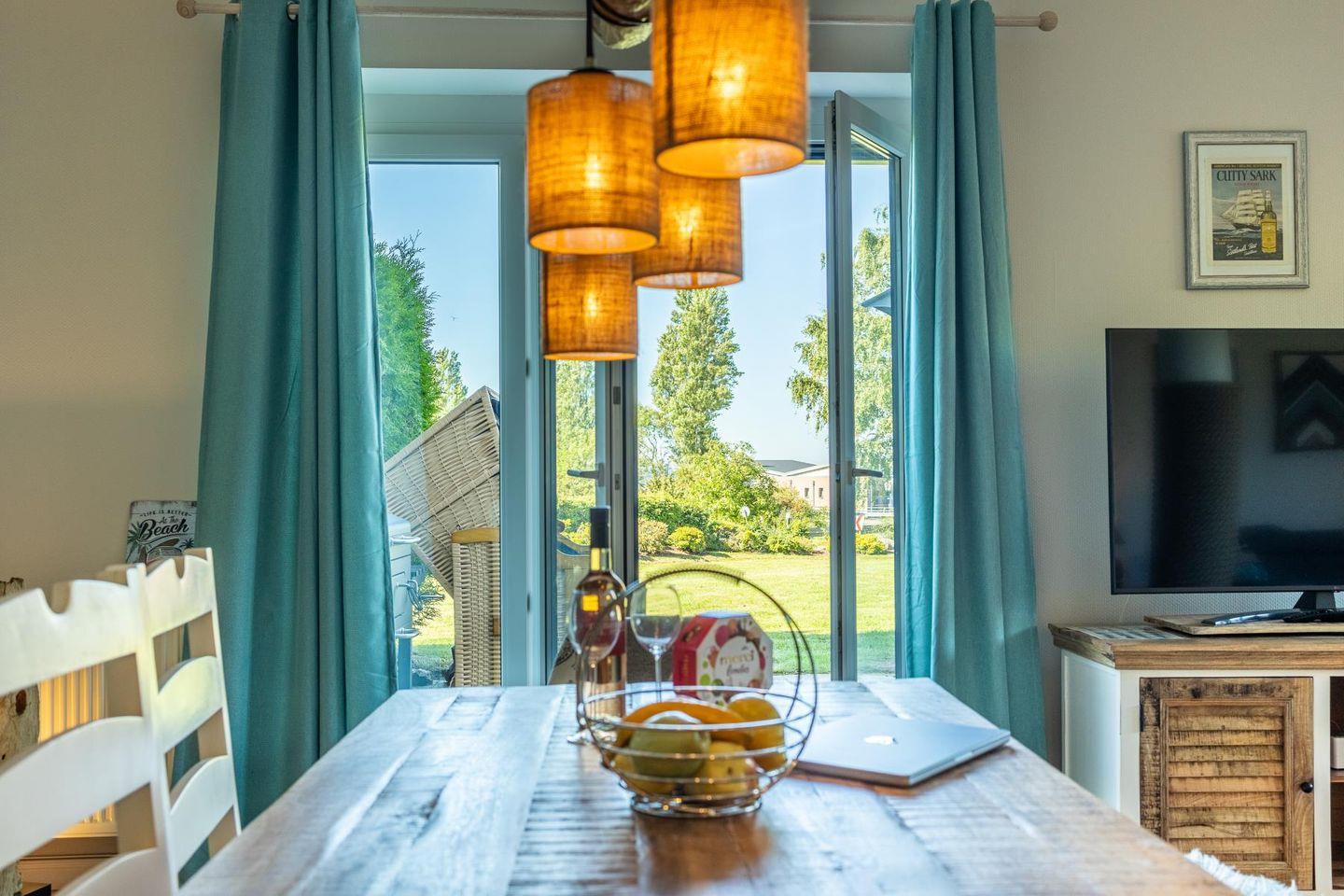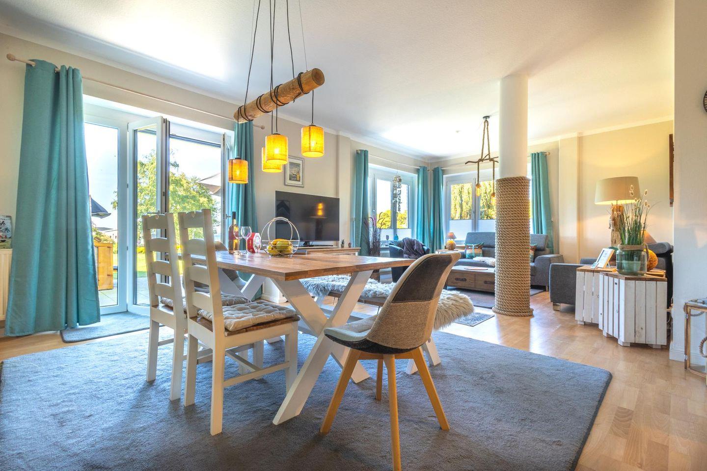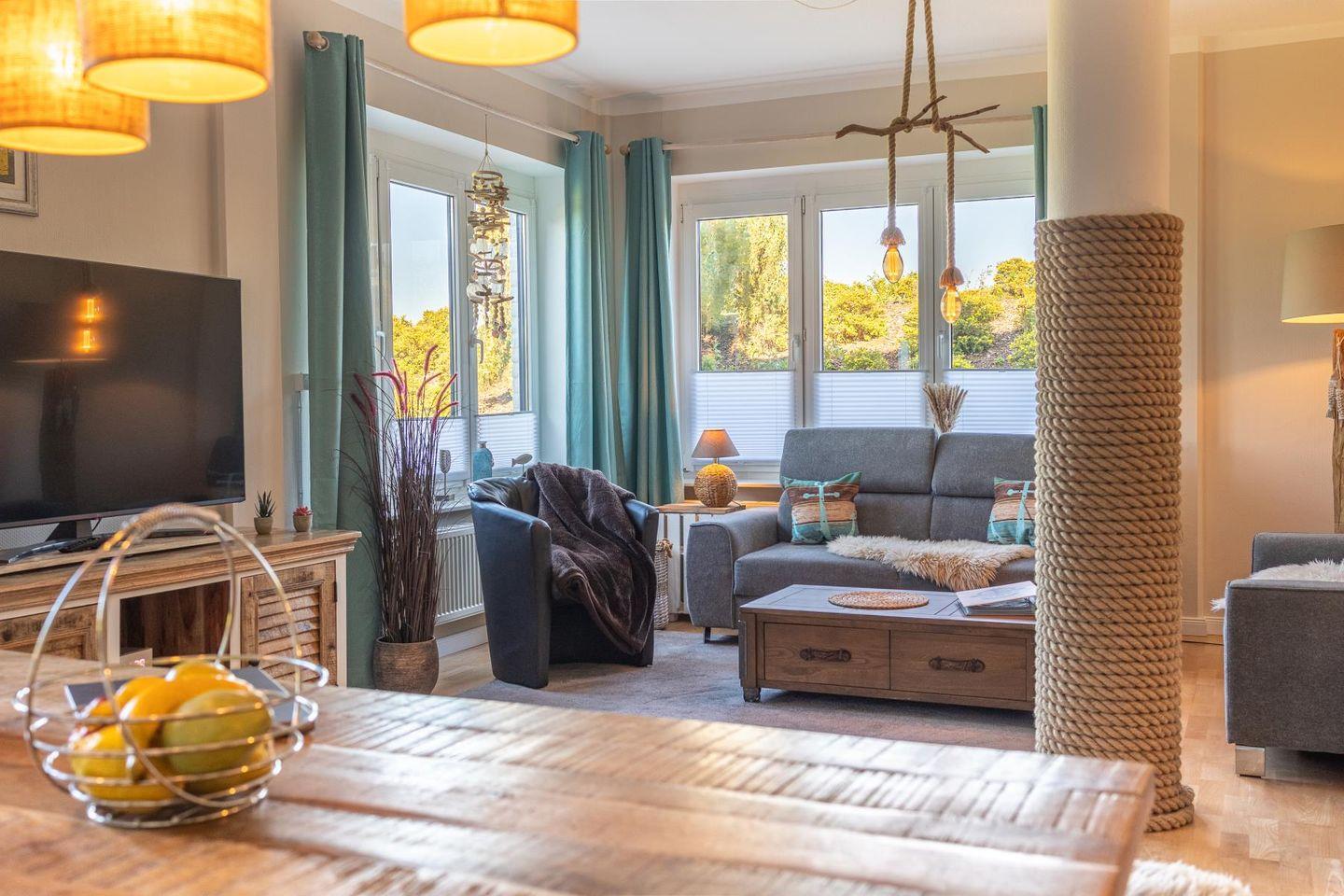 Das lichtdurchflutete Wohnzimmer lädt mit seiner gemütlichen Sitzgruppe, einem TV, einer Stereoanlage und einem DVD-Player zum Ausspannen ein. Hier kannst du es dir nach einem langen Strandspaziergang so richtig gemütlich machen. Die voll ausgestattete Küche bietet mit Geschirrspüler, Cerankochfeld, Backofen, Kühlschrank und einem praktischen Essplatz alles, was du brauchst – egal ob für den schnellen Snack oder das selbstgekochte Abendessen mit Meerblick.