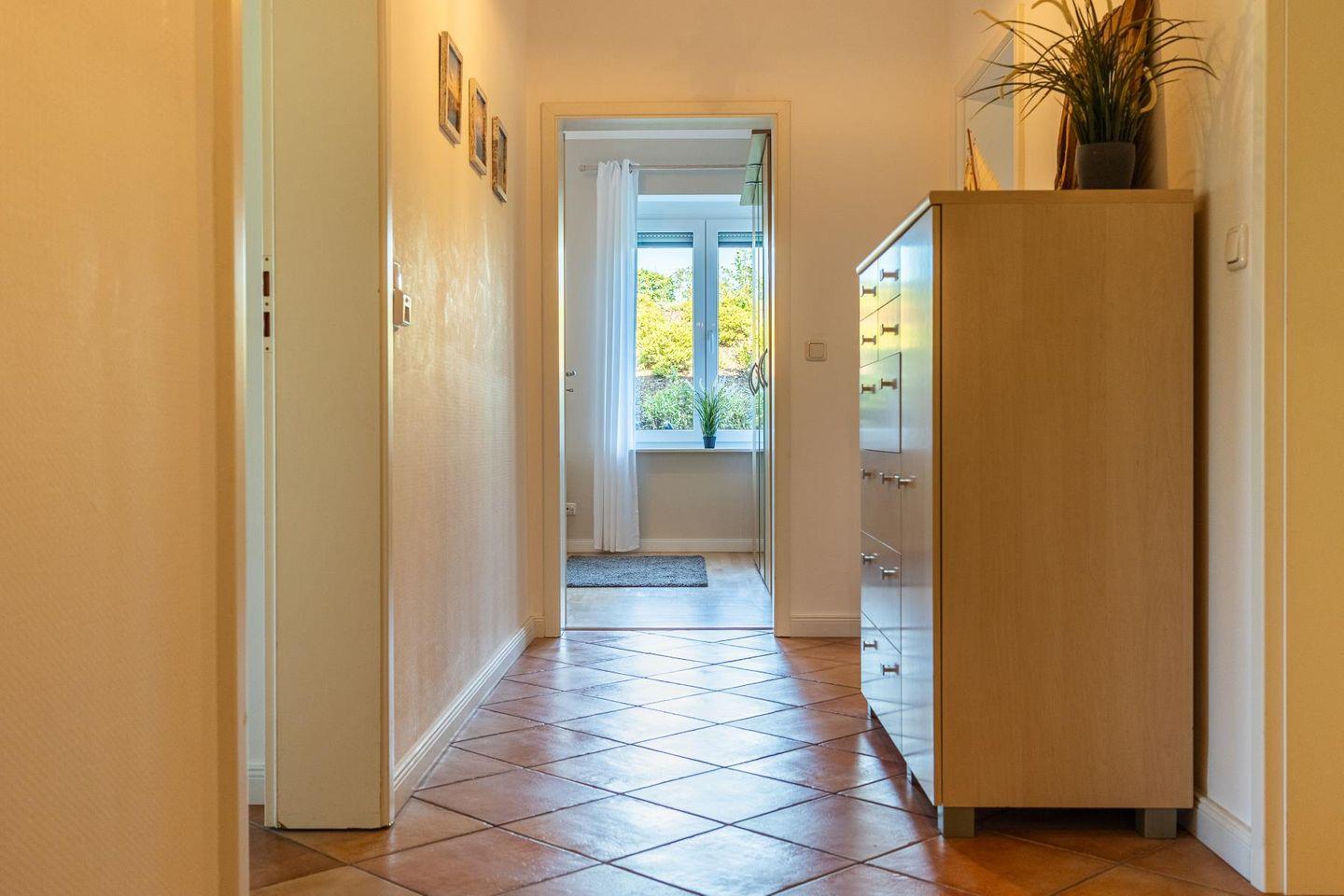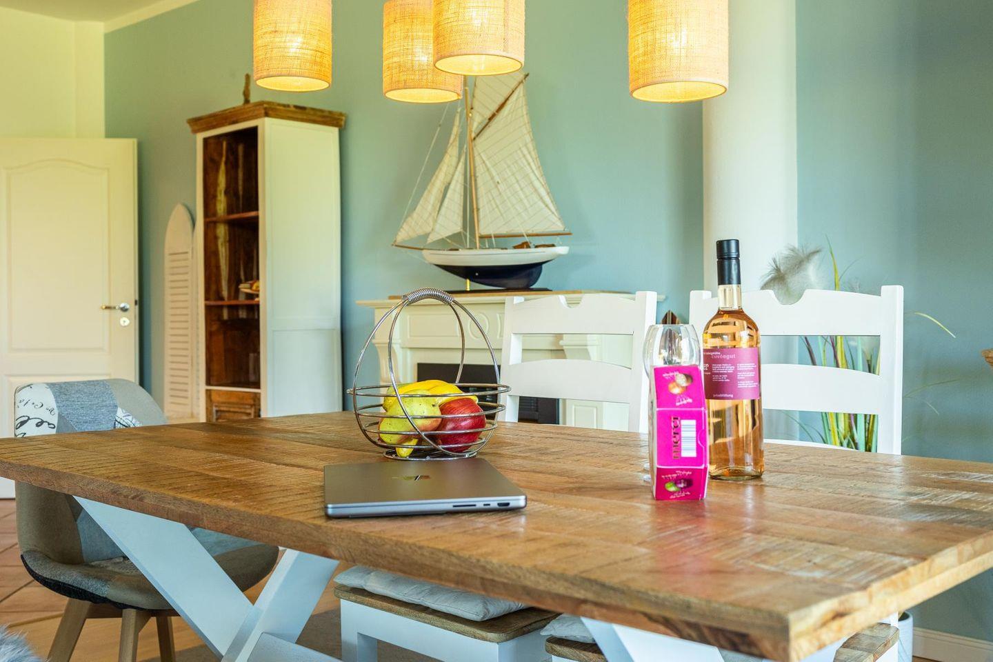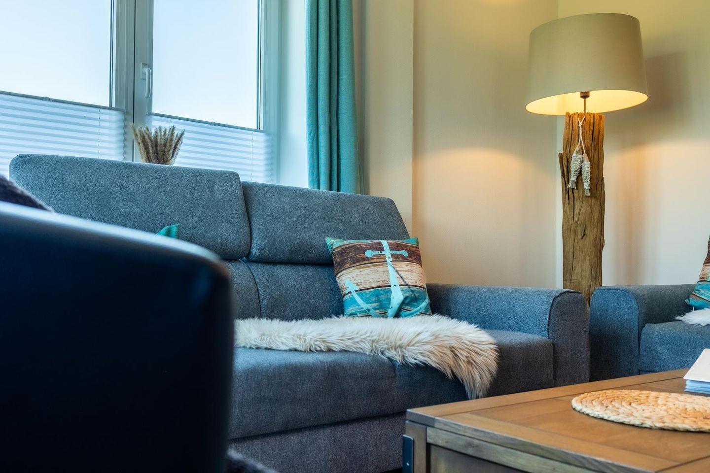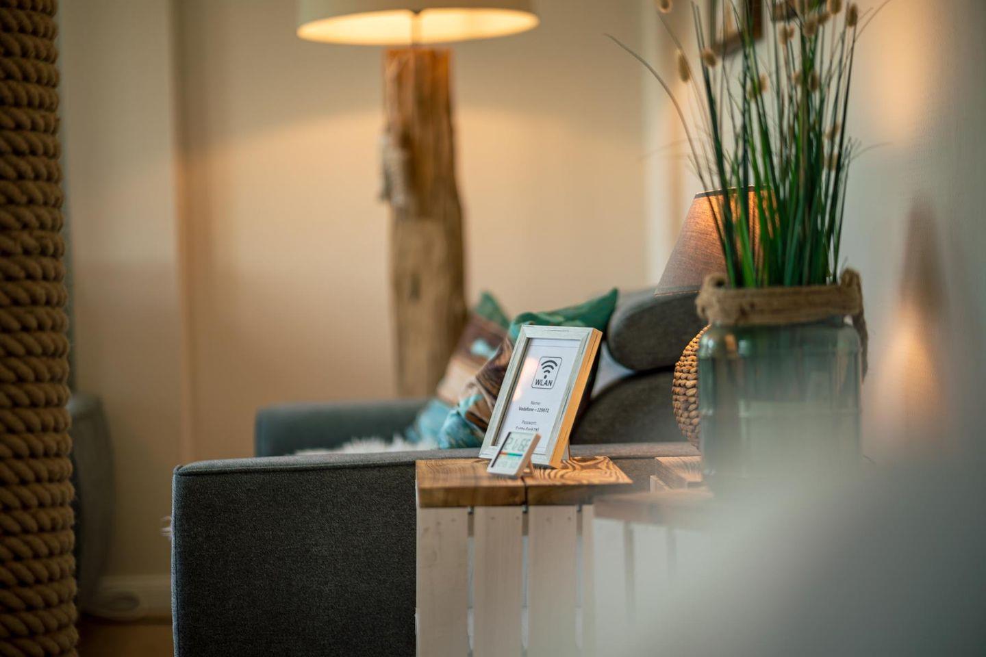 Das lichtdurchflutete Wohnzimmer lädt mit seiner gemütlichen Sitzgruppe, einem TV, einer Stereoanlage und einem DVD-Player zum Ausspannen ein. Hier kannst du es dir nach einem langen Strandspaziergang so richtig gemütlich machen. Die voll ausgestattete Küche bietet mit Geschirrspüler, Cerankochfeld, Backofen, Kühlschrank und einem praktischen Essplatz alles, was du brauchst – egal ob für den schnellen Snack oder das selbstgekochte Abendessen mit Meerblick.