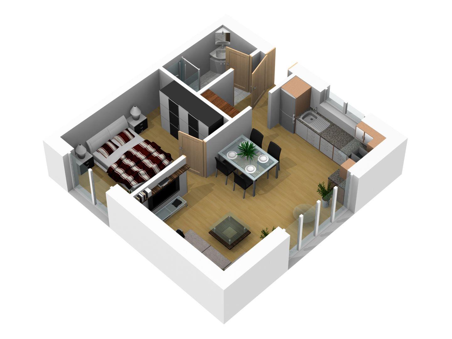 Das Schlafzimmer ist mit Bettdecken und Kopfkissen, einem Doppelbett, einer Schrank-/Regalwand und einem Full HD Smart-TV ausgestattet.