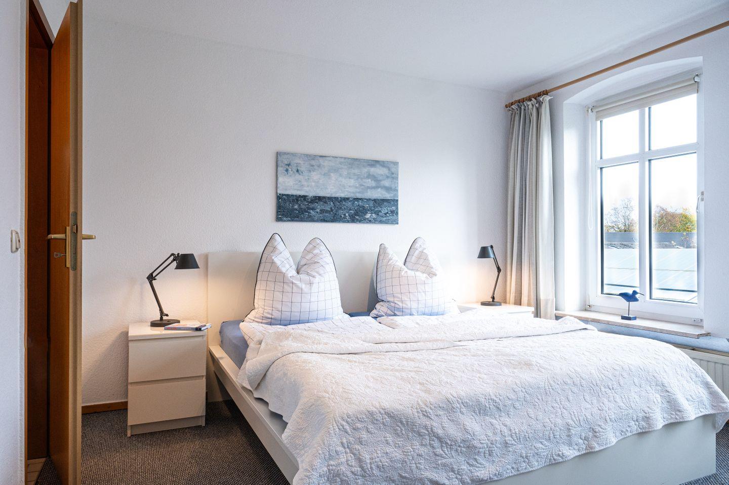 Das **Schlafzimmer** mit großem Doppelbett (180 × 200 cm) verspricht erholsame Nächte – ideal, um neue Energie für Deine Ausflüge in die Probstei und an die Ostsee zu tanken.