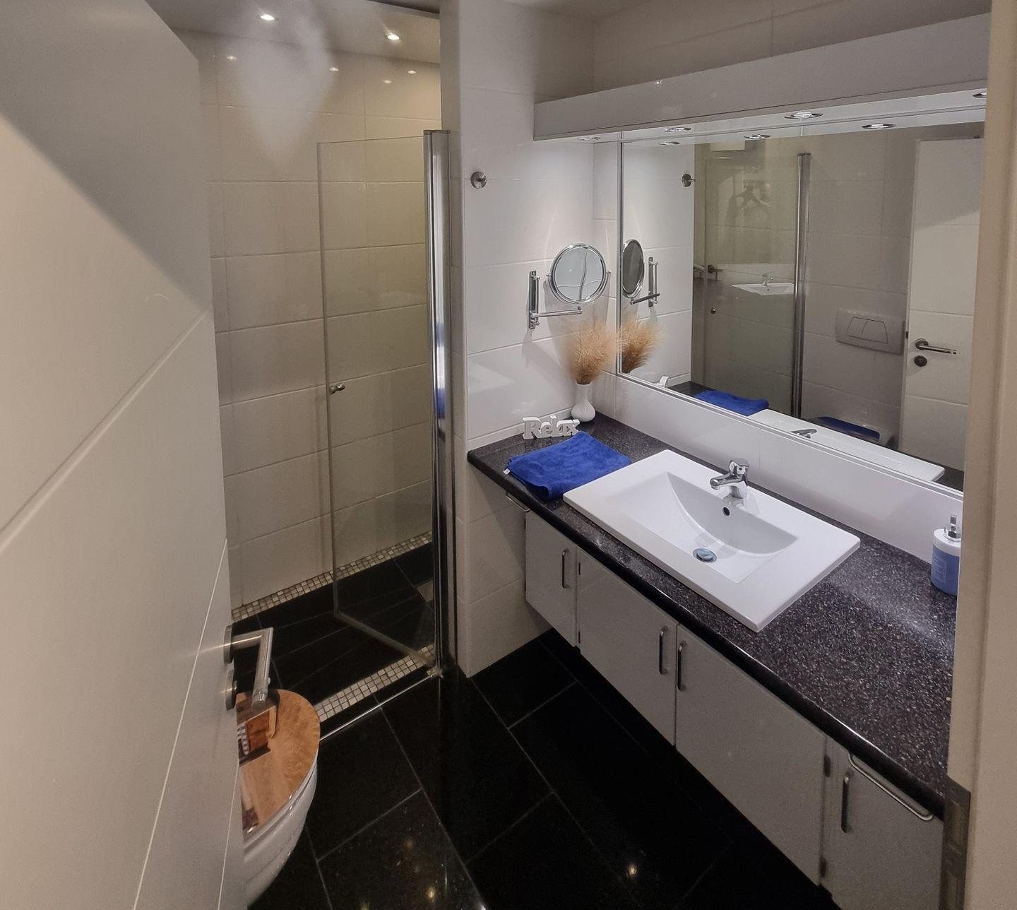 Das Badezimmer ist funktional gestaltet und verfügt über eine bodengleiche Dusche, WC, Waschbecken, Spiegel, Kosmetikspiegel und Haartrockner. Warmes Wasser ist jederzeit verfügbar.