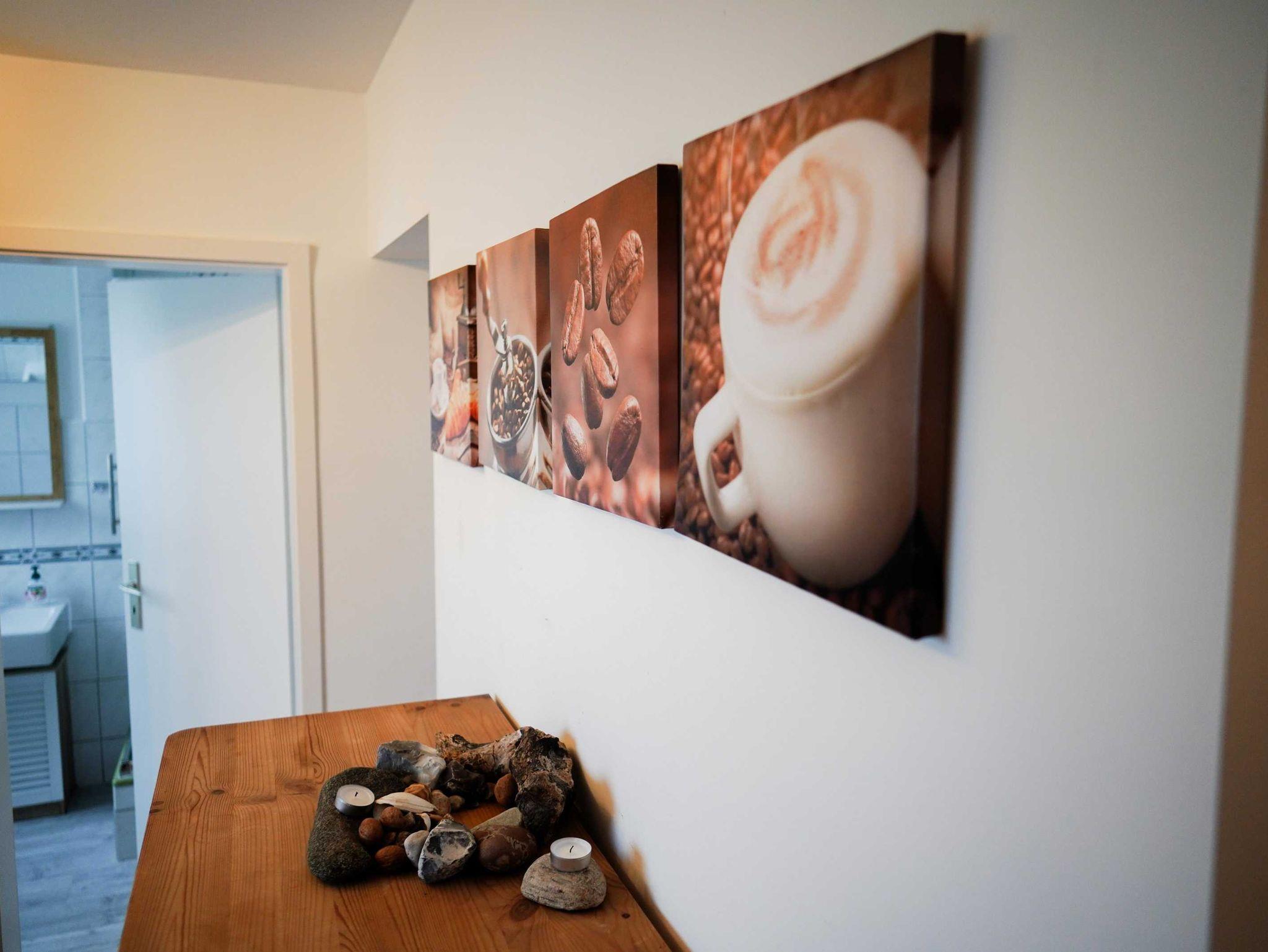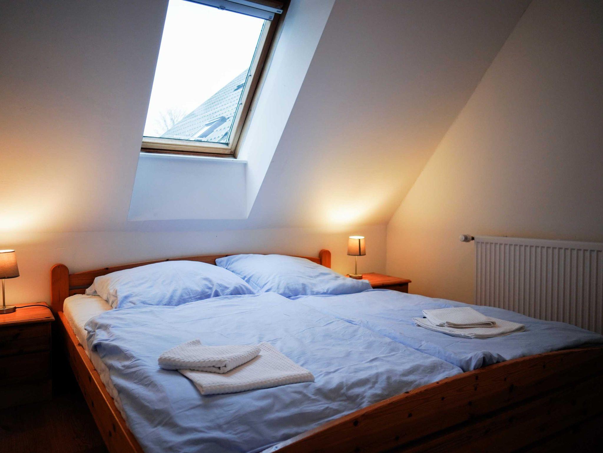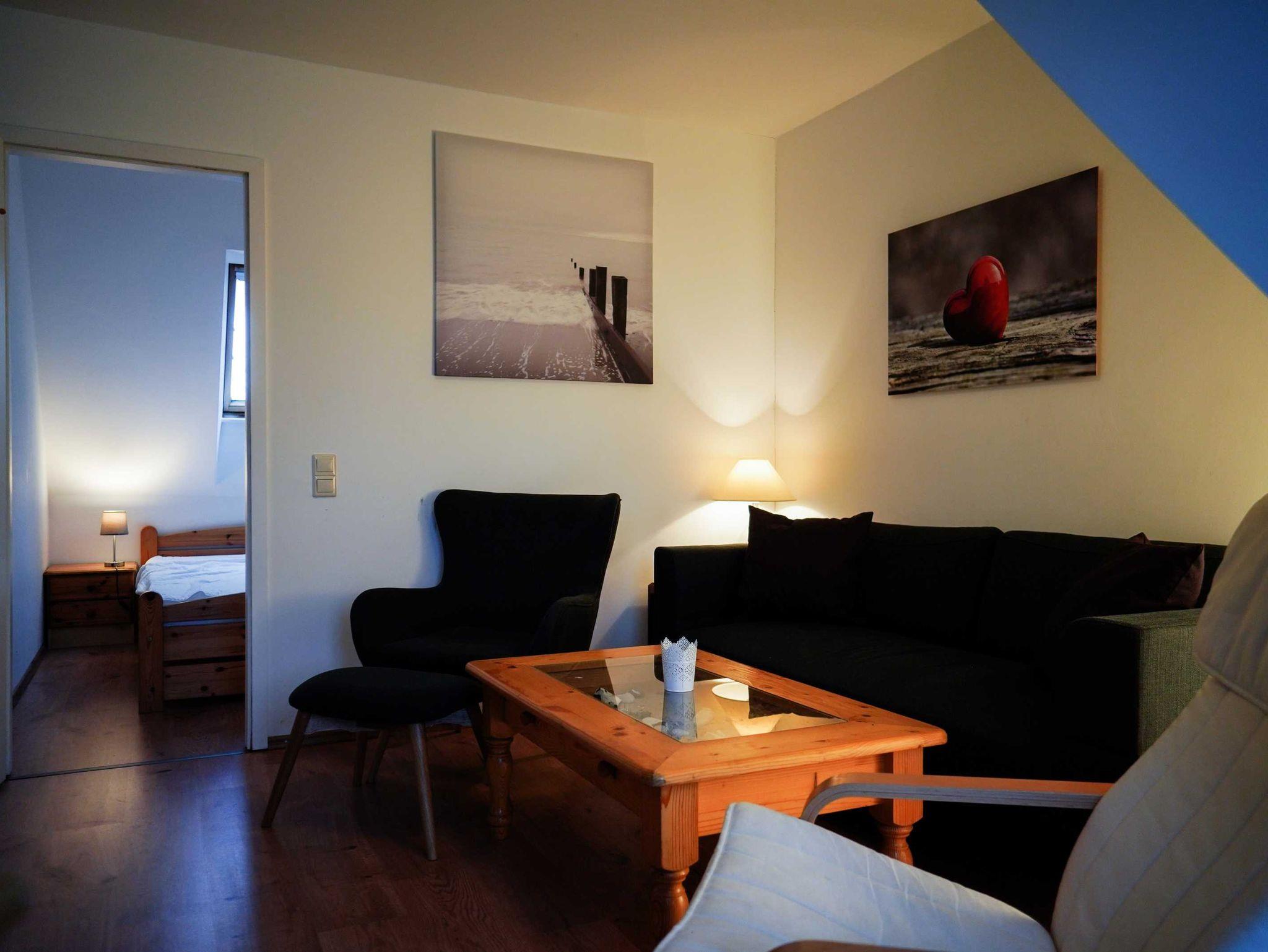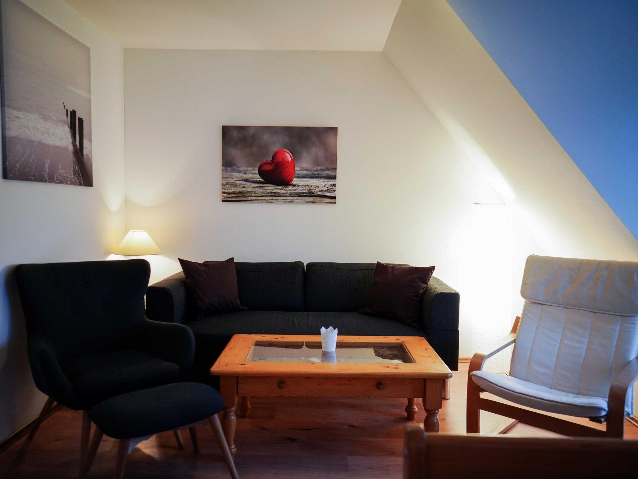Die 58 qm große Ferienwohnung Kutscherstube liegt in der 1. Etage und hat einen offenen Wohnbereich mit integrierten Dachschrägen und angrenzendem Balkon. Den bis zu 5 Personen stehen ein Wohnraum mit offener Küche, ein Bad mit Dusche und WC sowie drei Schlafzimmer zur Verfügung (1x mit Doppelbett, 1x mit Etagenbett, 1x Einzelbett).