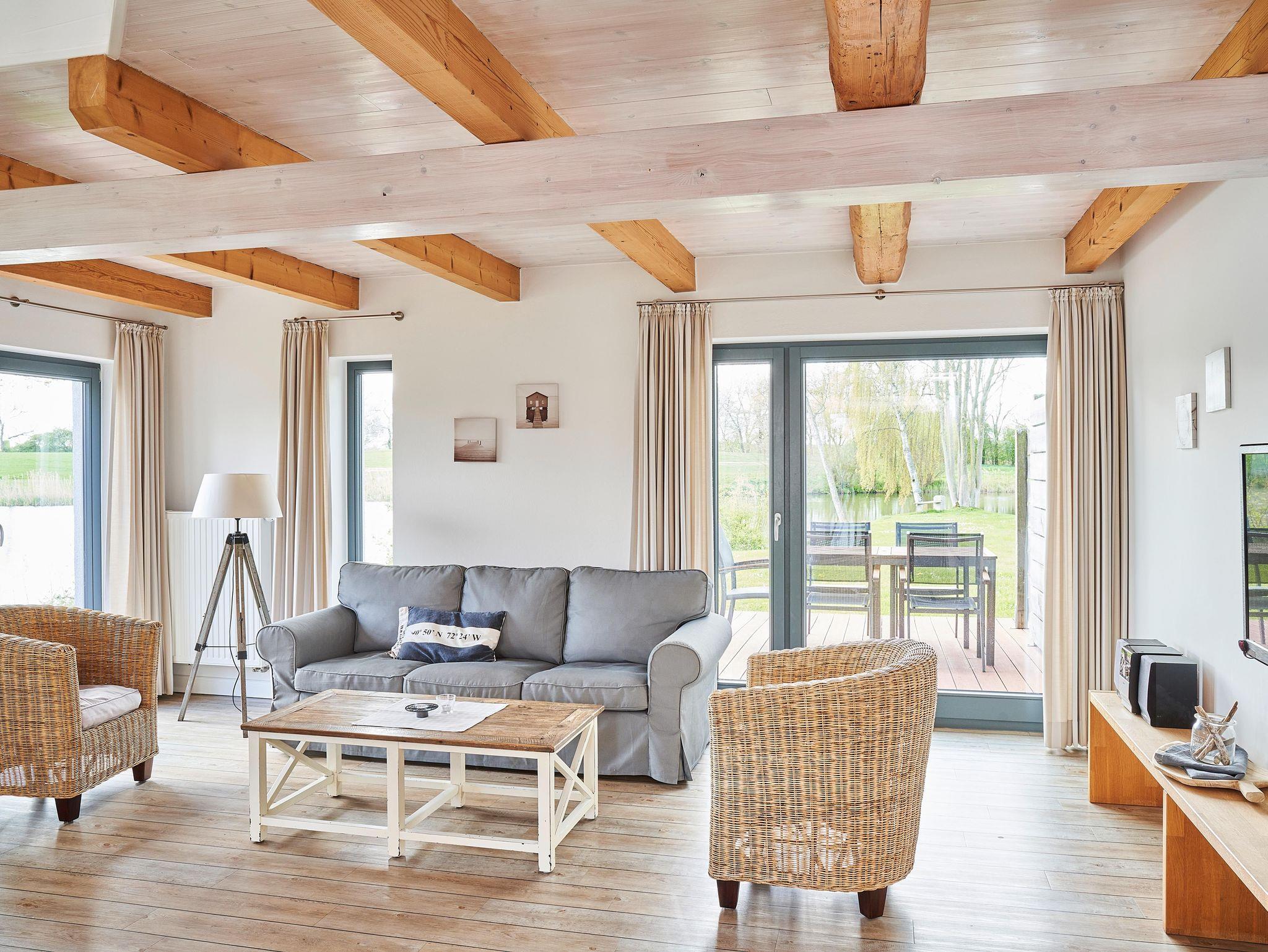 • Wohn- und Essbereich mit offener Küche und anliegender Terrasse in Südrichtung mit Blick auf den Mühlenteich