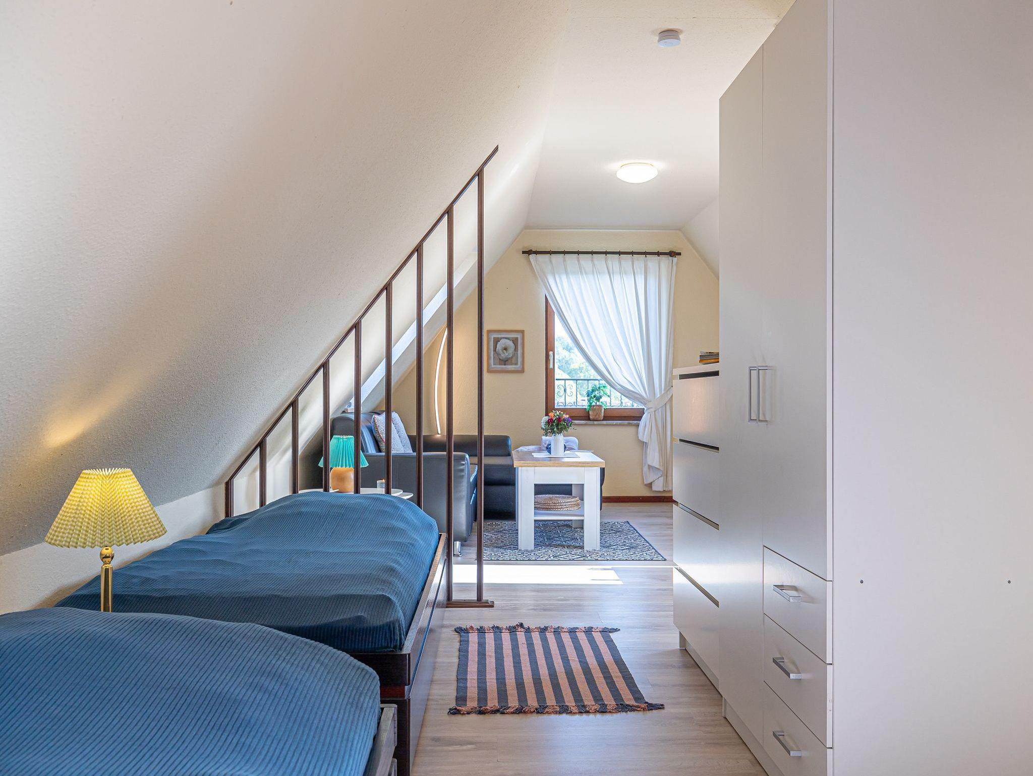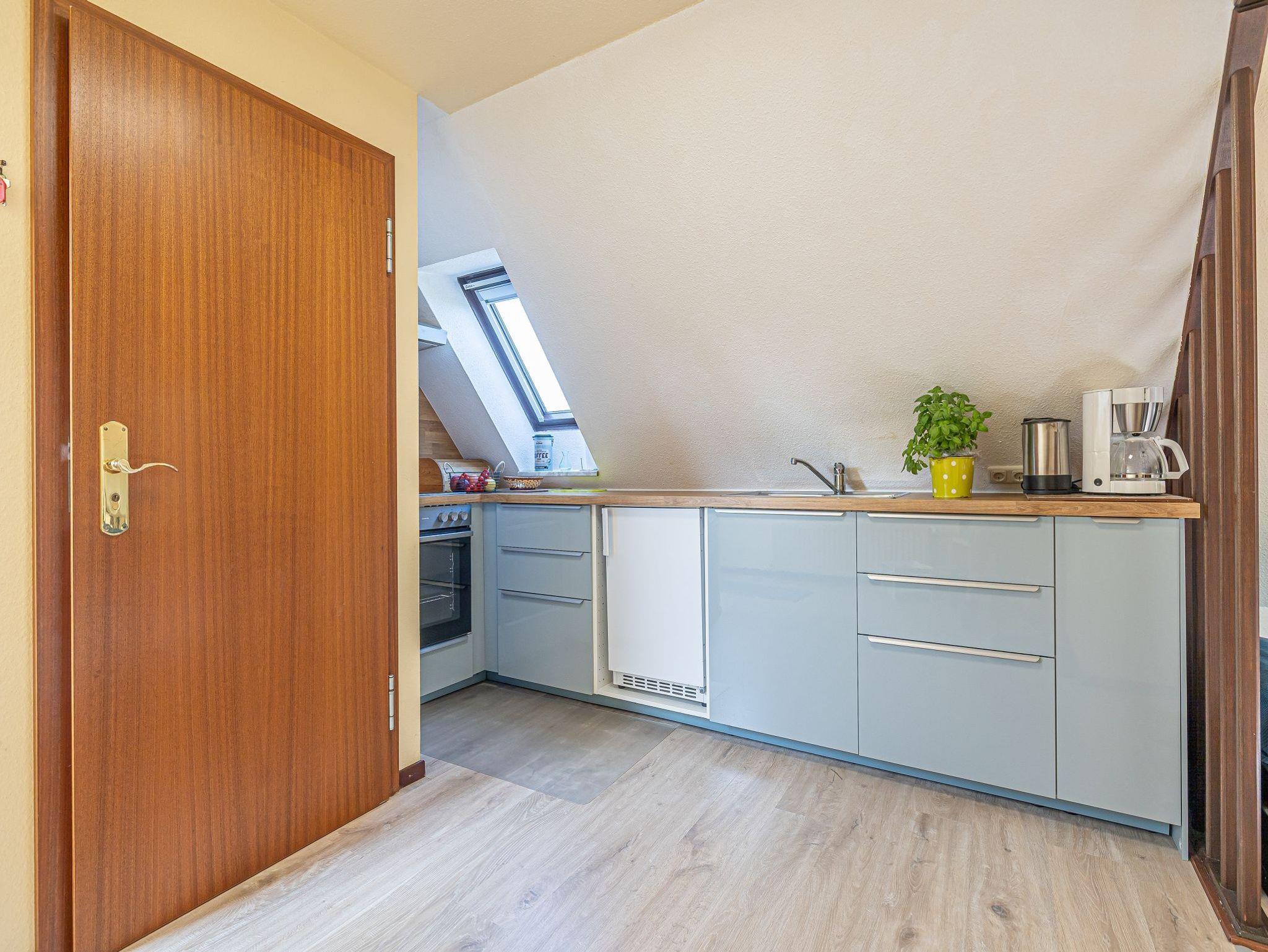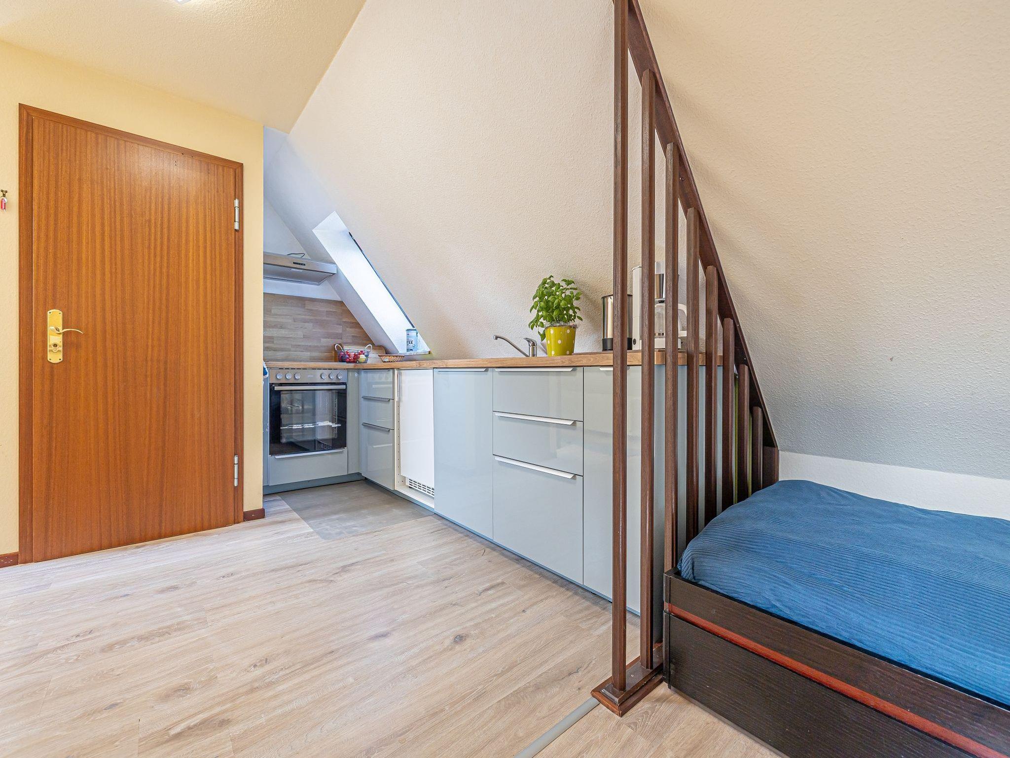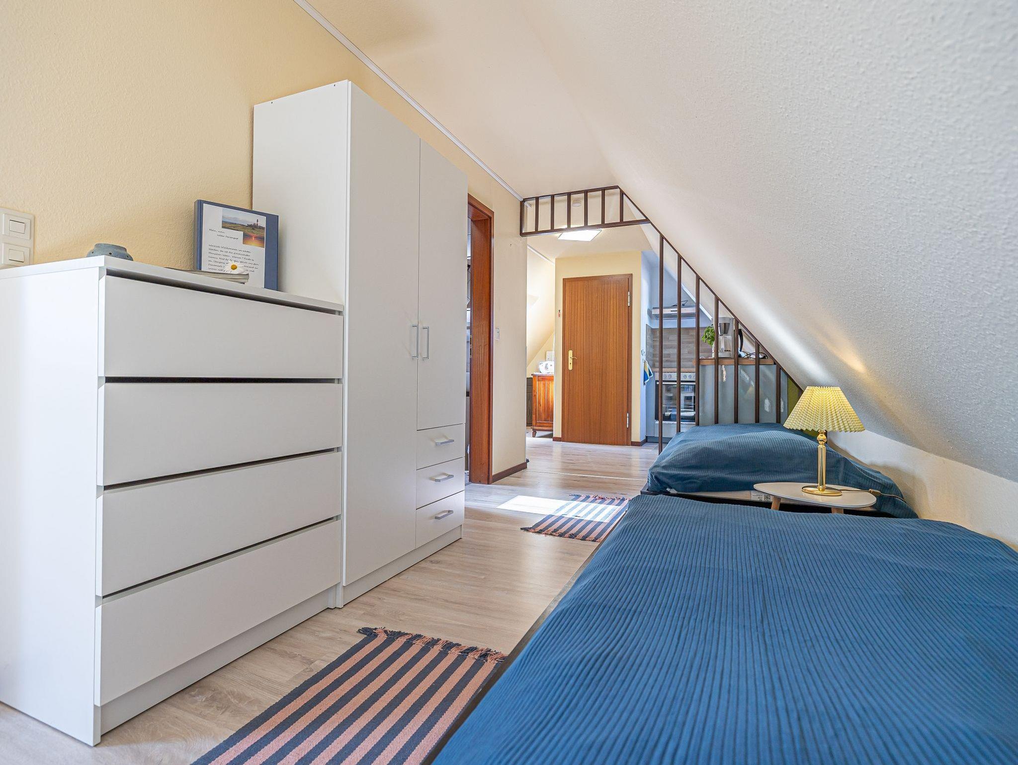 Die kleine helle Wohnung Seestern ist ganz oben im Haus und über eine breite Treppe erreichbar. Gleich beim Betreten sehen Sie rechts einen Essplatz und dahinter steht ein Schreibtisch in einer ruhigen Ecke. Links ist die offene Küche mit Herd und Backofen, Mikrowelle und den anderen üblichen Küchengeräten. Nacheinander stehen zwei Einzelbetten, gegenüber ist die Dusche und WC in einem separaten Raum. Am Ende der Wohnung wird der Raum größer und wenn Sie aus dem Fenster schauen, dann sehen Sie das Meer. Hier befindet sich eine große Couch, die sich auch ausziehen lässt und als zusätzliche Schlafmöglichkeit benutzt werden kann sowie das TV-Gerät. Mit den 5 kleinen Fenstern ist die Wohnung sehr hell und freundlich. Sie ist, außer im Bad, mit Teppich ausgelegt.