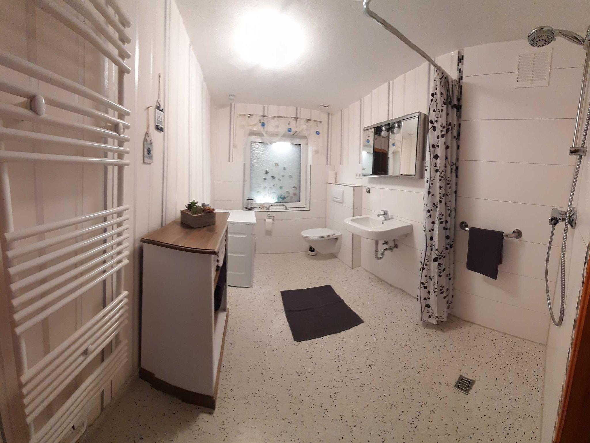 • rollstuhlfreundliches Badezimmer mit bodengleicher Dusche, Waschmaschine und Fußbodenheizung; Handtücher zubuchbar