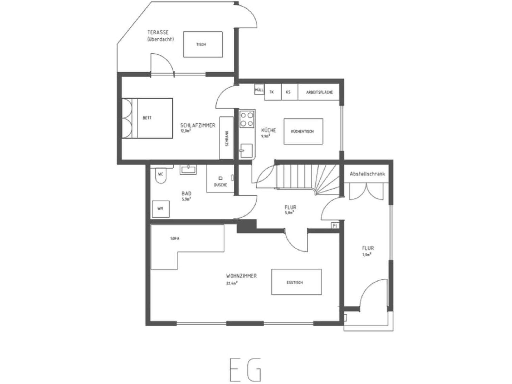 • Schlafzimmer mit Doppelbett (140 x 200); Fußbodenheizung; Bettwäsche zubuchbar; überdachte Terrasse anliegend