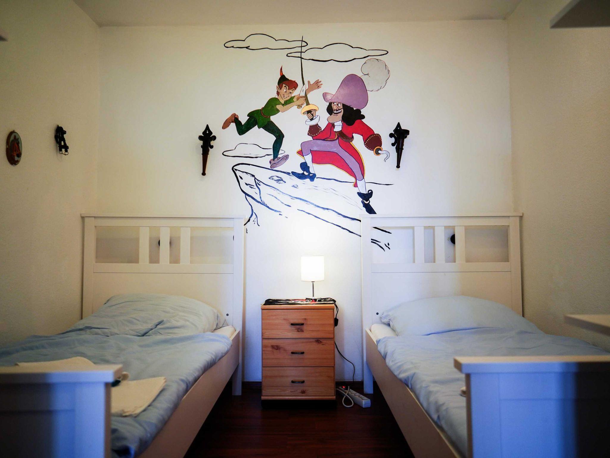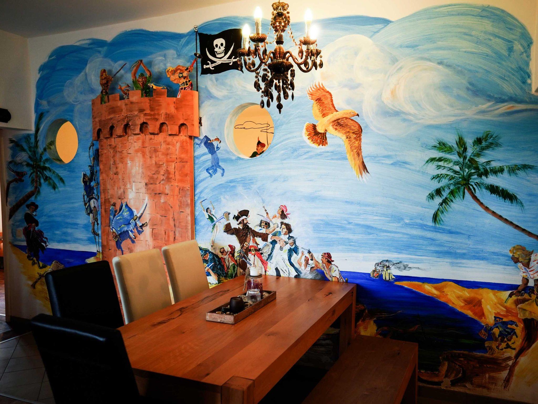 In der schönen 63 qm großen Ferienwohnung Piraten (für 6 Personen geeignet) fällt der erste Blick sofort auf das große Piratengemälde. Hinter der „beweglichen“ Wand verbirgt sich das eine der beiden Kinderzimmer mit 2 Einzelbetten. Das Elternschlafzimmer verfügt über ein Doppelbett, das dritte Schlafzimmer bietet ebenfalls 2 Einzelbetten. Von der Terrasse blickt man direkt auf den Reitplatz.