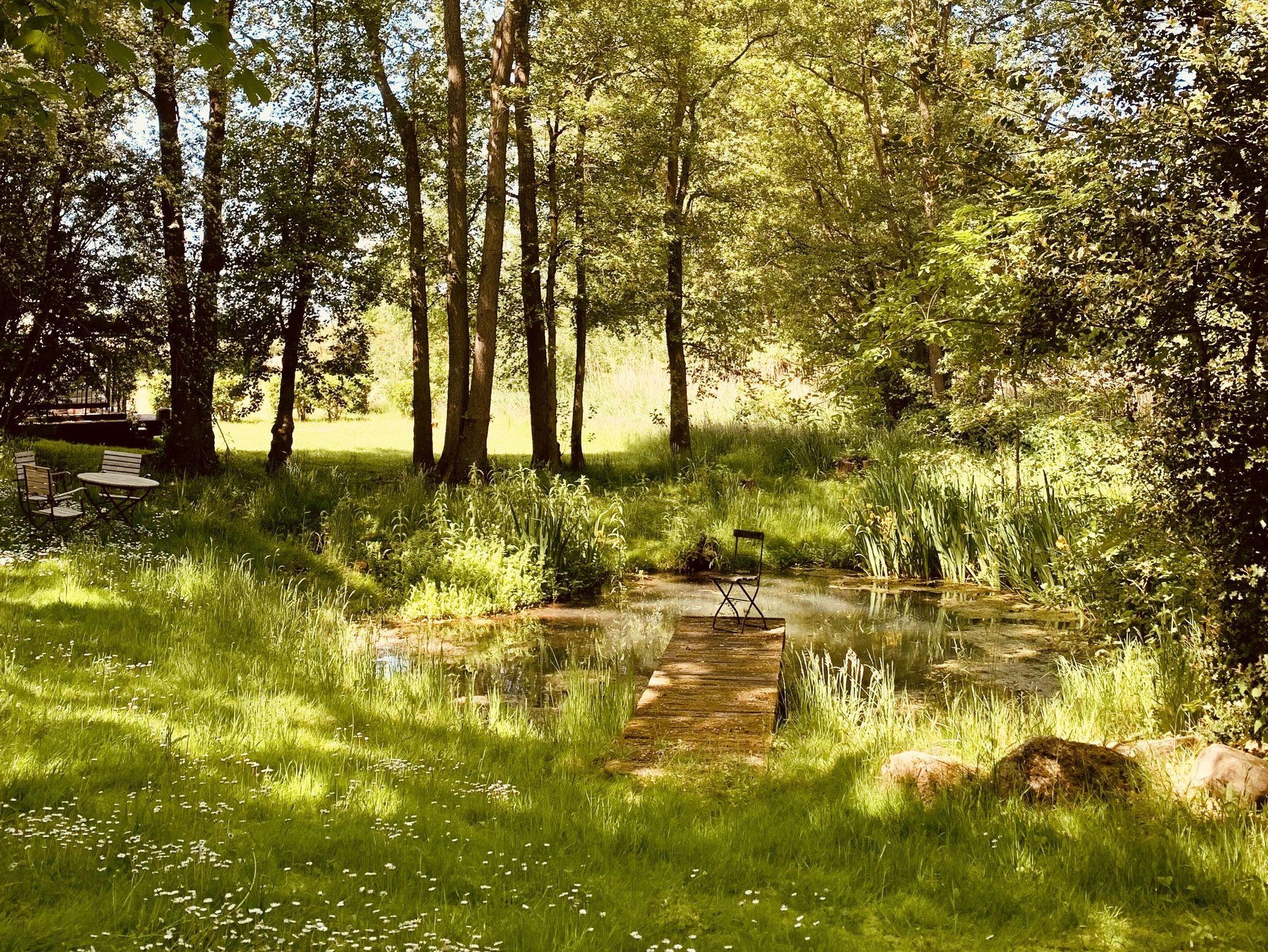 Das parkähnliche Grundstück mit Teichen, alten Bäumen und einer Streuobstwiese lädt zum Verweilen und Entspannen ein. Hier warten Sitzecken und Liegestühle auf Besucher.